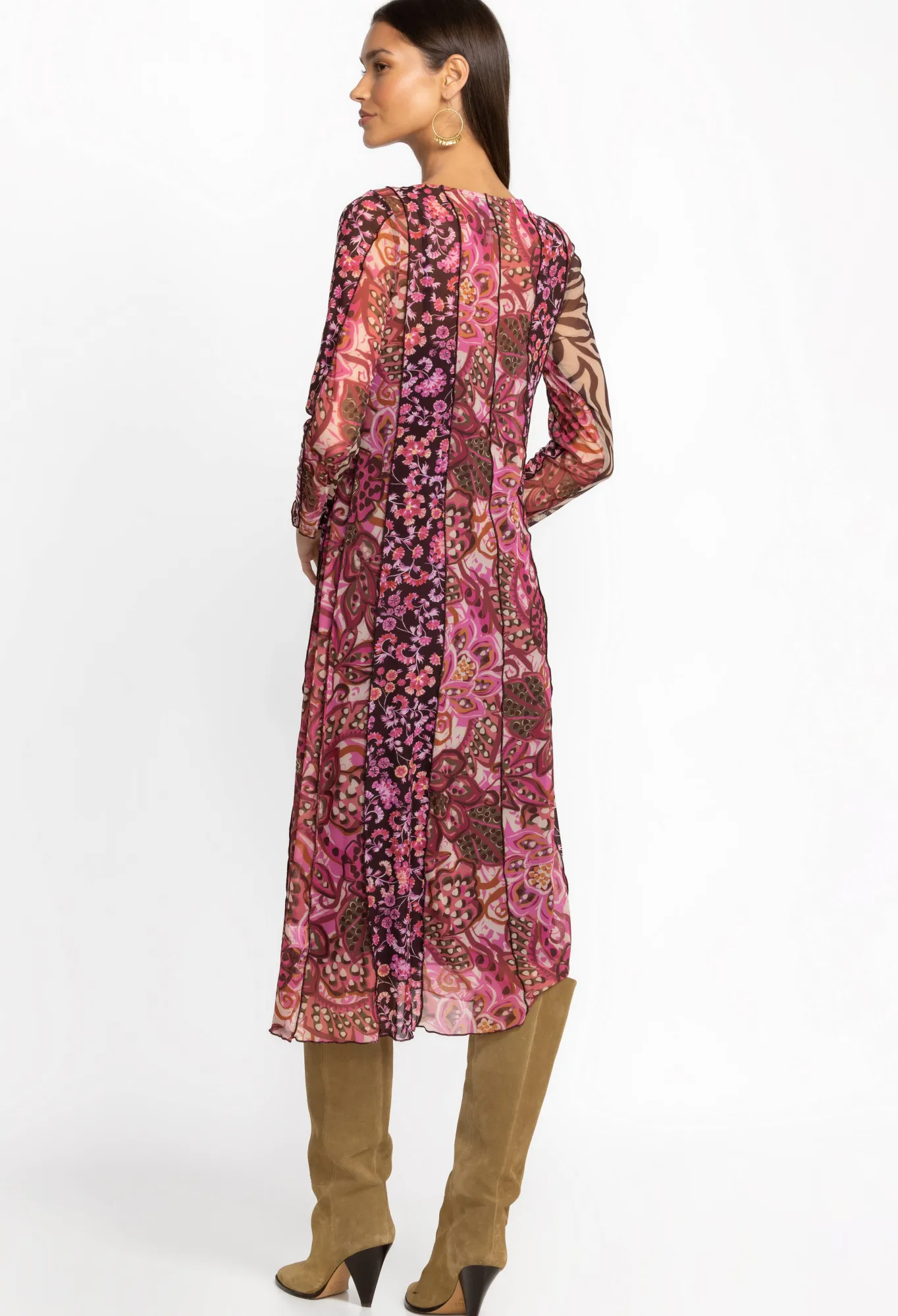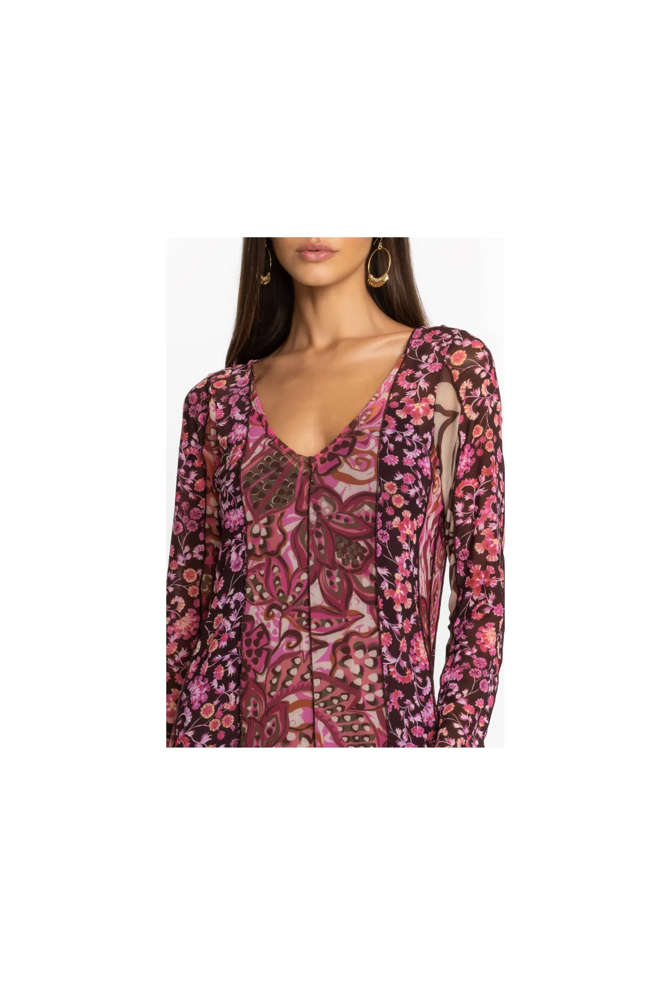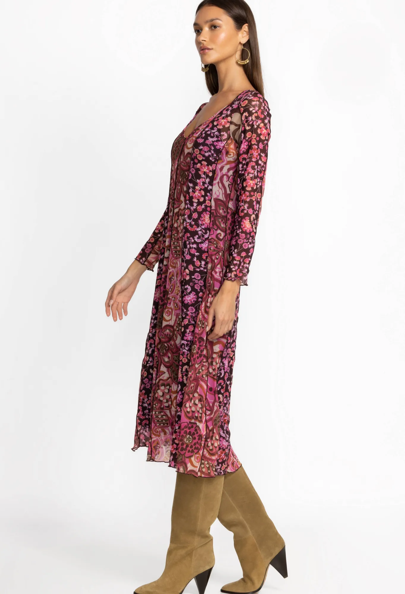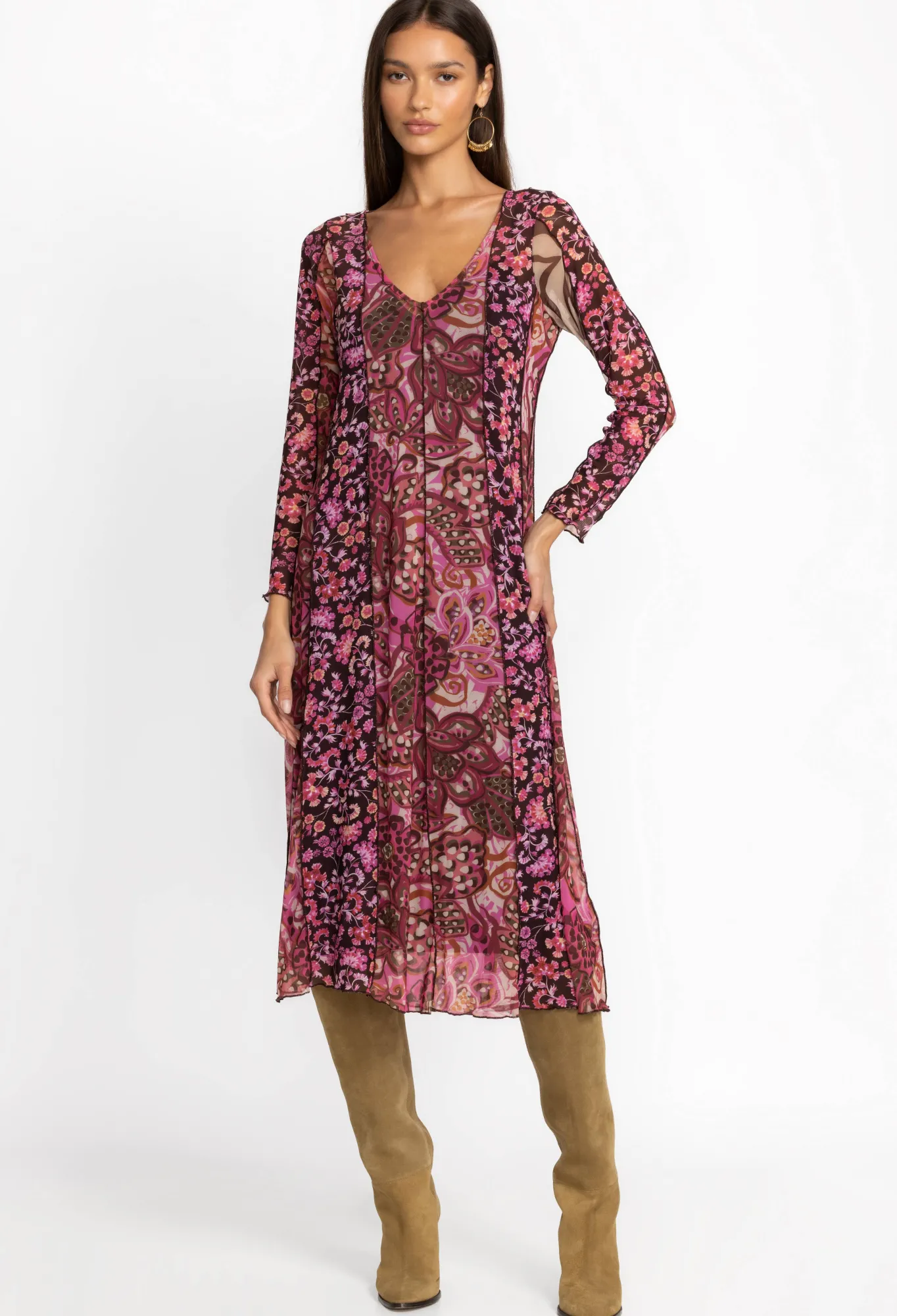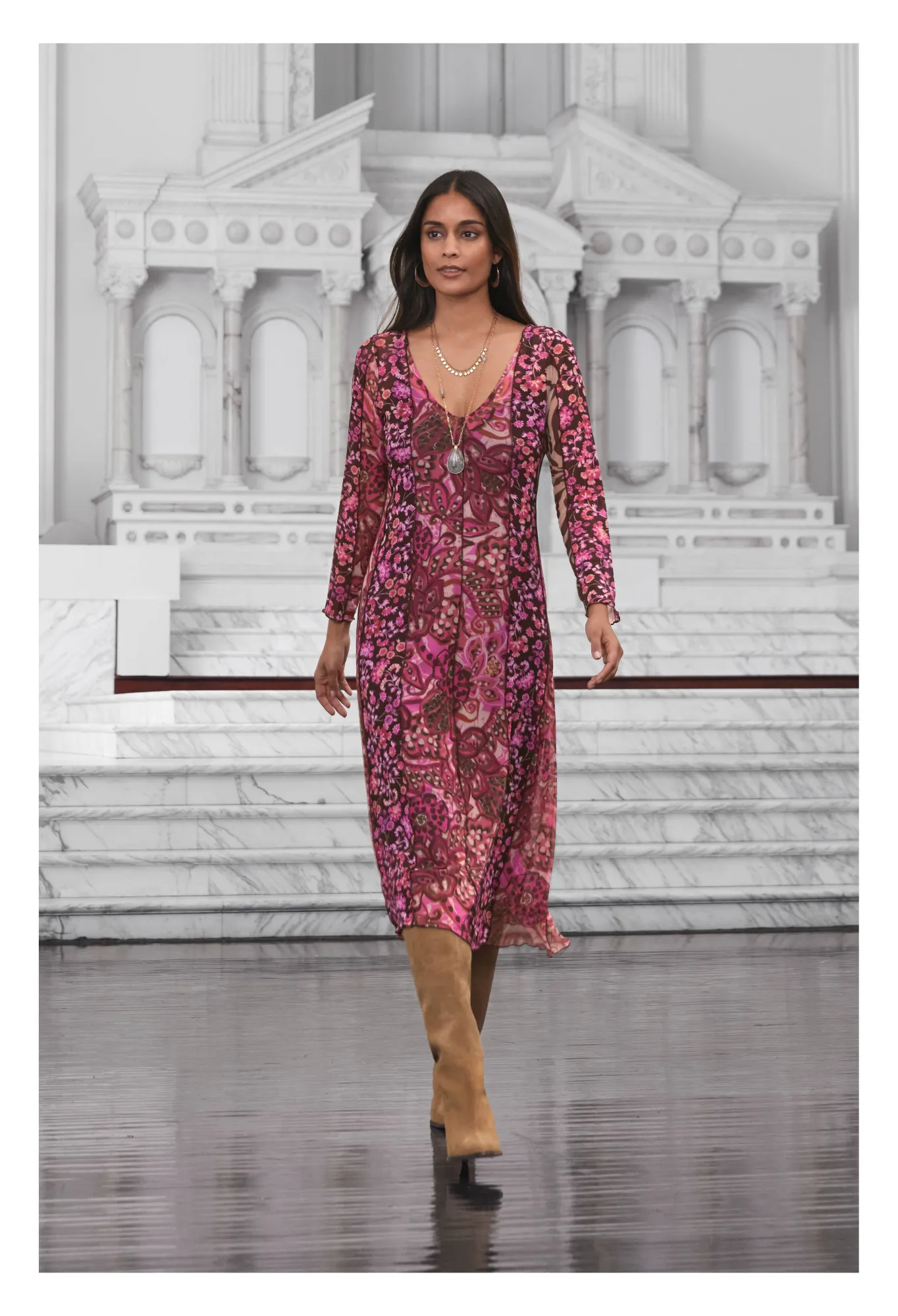 Underpinned With A Femme Feel, The Agatha Mesh Midi Dress Plays With Color And Construction. Falling To A Midi Length, This Stretch Mesh Dress Features A V-Neck, Long Sleeves, A Paneled Construction, And A Striking Pattern In Pink And Red Shades. Style This Dress With A Low Heel And A Clutch For A Fashion-Forward Occasion Ensemble.
