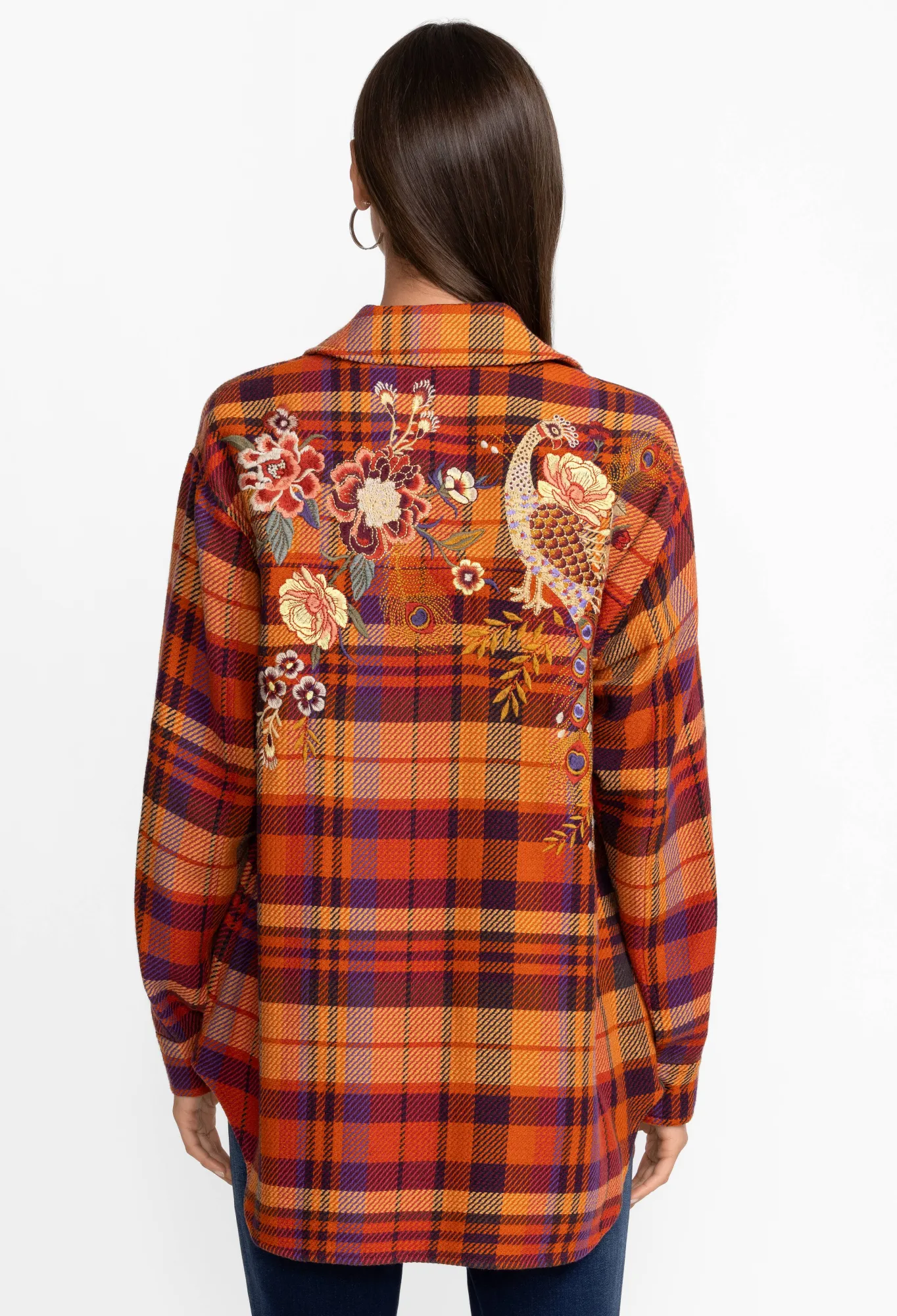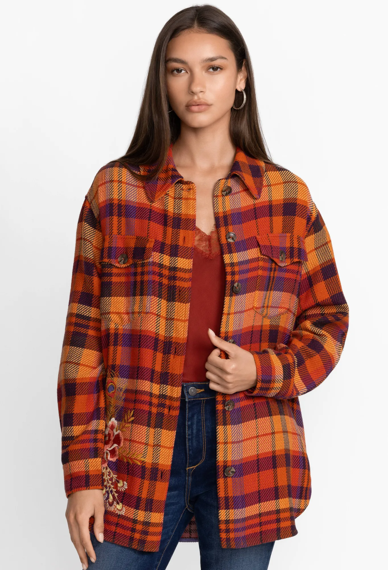 Crafted From A Breathable Cotton Blend, The Ananke Shirt Jacket Breathes New Life Into Classic Checks. A Statement Style For Cooler Days, This Shirt Jacket Features A Collar, Long Sleeves, A Front Button Closure, A Chest Pocket, Side Pockets, A Check Print, And A Lively Floral Placement Embroidery. Style This Shirt Jacket With A Dress On Brighter Days Or Layer Under A Coat When The Temperature Drops.