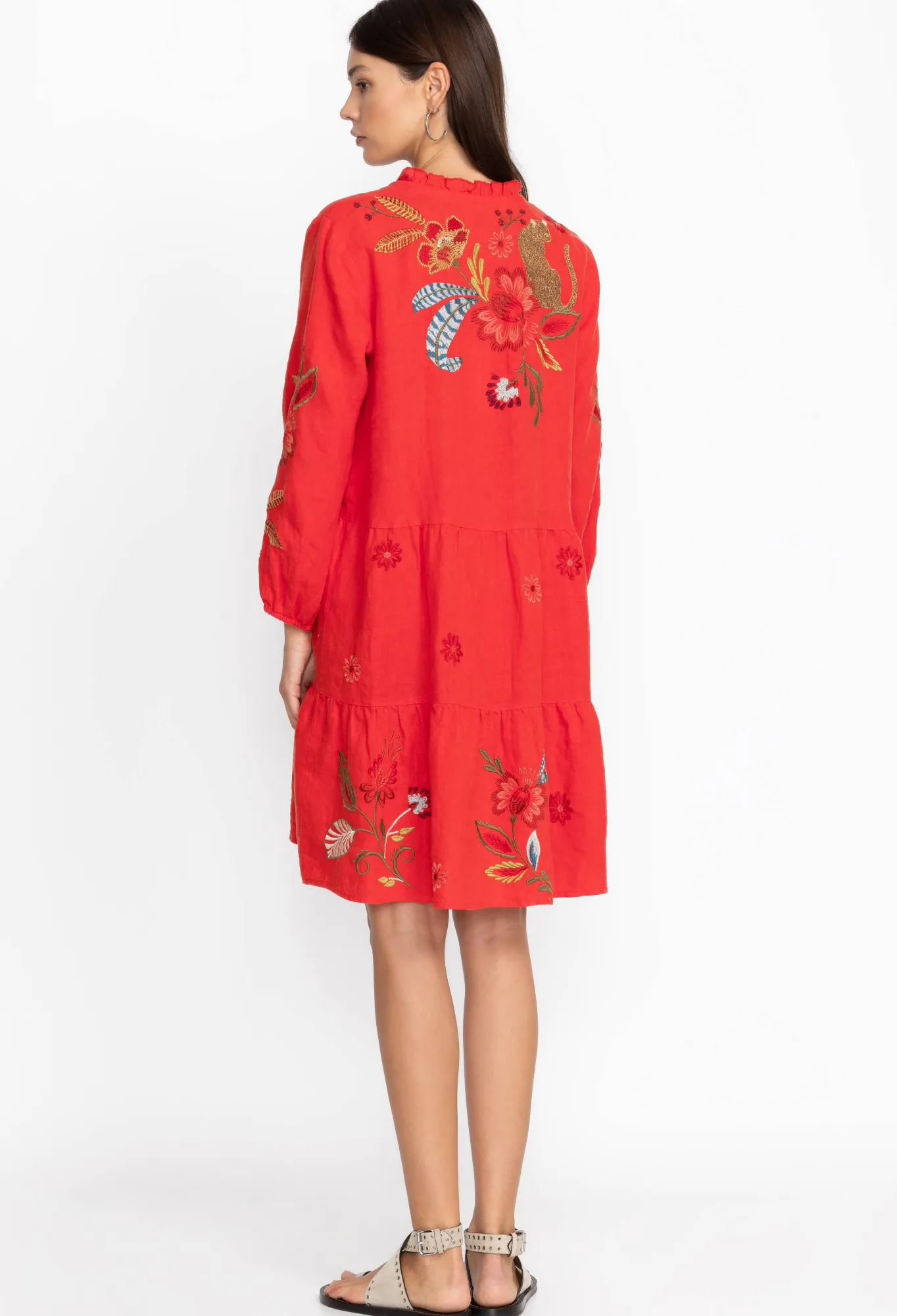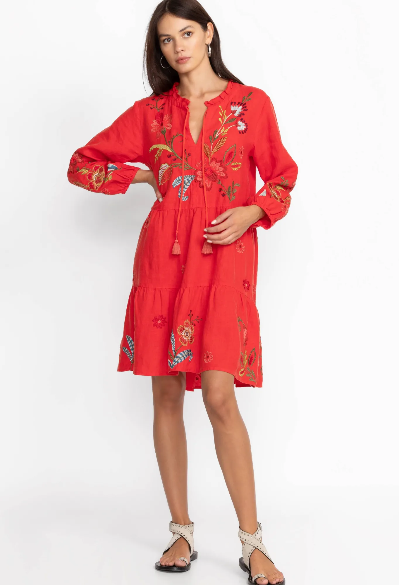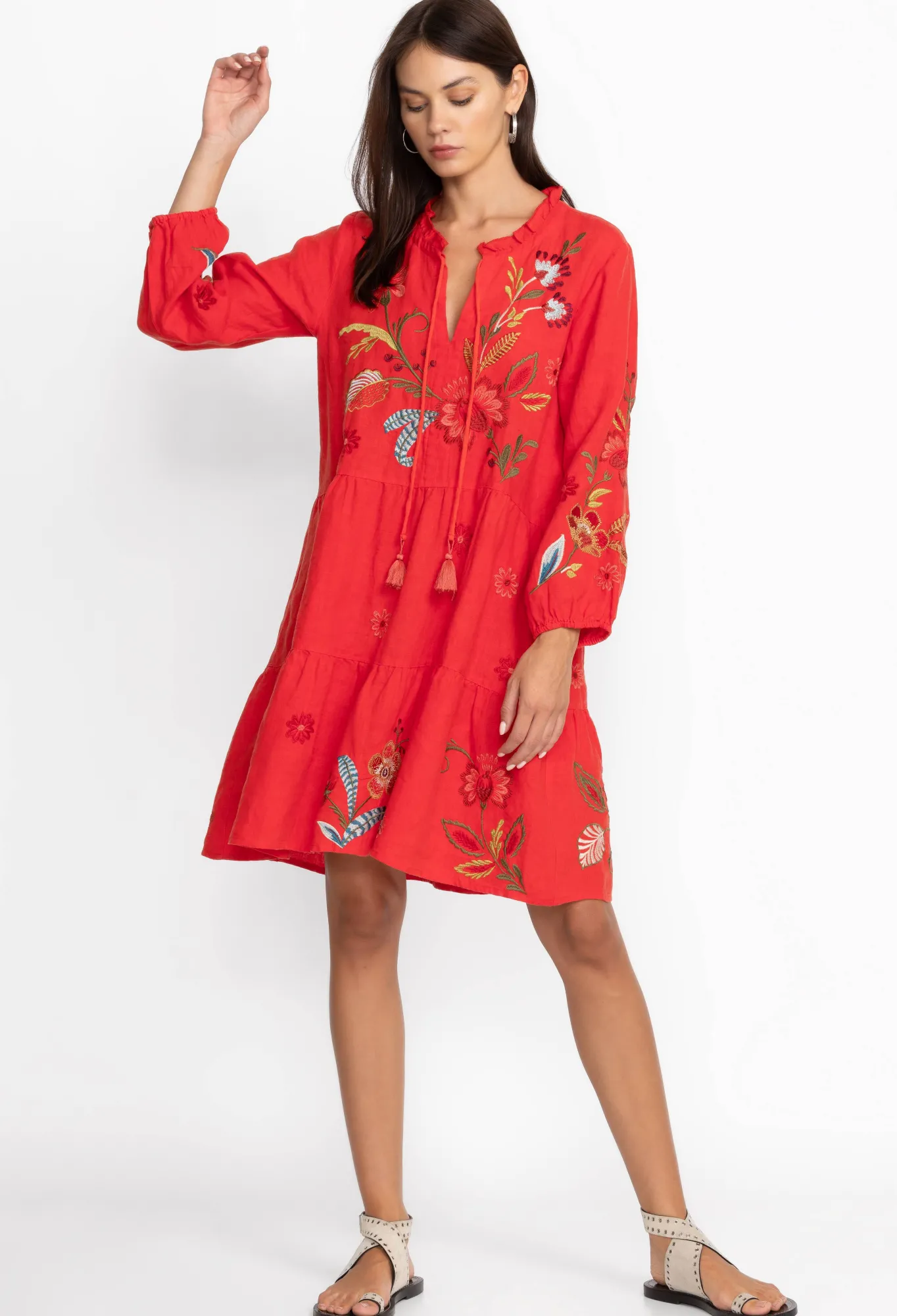 Underpinned With A Sense Of Care-Free Insouciance, The Isabella Tiered Field Dress Takes Your New Season Wardrobe In A Vibrant Direction. Enlivened By A Detailed Floral Placement Embroidery, This Tiered Dress Is Crafted From Breathable Linen With A Tie Front And Tassels And Long Sleeves. Pair This Dress With Flat Sandals For A Bohemian Daytime Look.