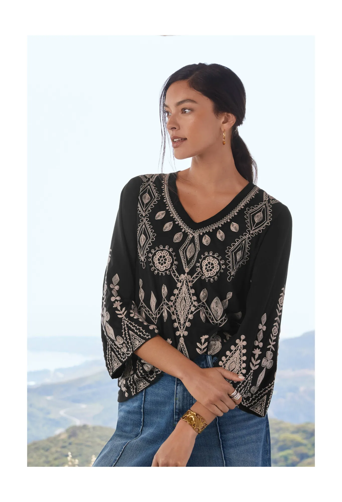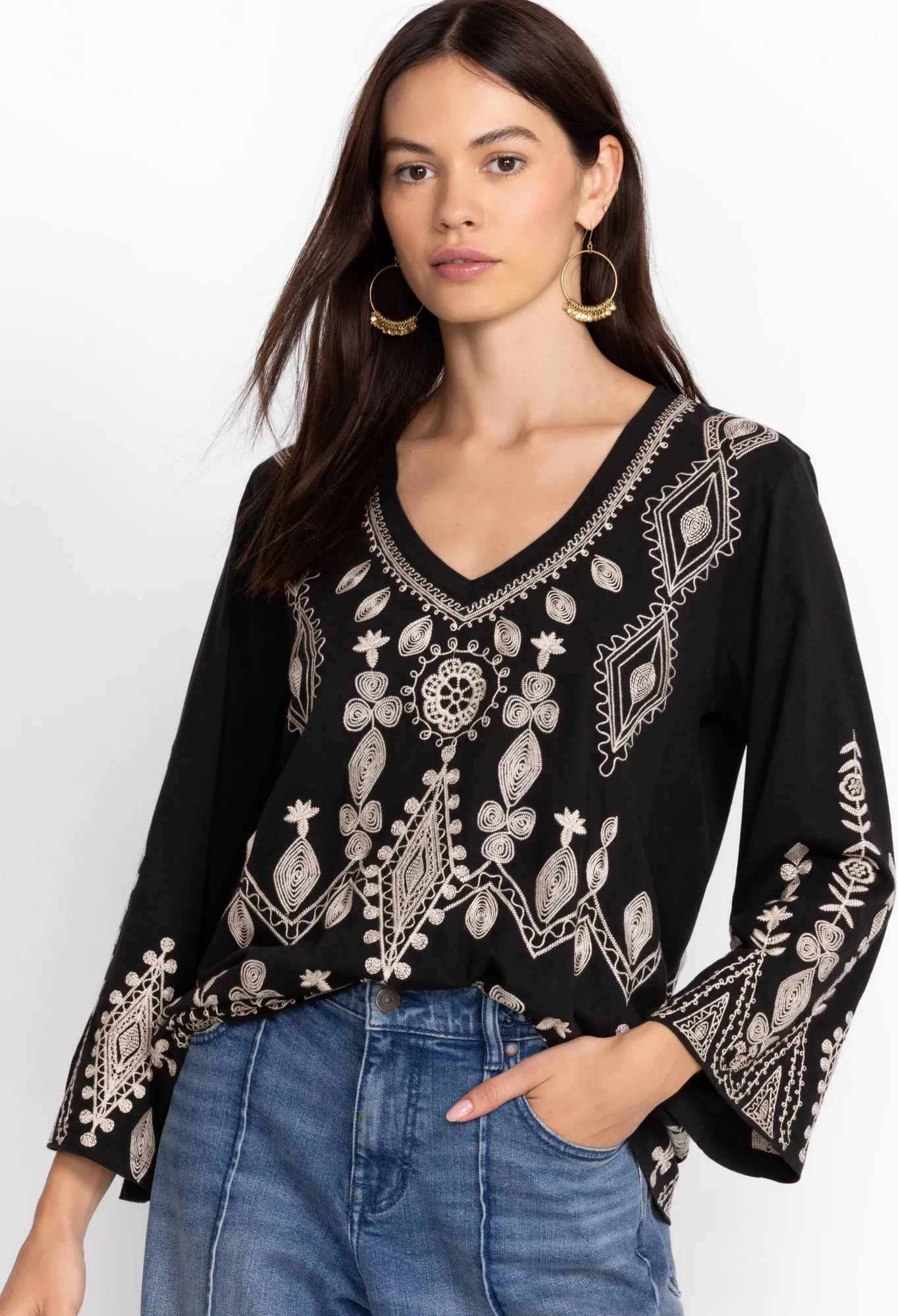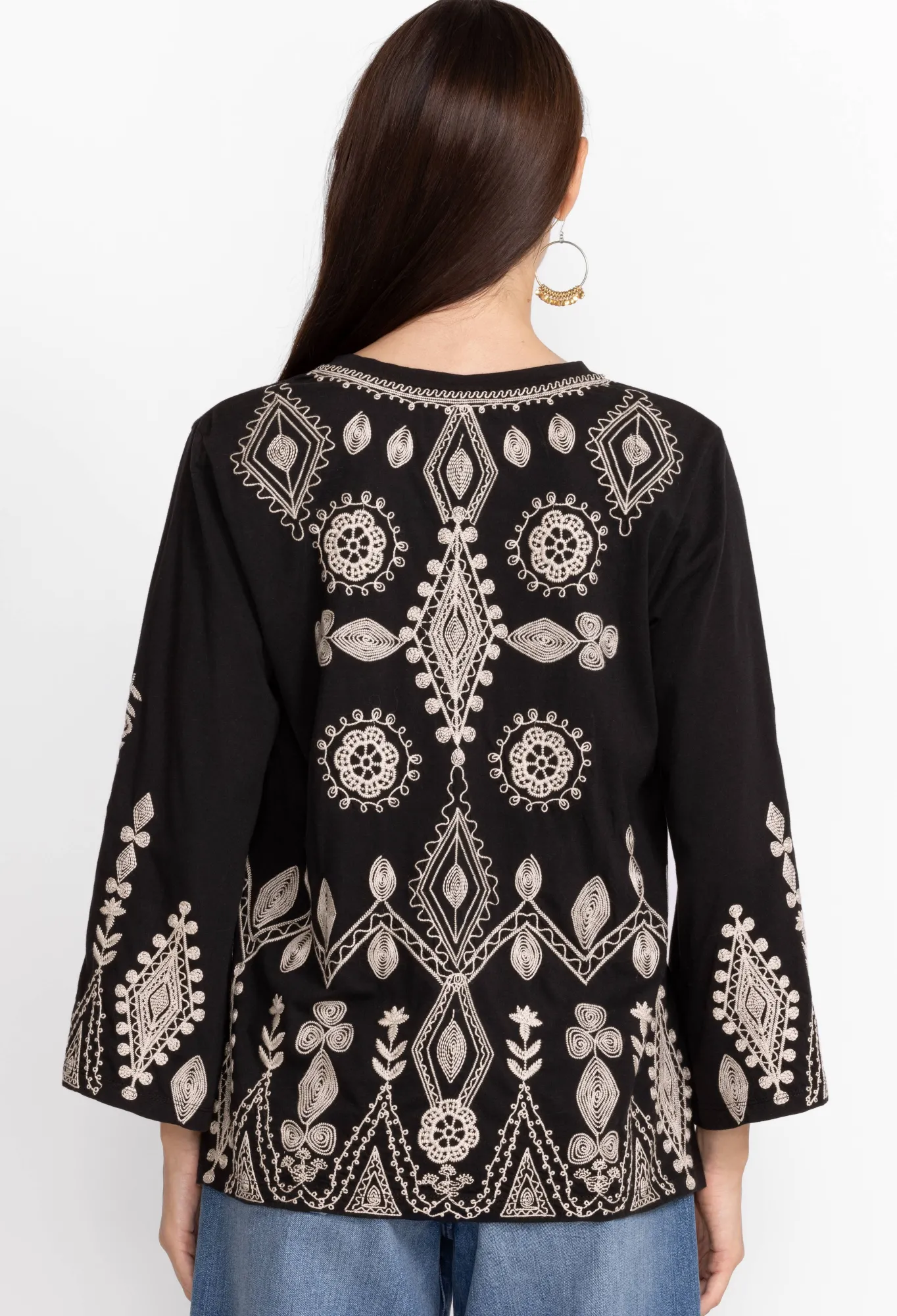 Designed From Pure Cotton, The Liona V-Neck Kimono Sleeve Tee Transforms A Simple Cut Into A Hypnotic Must-Have. A Monochromatic Delight, This Tee Is Enhanced By Long Kimono Sleeves And Features A Flattering V-Neck And A White Placement Embroidery Comprising Florals And Striking Shapes. For A Nonchalant Daytime Outfit, Style This Tee With Blue Denim And Statement Hoop Earrings.