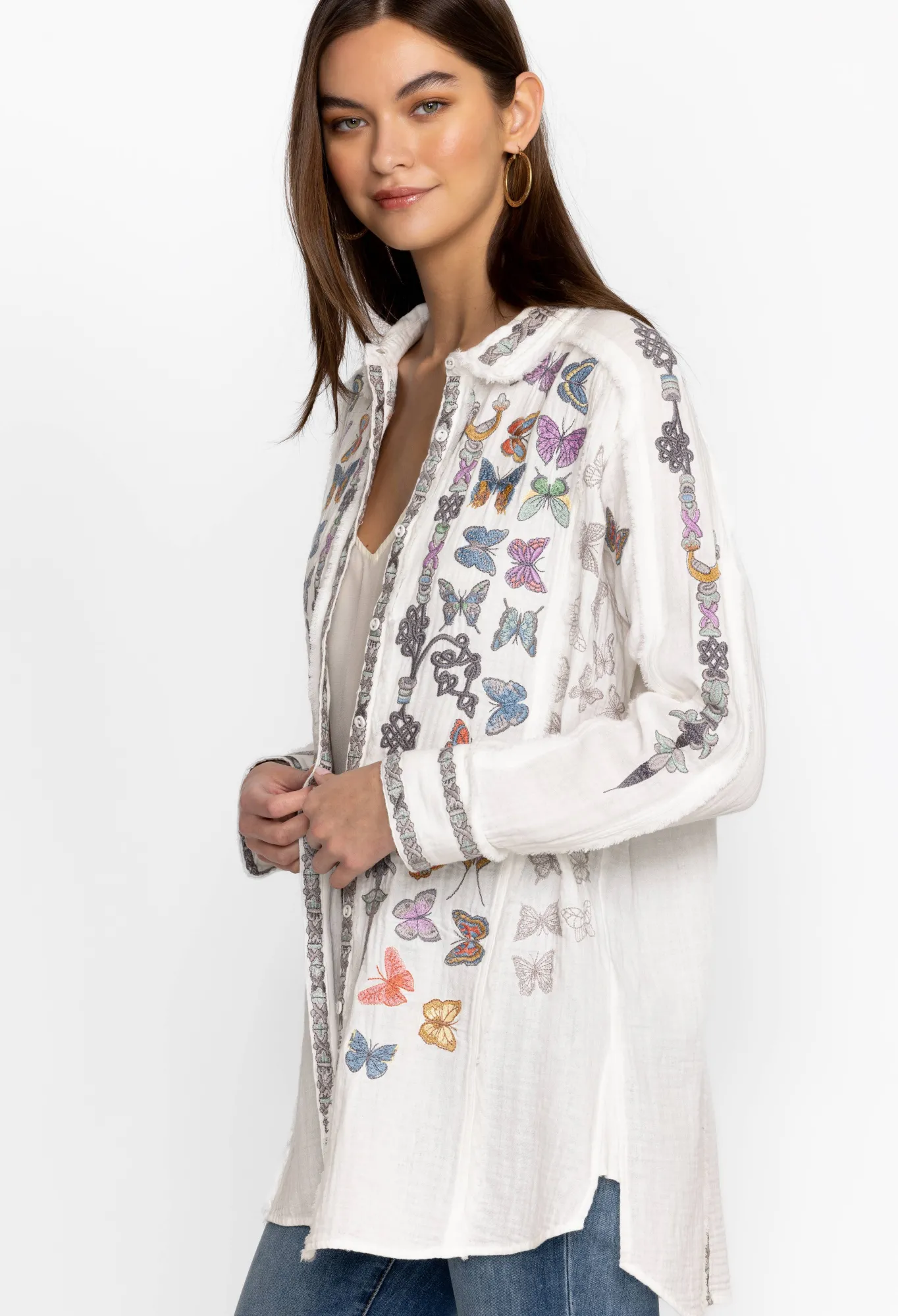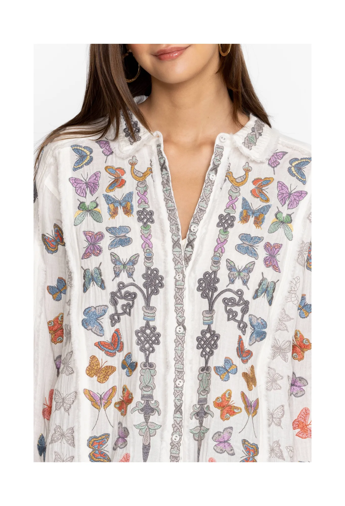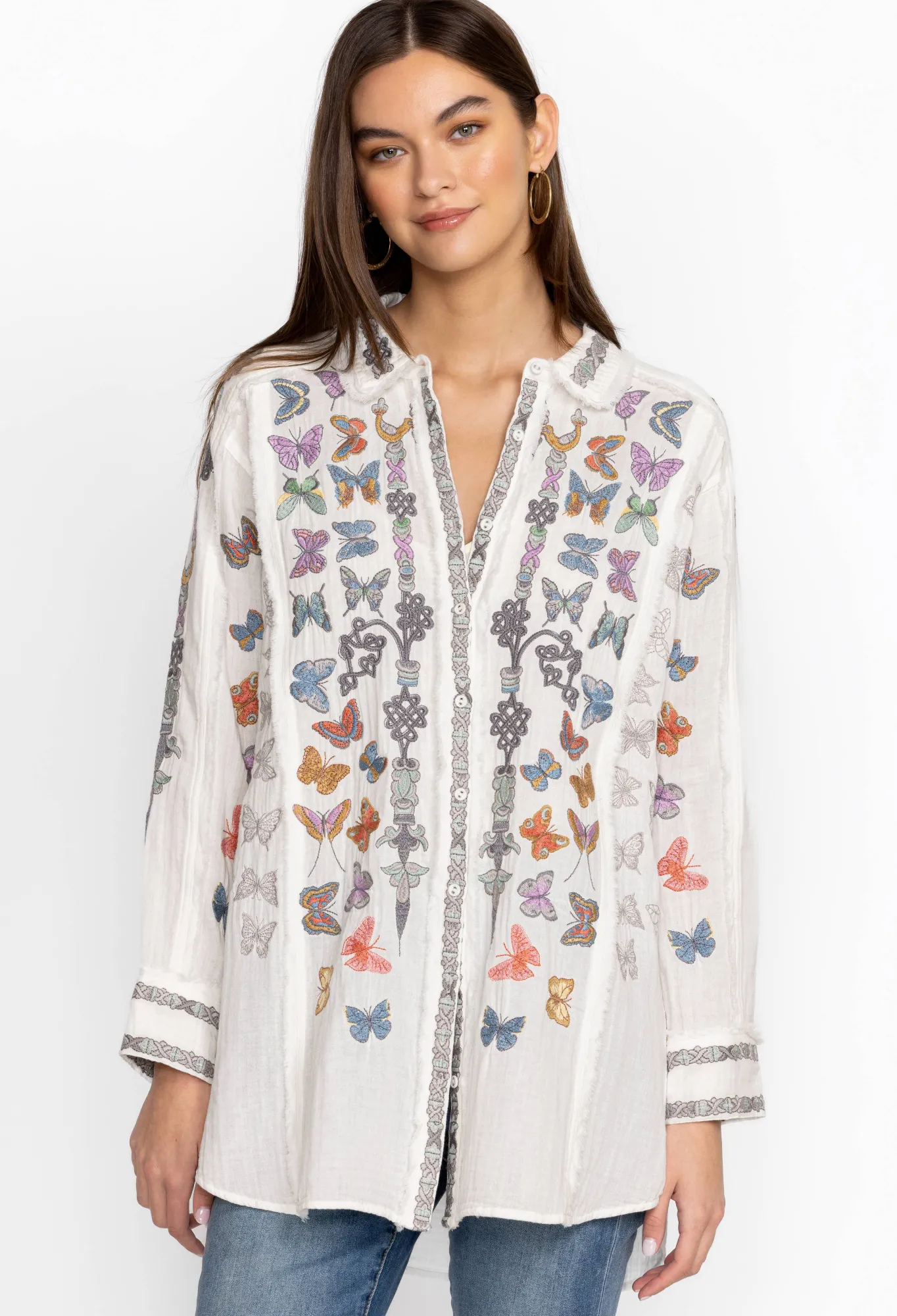 Made From Pure Cotton, The Talia Tunic Turns To The Natural World For Inspiration. A Versatile Yet Statement-Making Style, This Tunic Features A Collar, A Front Button Fastening, Long Sleeves With Buttoned Cuffs, And A Bright Placement Embroidery Comprising Fluttering Butterfly Motifs For A Playful Finish. Wear With Denim Or Layer Over Tailored Pants For An Elevated Daytime Look.