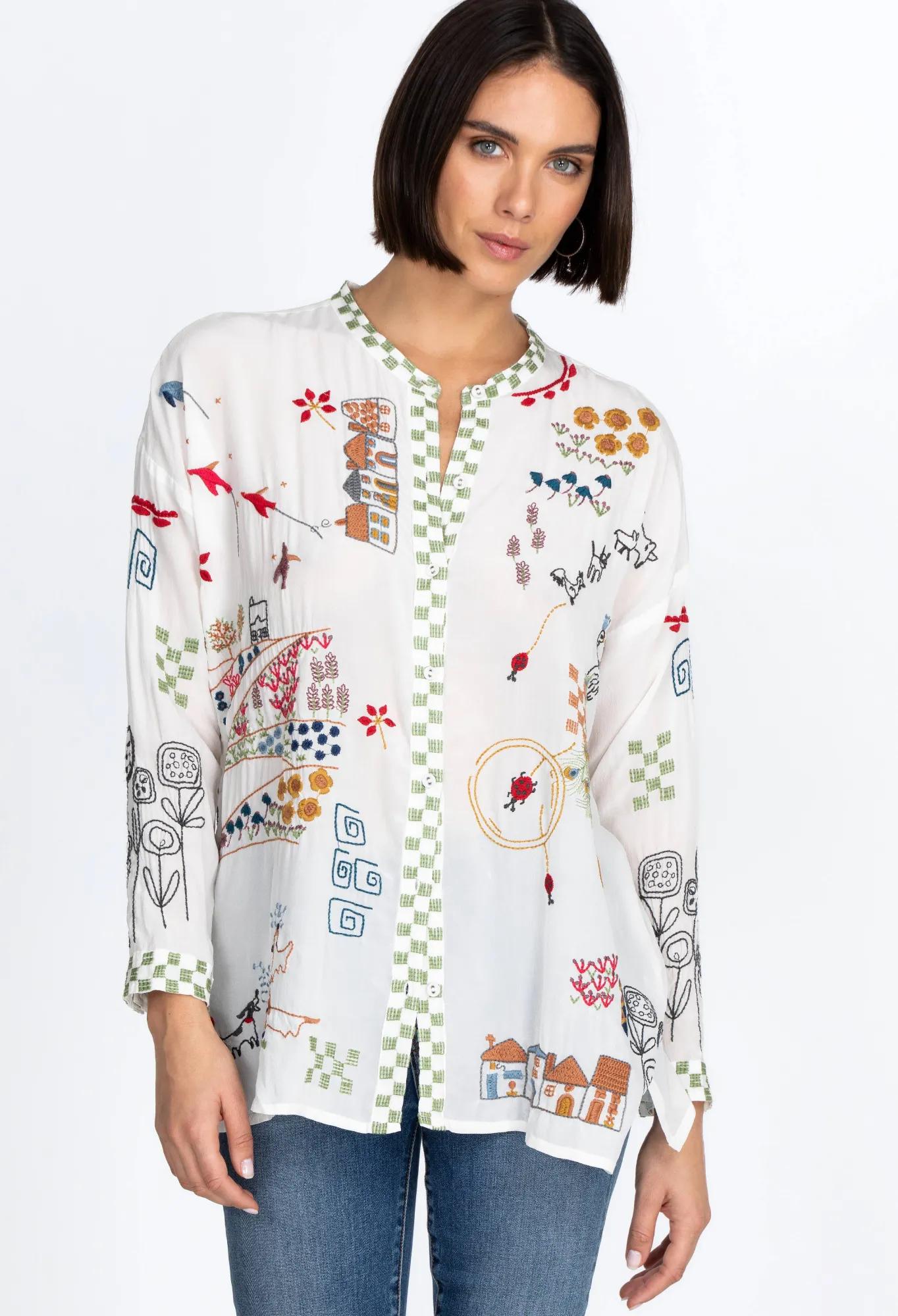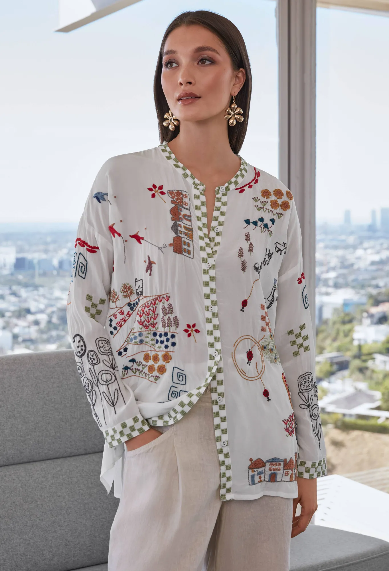 Cut In An Oversized Tunic Silhouette, The Cartagena Blouse Is Embellished In Colorful, Lighthearted Embroideries Reminiscent Of Easy Days Meandering Through Quaint Villages. Made From 100% Silk, This Drop-Shoulder Top Fastens To The Front With Covered Buttons And Pairs Elegantly With The Matching Cartagena Pants For A Vibrant Day-To-Evening Look.