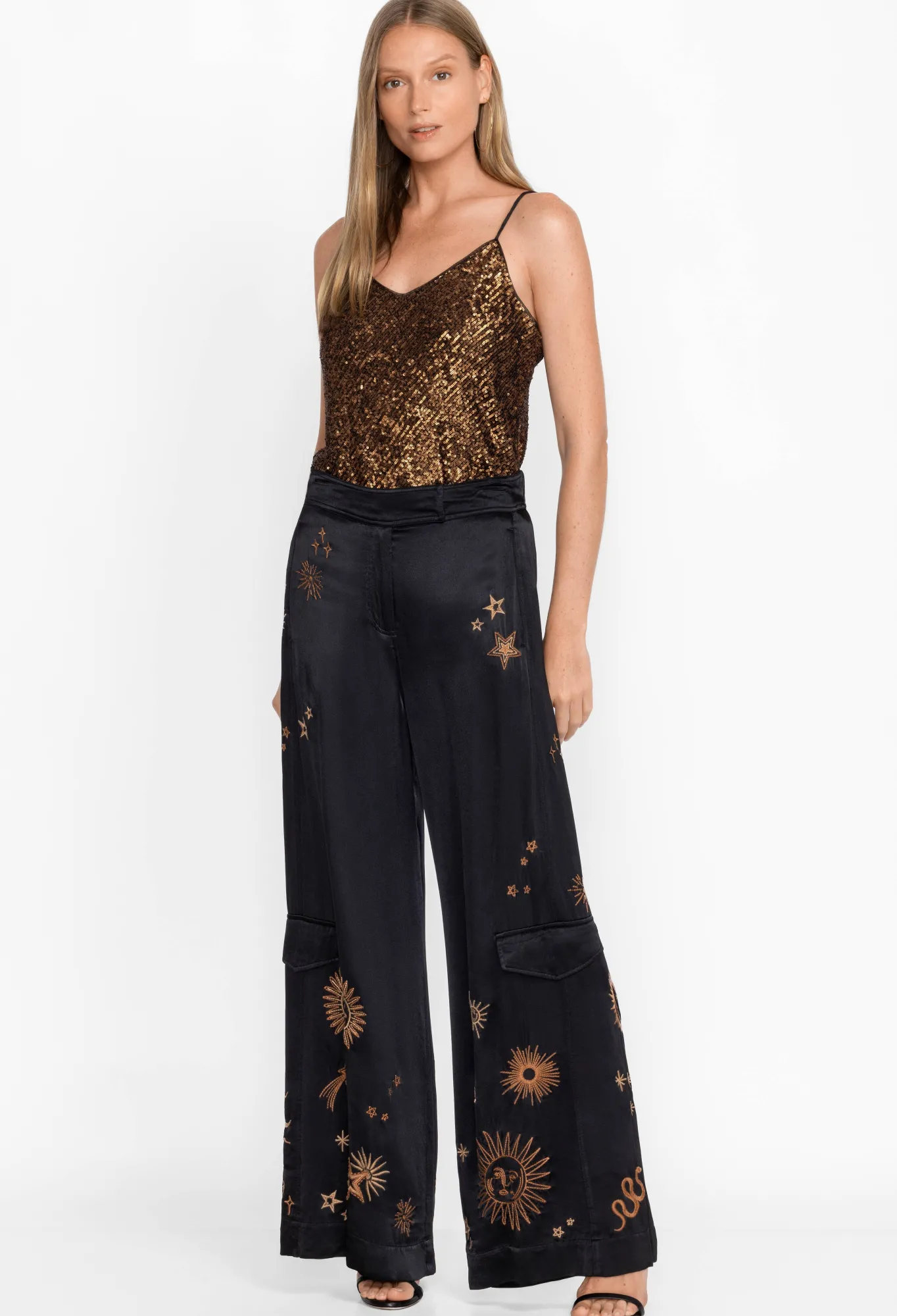 Made From A Comfortable Fabric Weave, The Estrella Wide Leg Cargo Pants Combine Utilitarian Details With A Contemporary Vision. Crafted In Black, These Cargo Pants Boast A Wide Leg, Pockets, An Elastic Waist At The Back With A Button And Hook Front Closure, And A Placement Embroidery With Sequin Detailing For An Unexpected Femme Twist. Style These Pants With A Simple Long Sleeve Tee For A Fashion-Forward New Season Outfit.