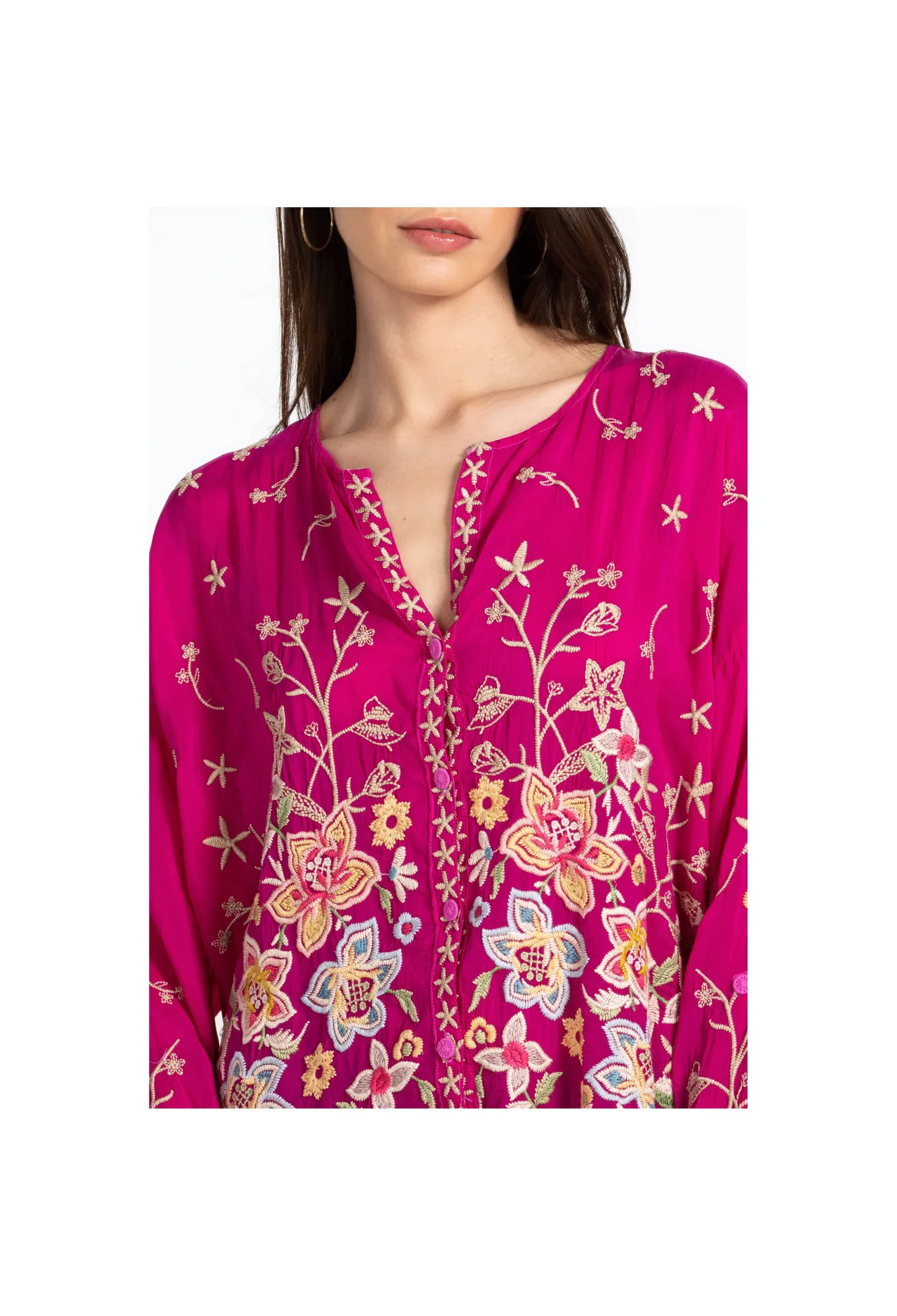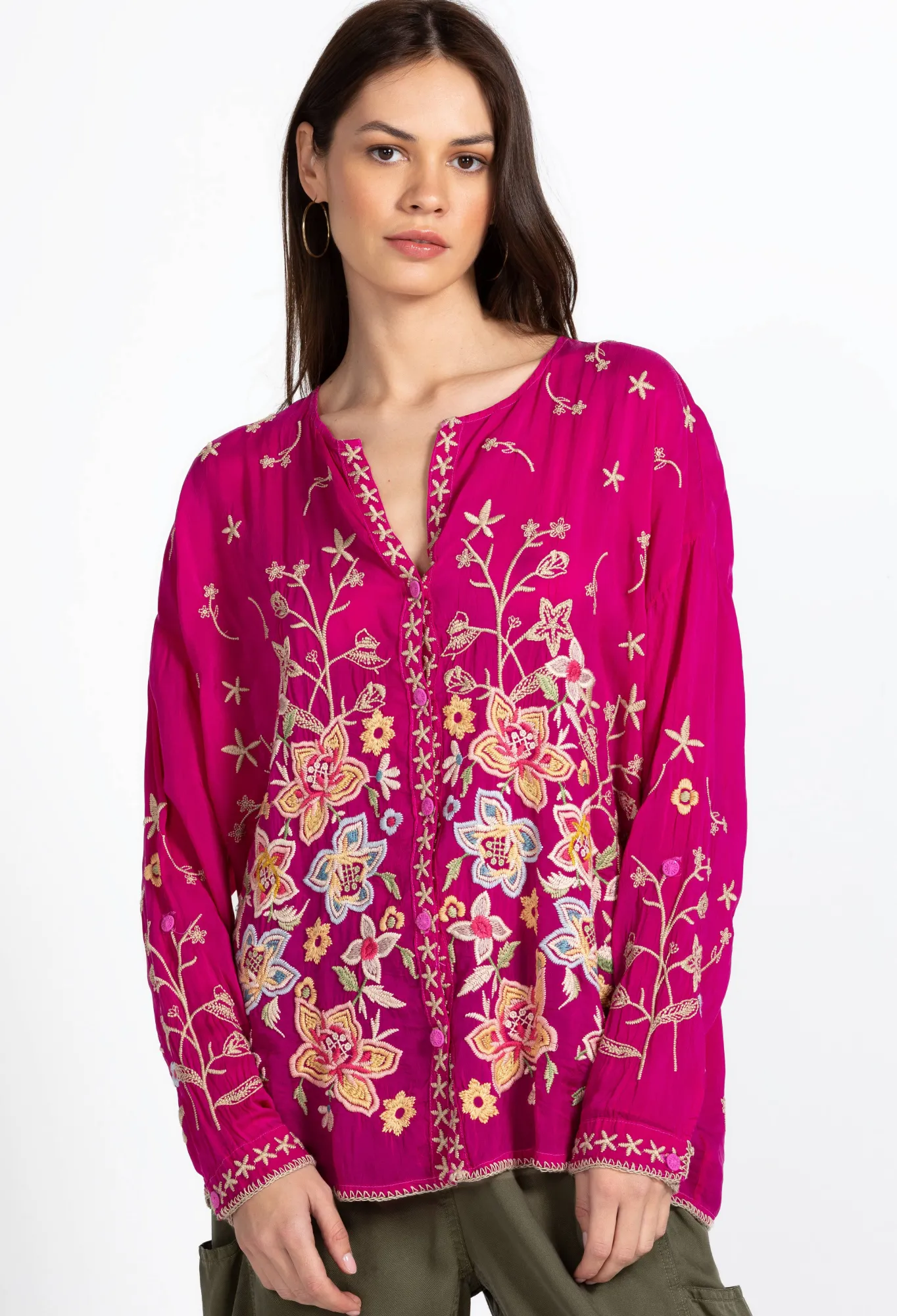 Relaxed In Its Construction And Bold In Color, The Jenai Blouse Is Emphasized By Antique Florals In Rich Hues. Equal Parts Casual And Elegant, This Blouse Is Made From Flowy Rayon With An Open V-Shaped Collar, A Front Button Fastening, Long Sleeves, And An Intricate Placement Embroidery. Throw On With Jeans For A Nonchalant Daytime Look Or Pair With Shorts On Your Next Warm Weather Escape.