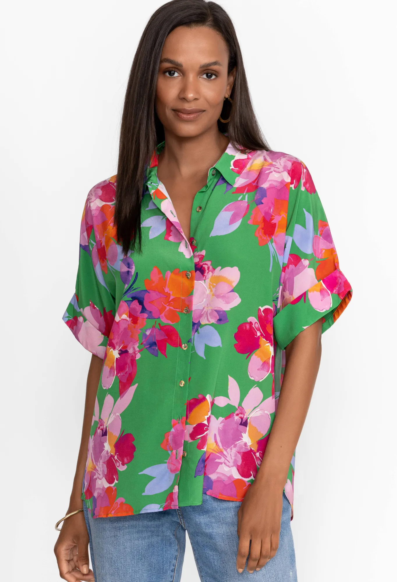 Radiate Cheerfulness And Optimism In The Vibrant Nadine Silk Shirt. A Striking Print For The New Season, The Colorful, Opened Blooms Pop Out Against A Saturated Green Background And Entwine Across The Front And Back Of The Shirt. Finished With A Collar, Short Sleeves, And A Button Front, This Skirt Is A Joyful Choice For Both Brighter Days And Vacations.