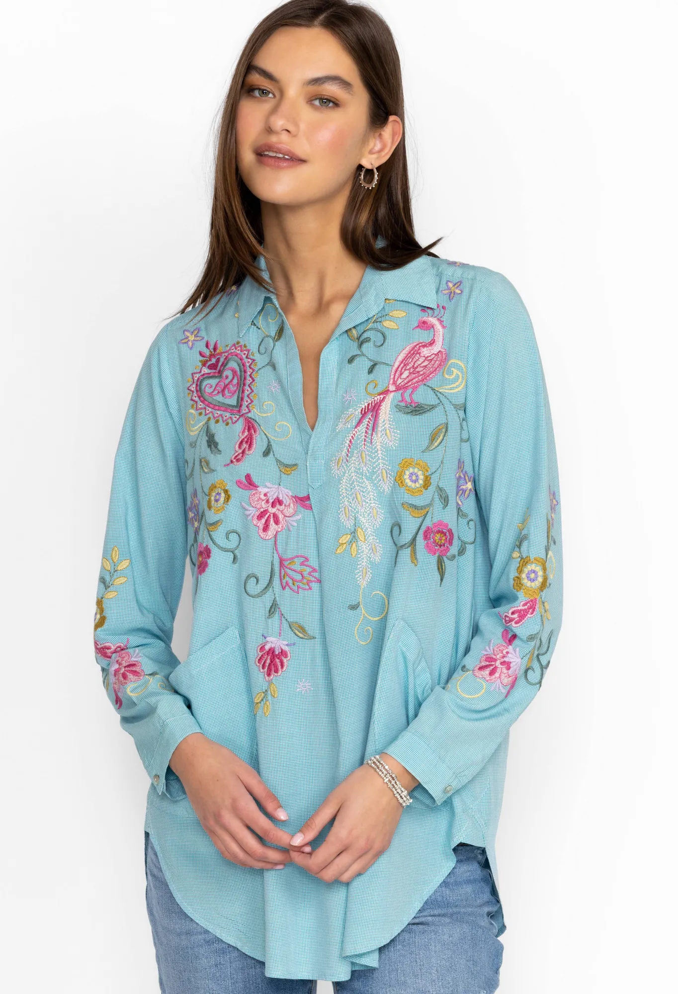 A Classic Silhouette Infused With Whimsy, The Ashlee Henley Popover Tunic Provides Relaxed Comfort With A Unique Approach To Feminine Detail. Wrapped In Delicate Placement Embroidery, This Blouse Offers Functional Pockets In An Inviting A-Line Shape. Pair This Tunic With Stretch Leggings And Pointed Flats For A Brunch Date.