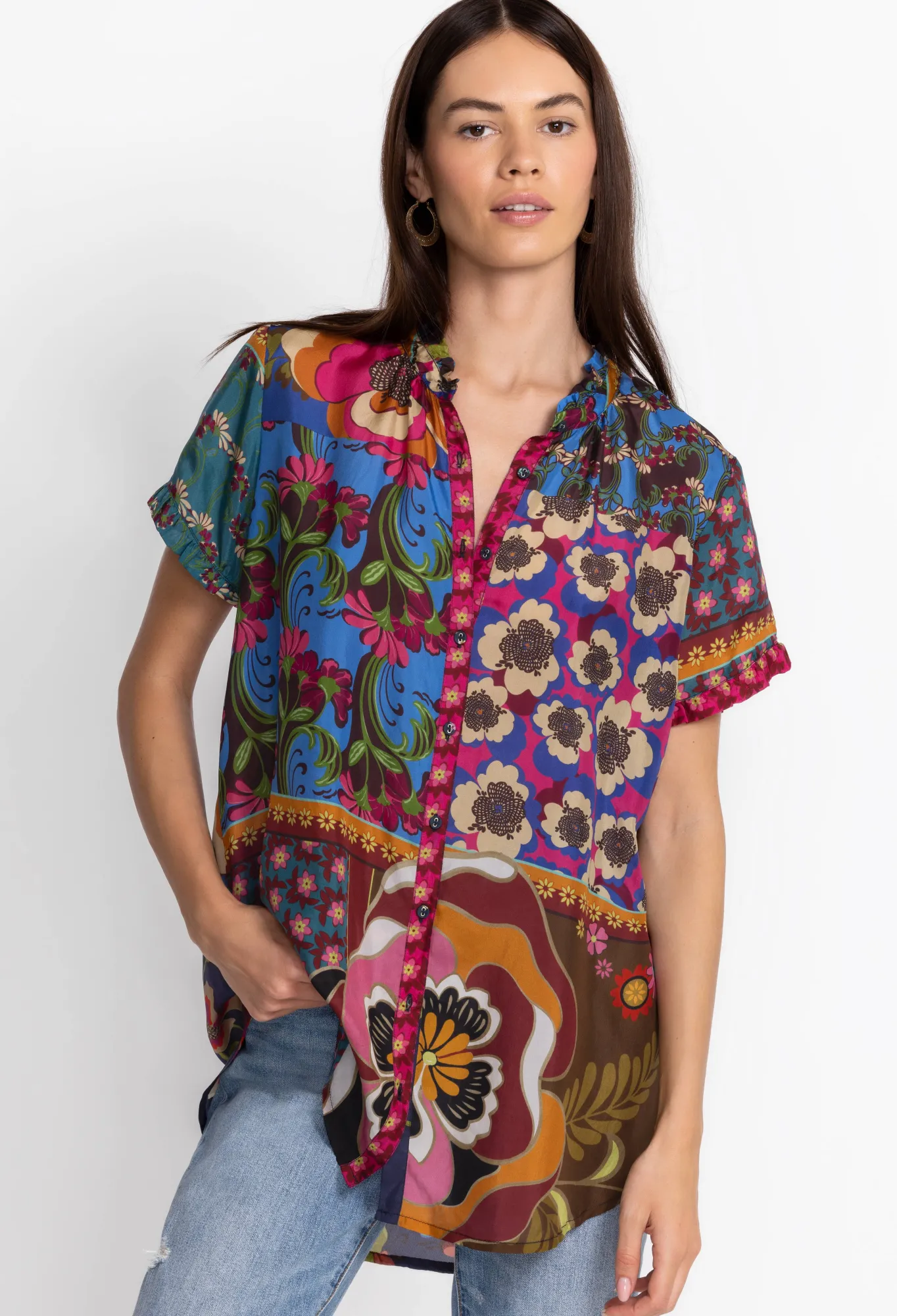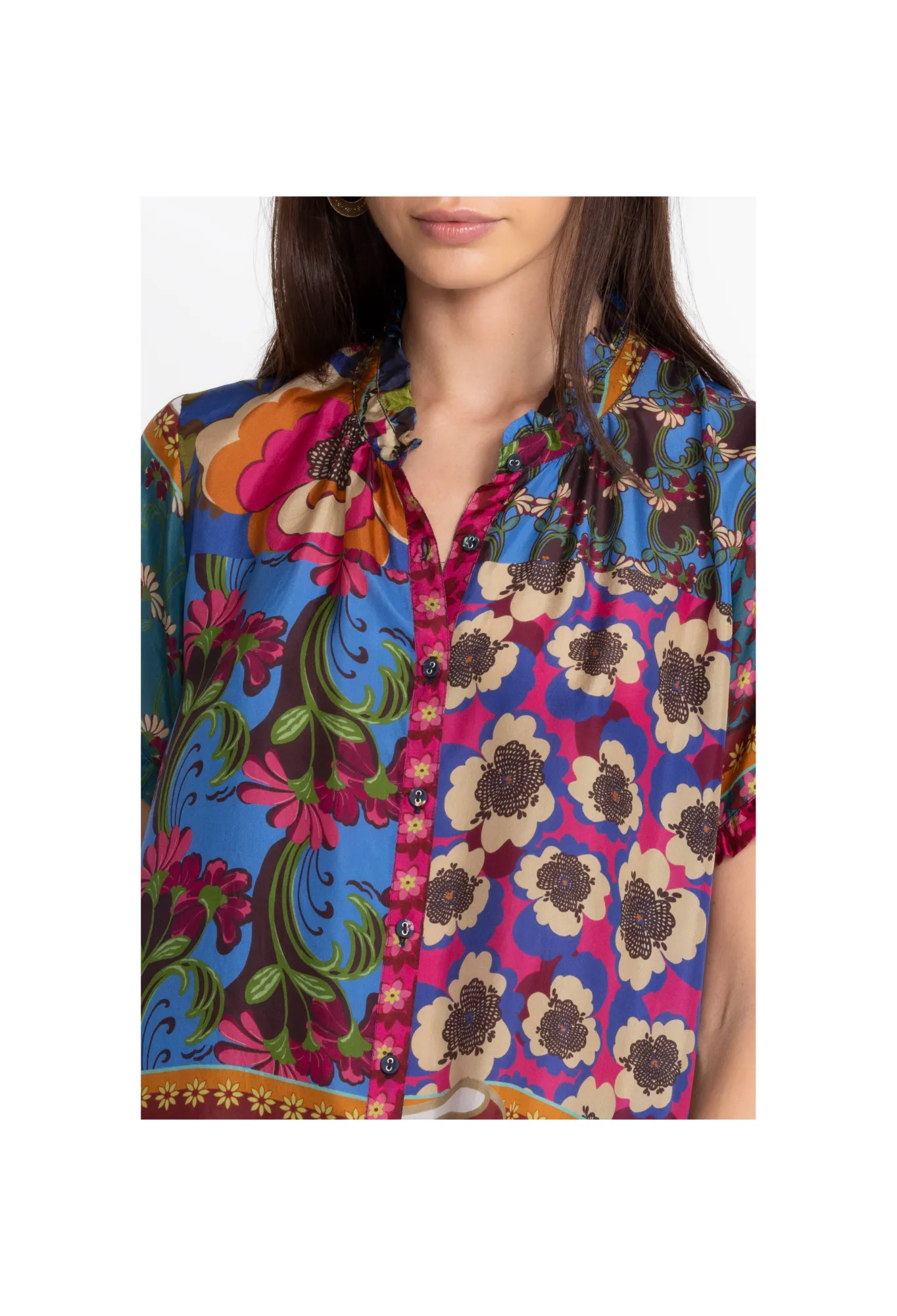 Spun From Lustrous Silk, The Promisino Zoli Tunic Takes Your New Season Looks In An Abstract Direction. Underpinned With An Artistic Flair, This Tunic Features A Front Button Closure, Short Sleeves, 70S-Inspired Floral Motifs, And A Ruffle Collar And Hem For An Opulent Touch. Wear This Tunic With Jeans And Gold-Tone Jewelry For A Vibrant Take On Daytime Dressing.