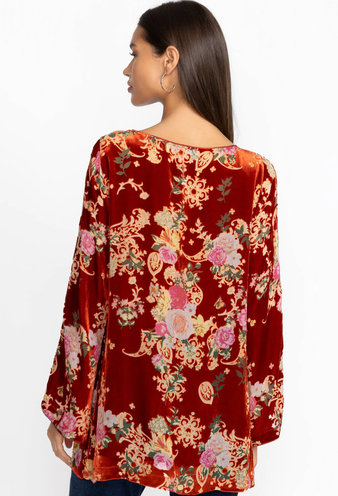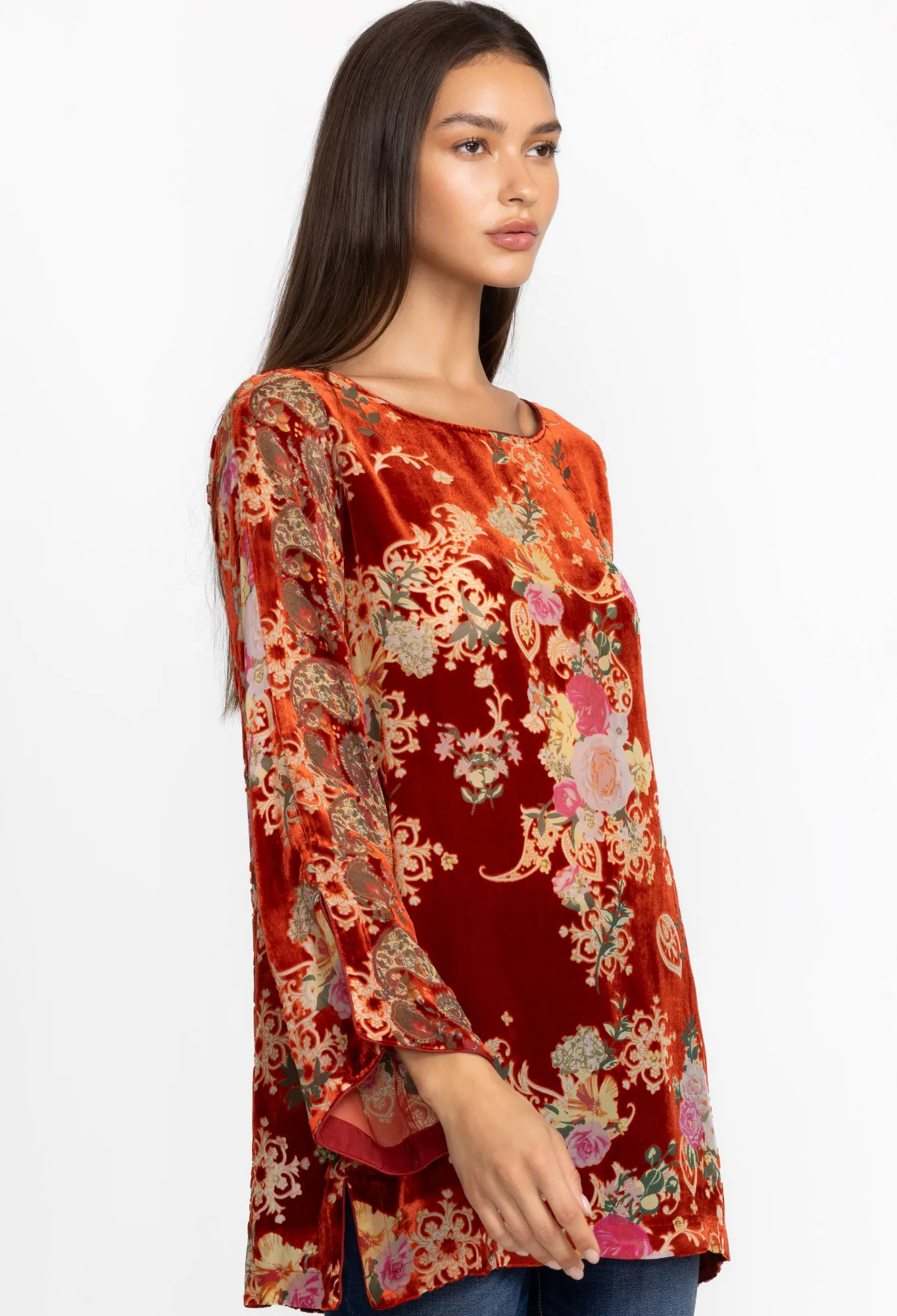 Elegantly Showcasing Vibrant Floral Compositions Against A Luxurious Backdrop, The Paisley Kimi Tunic Is A Captivating T…