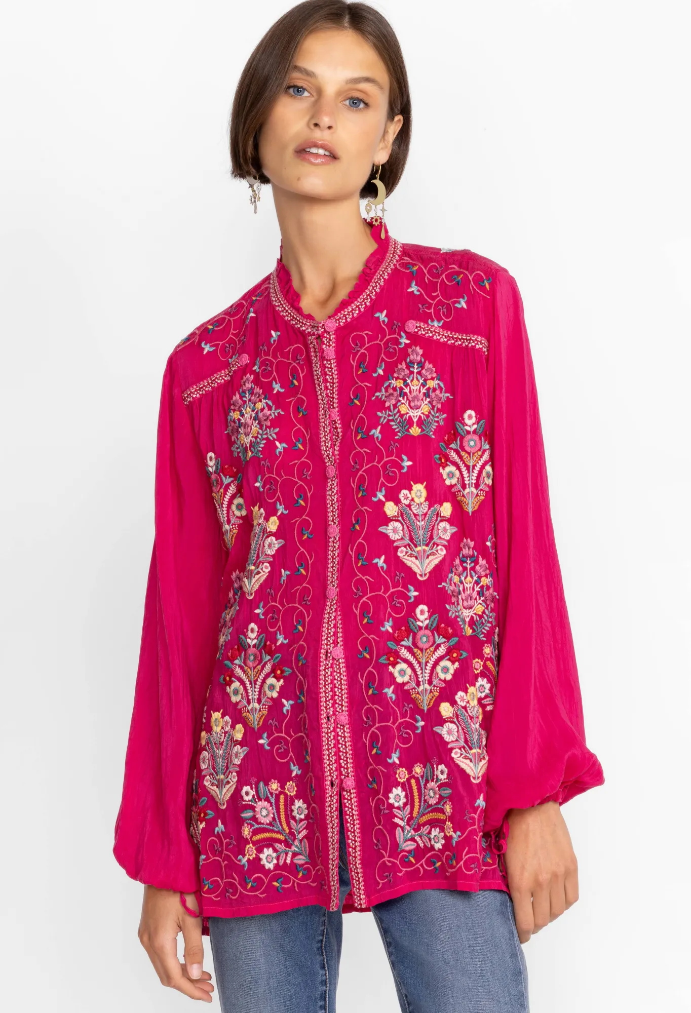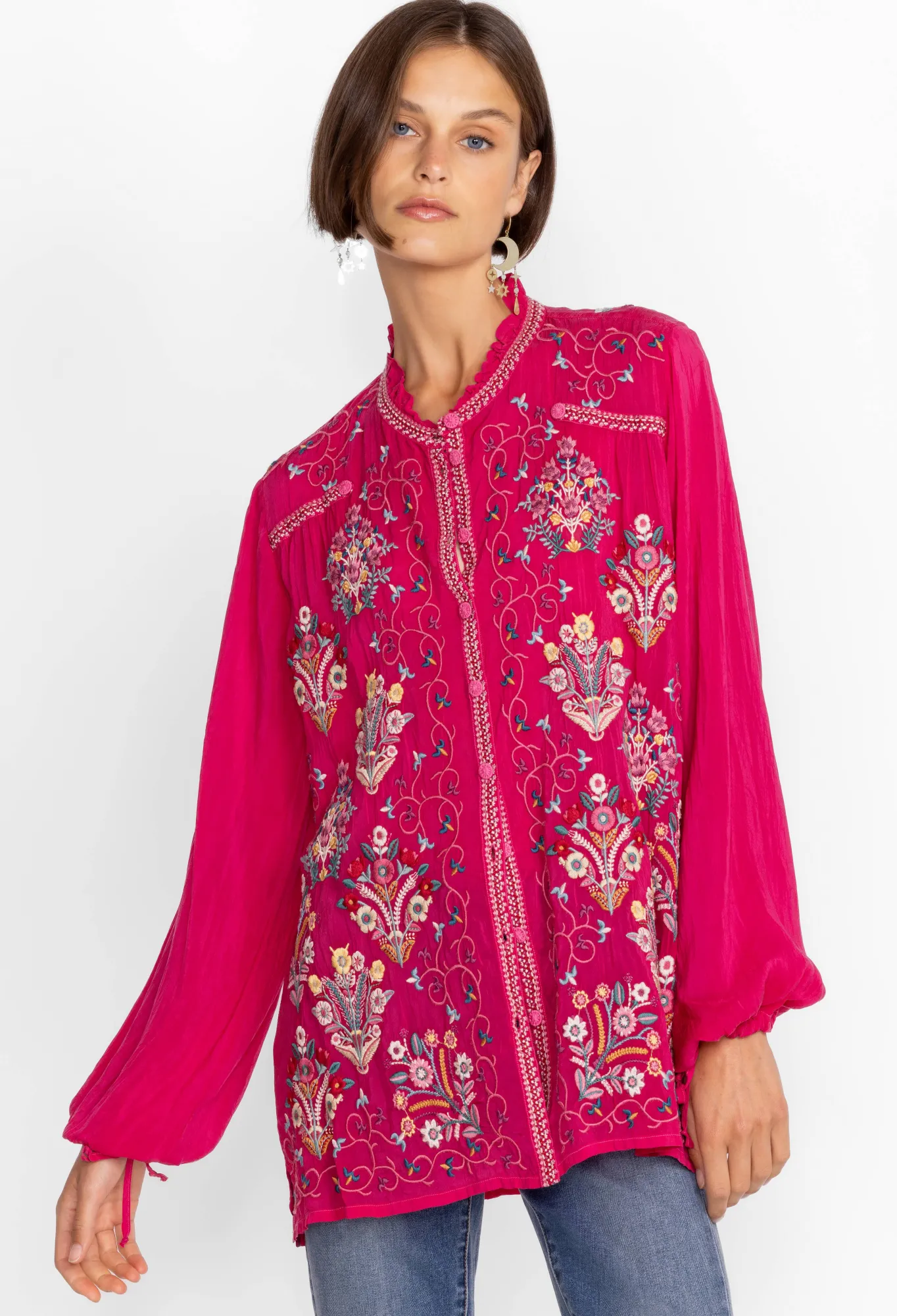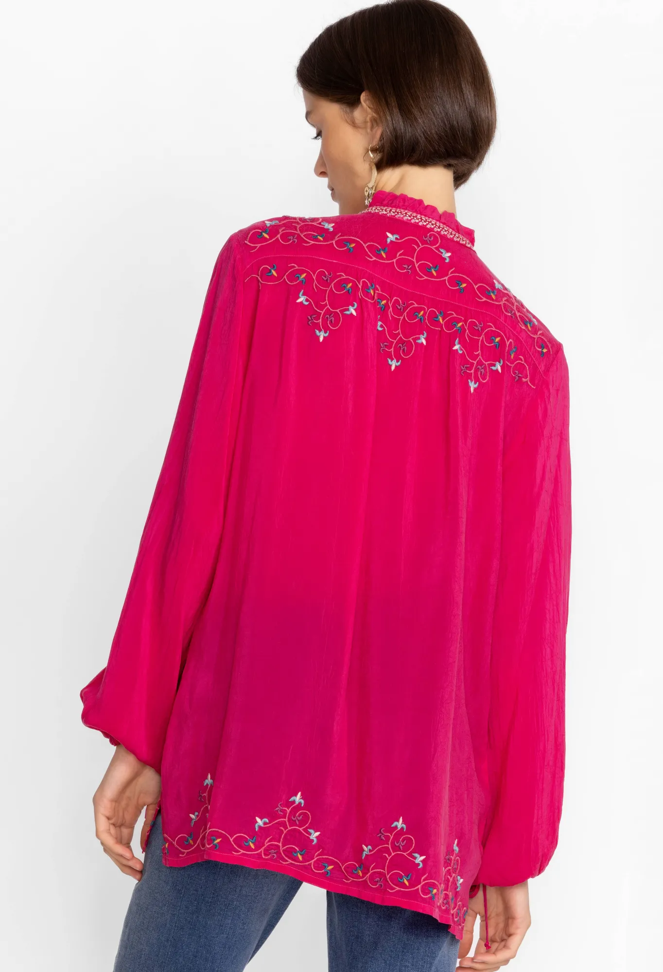 Presenting A Delightful Casual Wear Option, The Bertha Blouse Is An Endearing Combination Of Color And Design. Adorned With Bold Placement Embroidery And Featuring A Unique Drawstring Sleeve, This Beautiful Blouse Is The Perfect Way To Elevate Your Weekend Wardrobe. Pair With Dark Wash Jeans And Pointed Flats For An Elevated Casual Look.