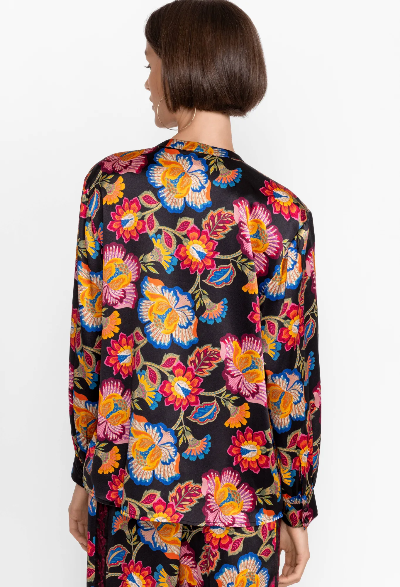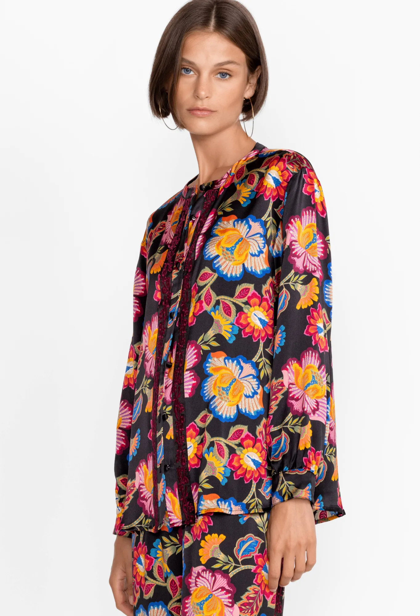 Underpinned With A Sense Of Nostalgia, The Sidonia Mandarin Button Down Shirt Elevates A Perennial Wardrobe Basic With Glamorous Detailing. Made From Fluid Silk, This Shirt Boasts Long Sleeves, A Collar, A Front Button Closure, Fabric Covered Buttons, And A Romantic Arrangement Of Fresh Blooms. For The Day, Pair This Shirt With Wide-Leg Pants, And For The Evening, Opt For A Midi Skirt And Low Heel.