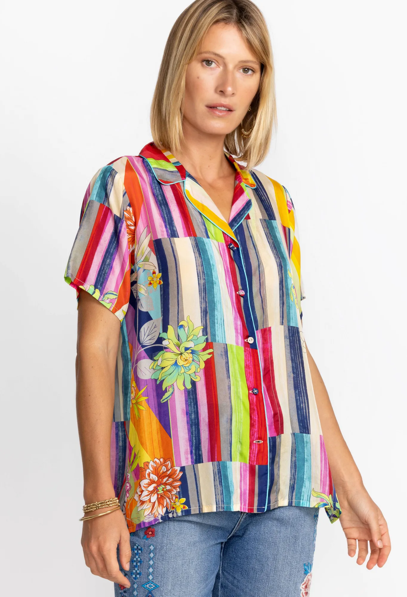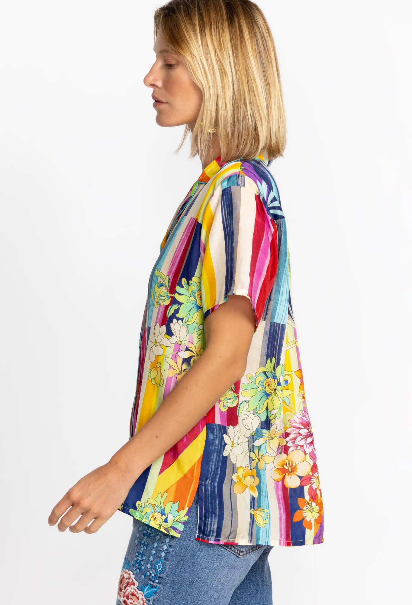 Crafted From 100% Silk, The Summer Stripe Button Up Is A Refreshing Take On A Classic Blouse. Featuring Bold Stripes Paired Seamlessly With Soft Floral Hues, This Lightweight, Flowy Top Is An Elegant Statement Piece. Pair With Your Favorite Jeans Or Wide Leg Pants For A Lively Weekend Look.