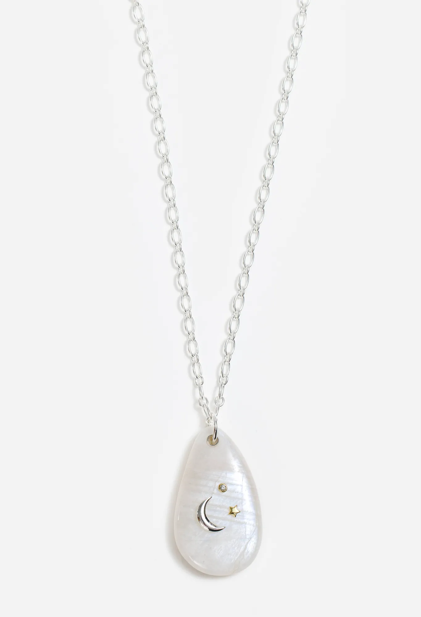 Capturing Celestial Wonder In A Unique Jewelry Piece, The Moonlight Moonstone Necklace Is Crafted From A Custom Cut And Polished Natural Stone. Featuring A Sterling Silver Inlay Moon And A Bezel Set Cubic Zirconia, This Lovely Piece Sparkles At Any Hour. Pair With A Linen Pant Set And Easy Lip On Sandals For A Relaxed Look Perfect For A Weekend Away.