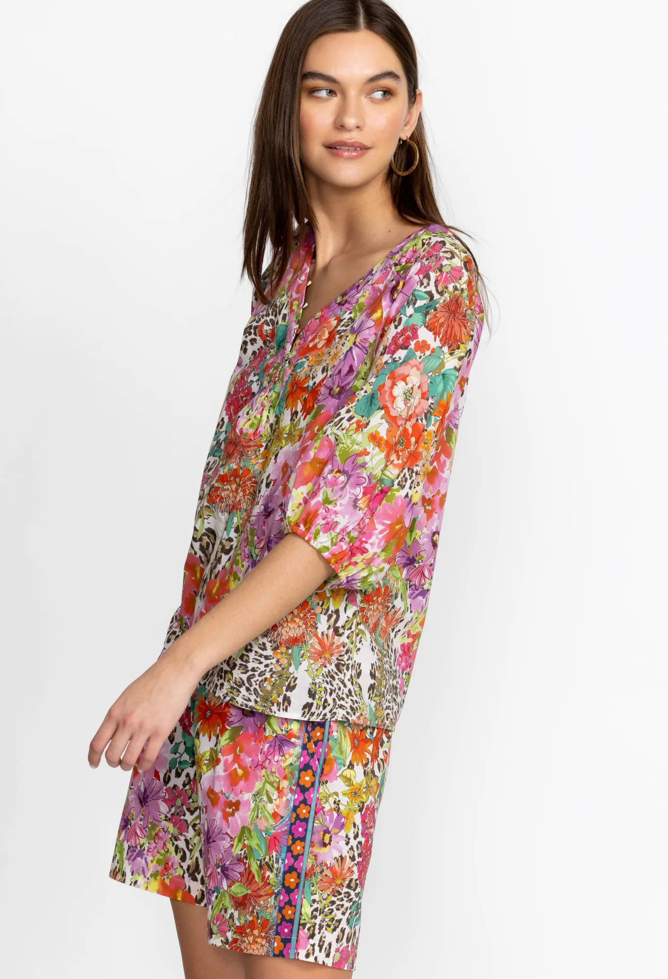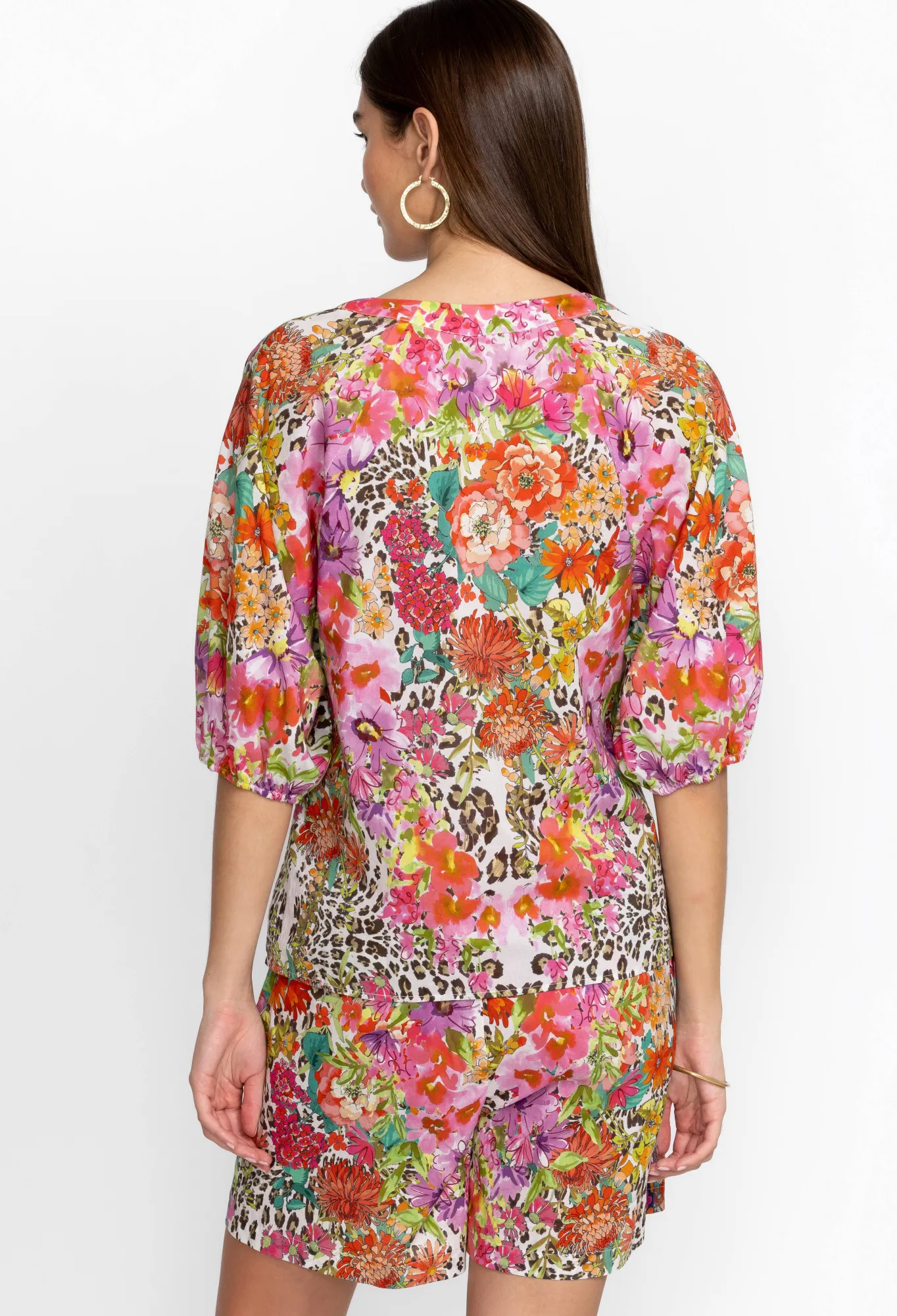Instilled With Stylish Extravagance, The Wild Garden Puff Sleeve Button Front Blouse Is Defined With A Leopard Print That’s Unexpectedly Complemented With Flourishing Flowers. Made From Pure Cotton, This Blouse Features A Front Button Closure And Puff Sleeves With Elastic Cuffs For Added Volume. Style With Denim Or Pair With The Matching Shorts For A Chic Warm-Weather Outfit.