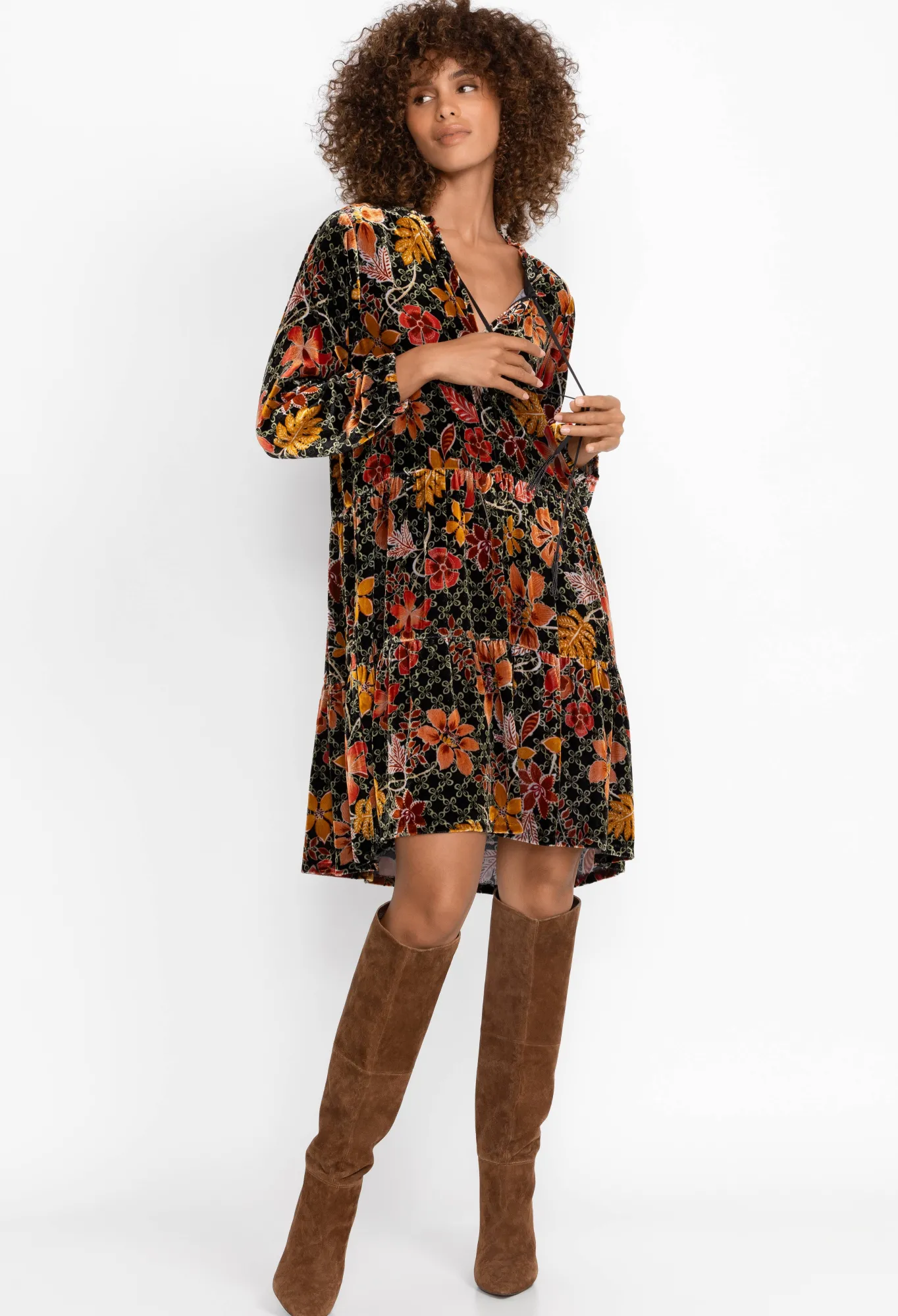 Overflowing With Vibrant Blossoms, The Jasmoon Flore Velvet Field Tiered Dress Is A Sublime Selection To Celebrate The Shifting Seasons. Meticulously Fashioned From A Silk Blend Fabric, This Blouse Boasts A Tie Front Neckline Adorned With Ornate Tassels, Encapsulating Casual Refinement. For A Weekend Ensemble Filled With Timeless Charm, Combine Leather Riding Boots And An Oversized Tote For A Weekend Ready Look.