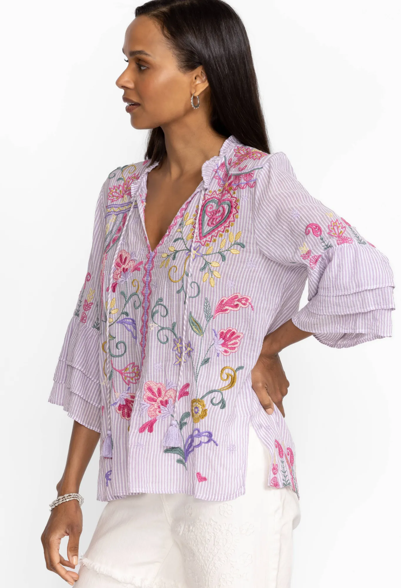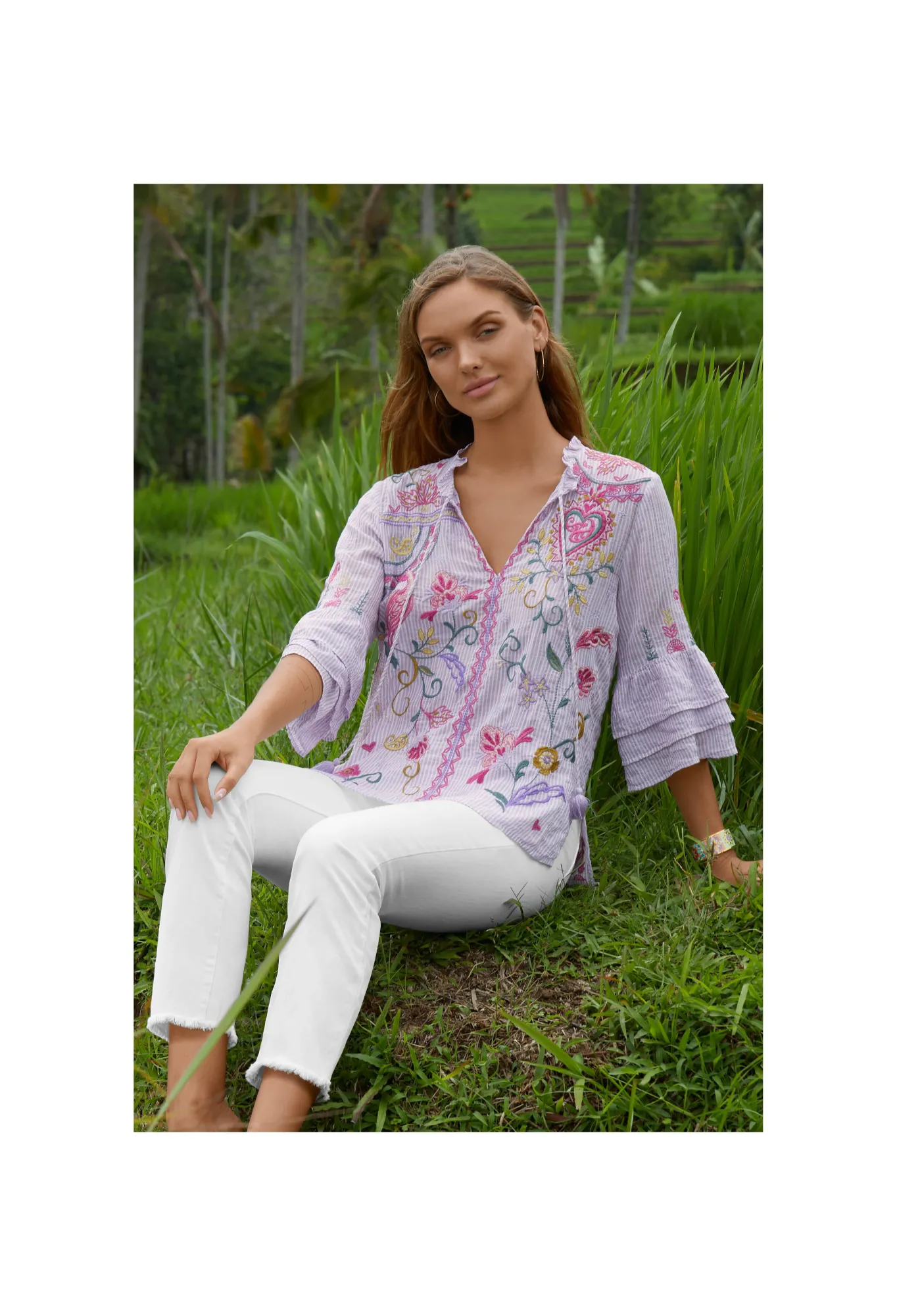 Conjuring Up Images Of Rolling Hills Dotted With Vibrant Flowers, The Ashlee Ruffle Sleeve Blouse Transports You To Another Place. Beautifully Embroidered Details And Delicate Ruffles Create A Romantic Vision That Can Easily Elevate Your Wardrobe. Pair This Blouse With Denim Trousers Or A Sleek Skirt For A Style That Transcends.
