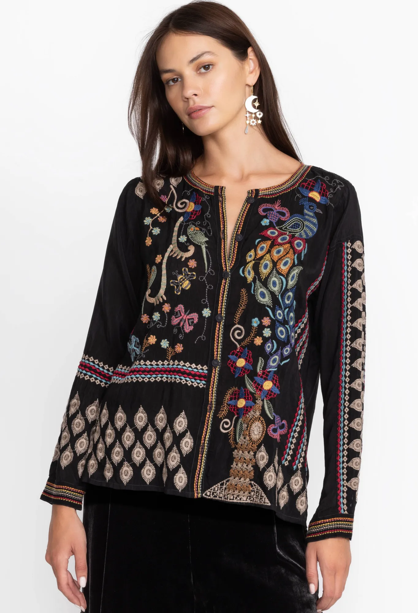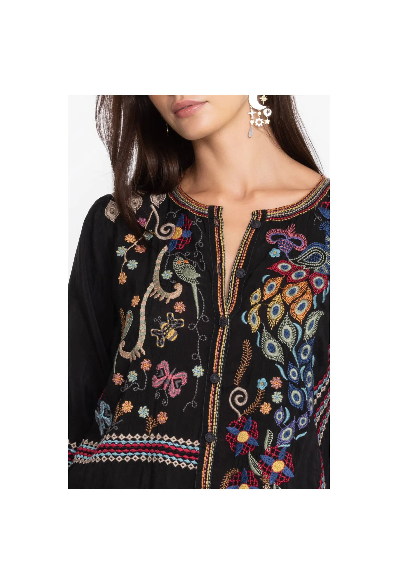Infusing Your Wardrobe With An Irresistible Blend Of Bohemian Chic And Chic Elegance, The Rio Blouse Stands As A Quality-Crafted Go-To Piece. Exquisitely Adorned With Intricate Placement Embroidery, This Woven Button-Front Top Elevates Any Look With A Touch Of Refinement. For A Uniquely Timeless Look, Pair With Comfortable Denim And Stylish Flats.