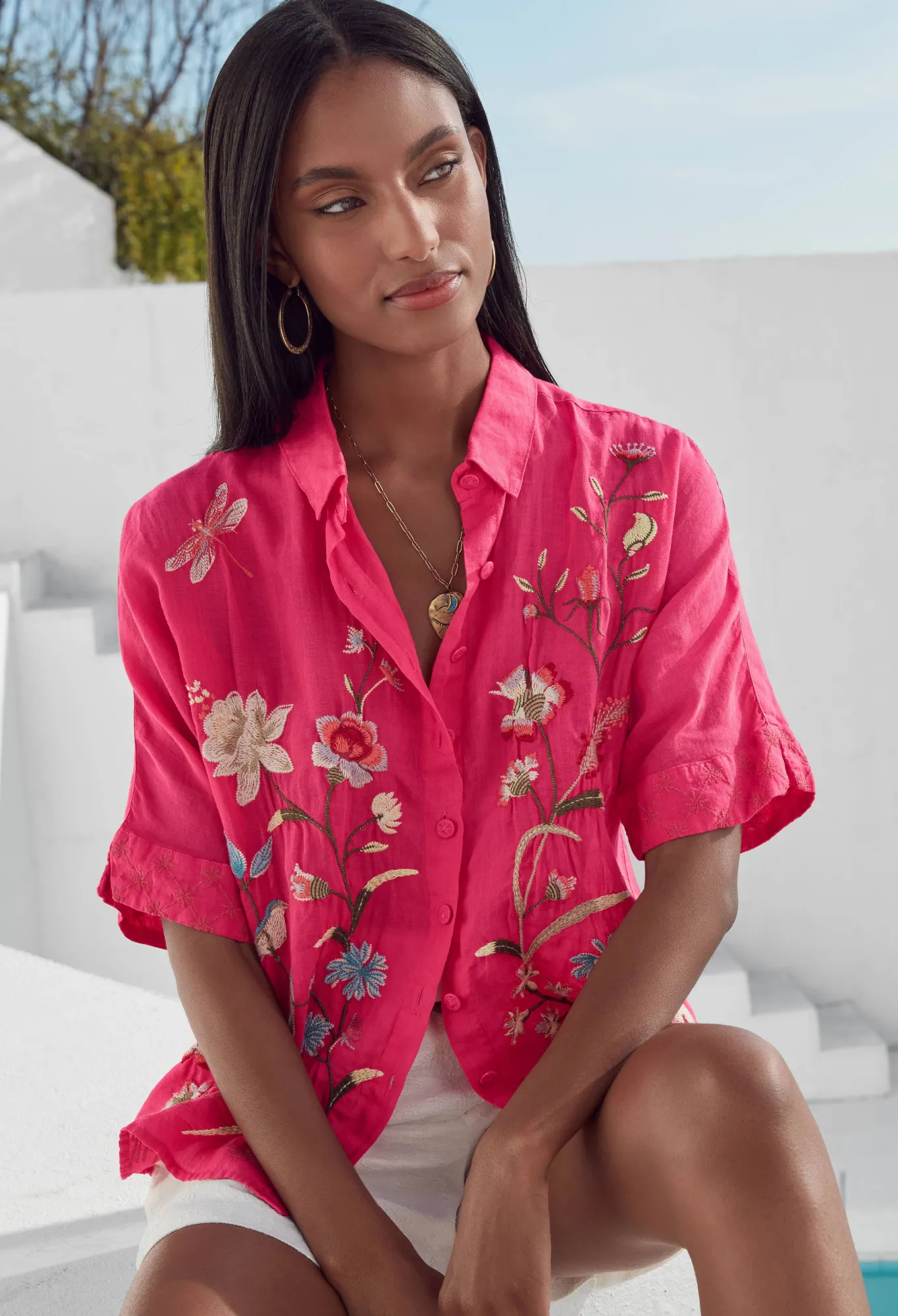 Designed From Breathable Ramie, The Geniveve Relaxed Dolman Shirt Reworks Traditional Shirting With Blossoming Florals. Cut In A Relaxed Fit, This Shirt Features A Collar, Three-Quarter Length Sleeves, And A Detailed Placement Embroidery Comprising Elegant Flowers. Pair With Relaxed Pants For An Effortless Day-To-Night Look.