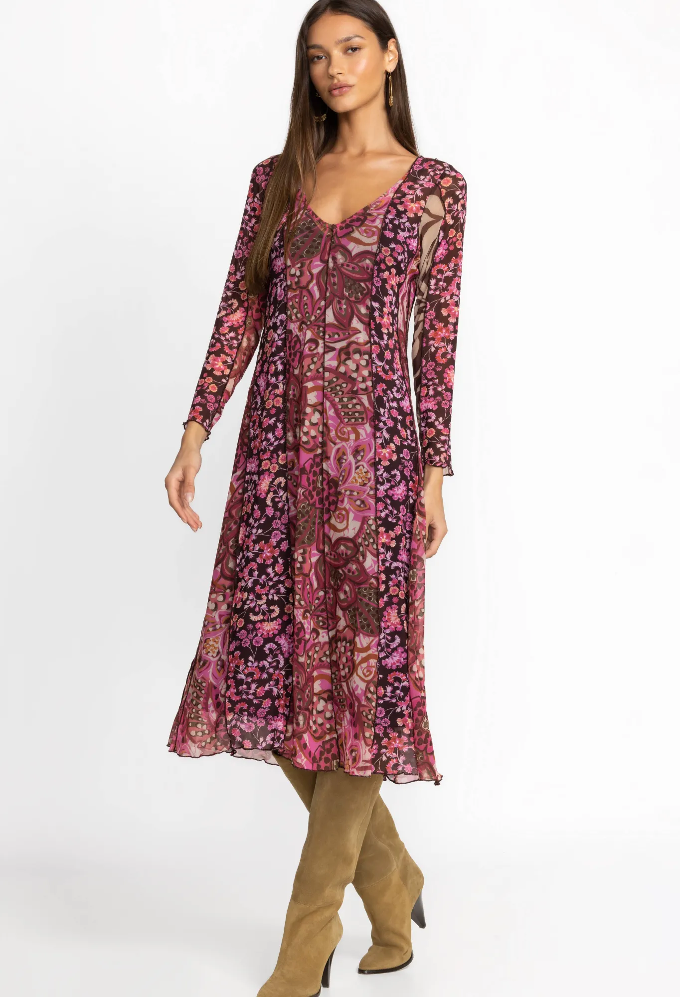 Underpinned With A Femme Feel, The Agatha Mesh Midi Dress Plays With Color And Construction. Falling To A Midi Length, This Stretch Mesh Dress Features A V-Neck, Long Sleeves, A Paneled Construction, And A Striking Pattern In Pink And Red Shades. Style This Dress With A Low Heel And A Clutch For A Fashion-Forward Occasion Ensemble.