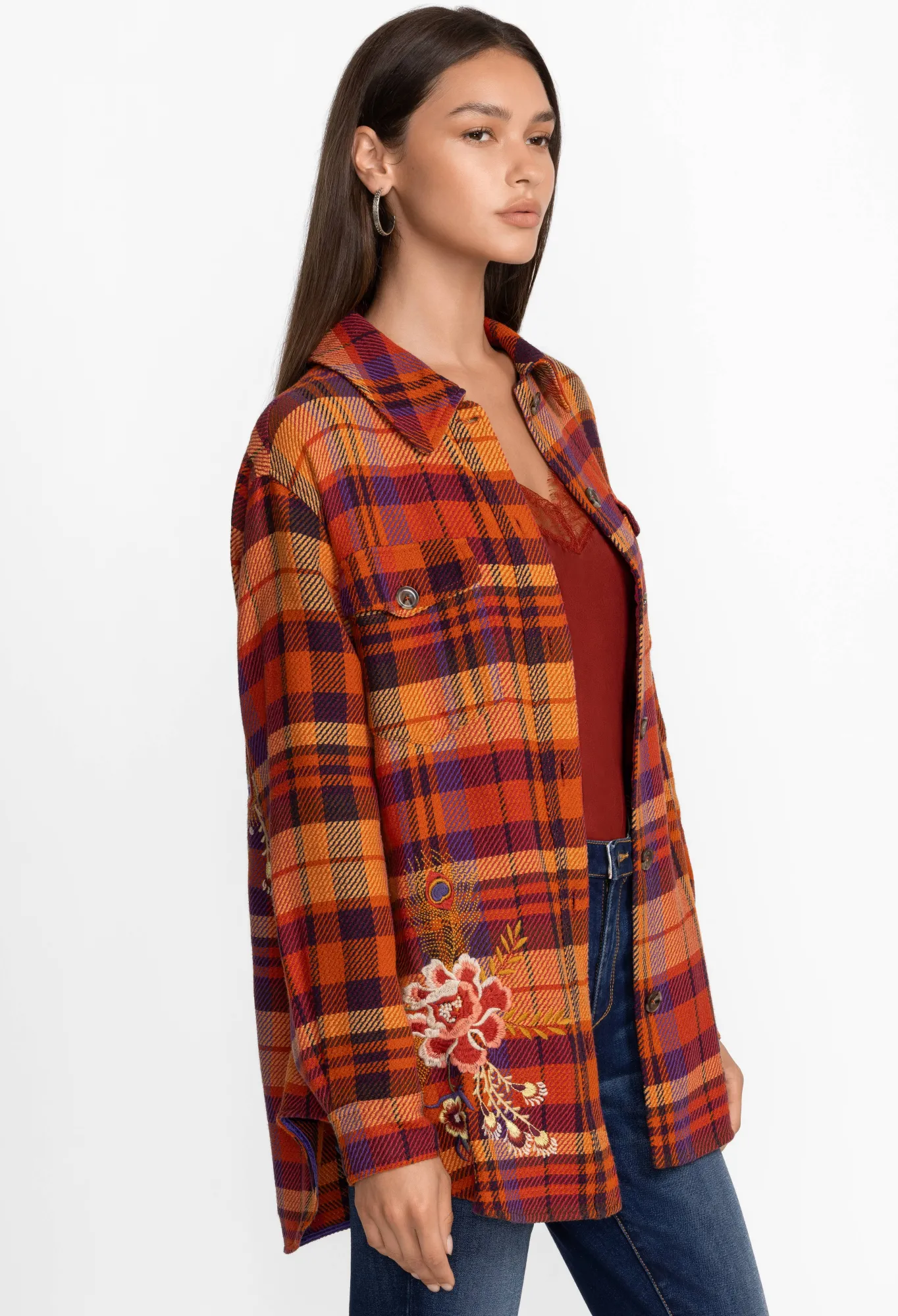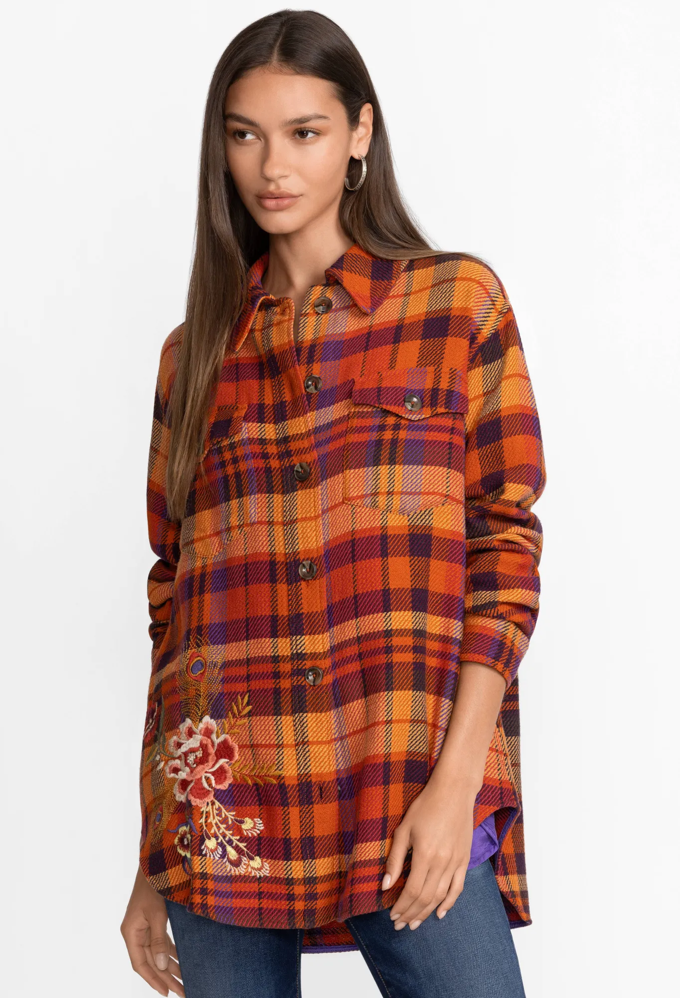 Crafted From A Breathable Cotton Blend, The Ananke Shirt Jacket Breathes New Life Into Classic Checks. A Statement Style For Cooler Days, This Shirt Jacket Features A Collar, Long Sleeves, A Front Button Closure, A Chest Pocket, Side Pockets, A Check Print, And A Lively Floral Placement Embroidery. Style This Shirt Jacket With A Dress On Brighter Days Or Layer Under A Coat When The Temperature Drops.