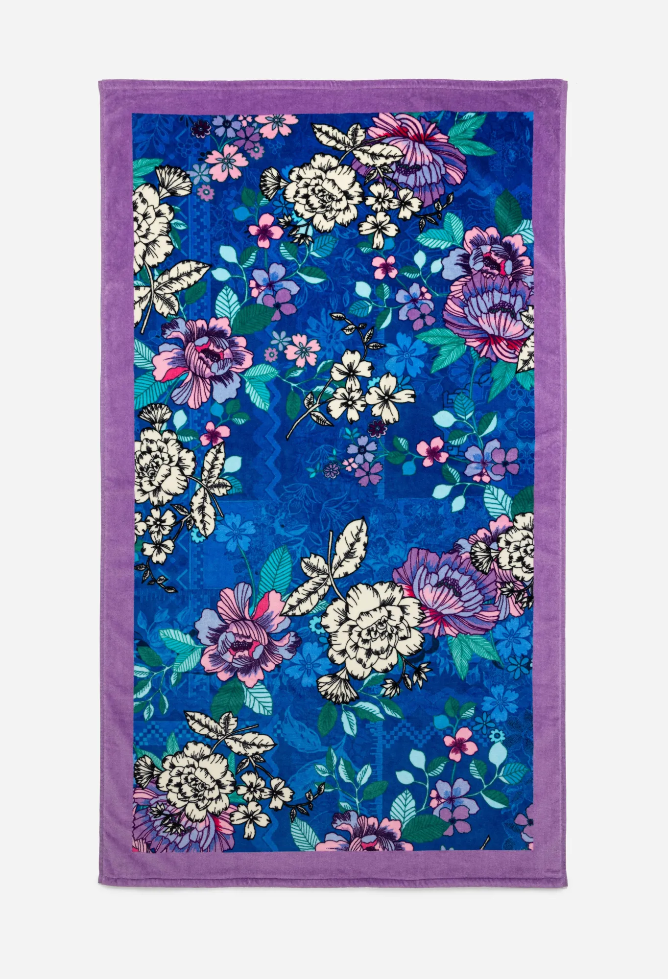 A Rich Medley Of Color, The Blue Dove Beach Towel Instantly Calls To Mind Warmer Climes And Sunny Escapes. Designed From Soft, Absorbent Cotton, This Beach Towel Is Characterized By A Blue, White, And Lilac Floral Pattern That Sits Within A Lilac Border. Use This Towel On Your Next Sandy Vacation Or Spa Day.