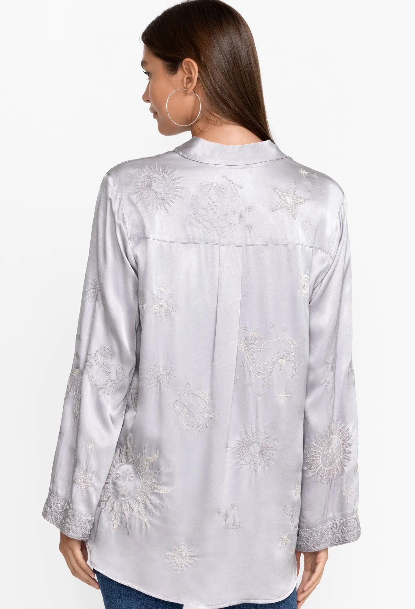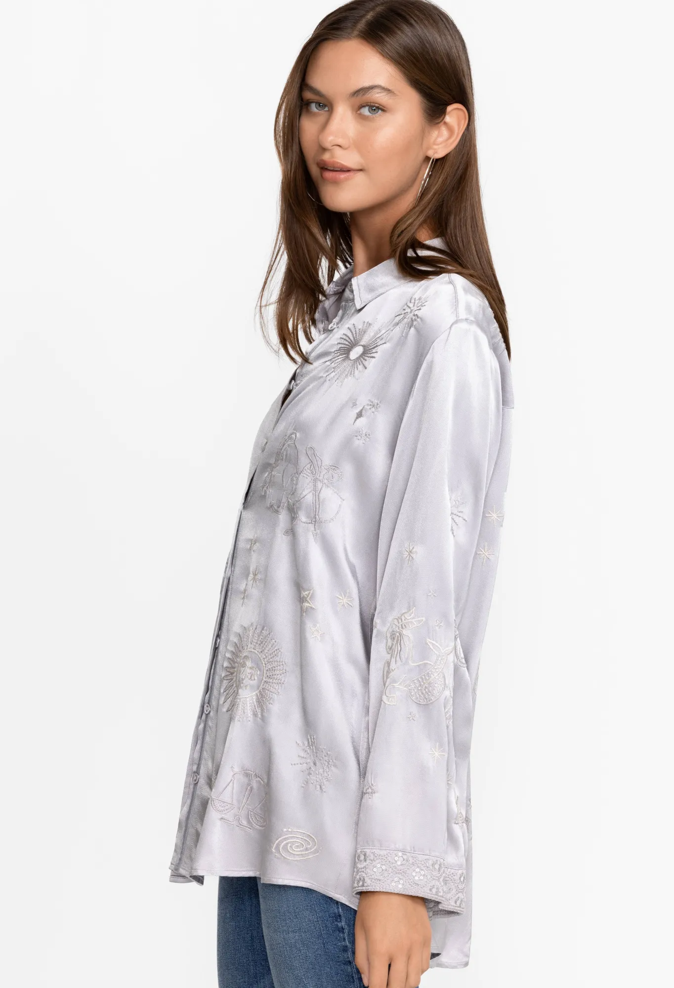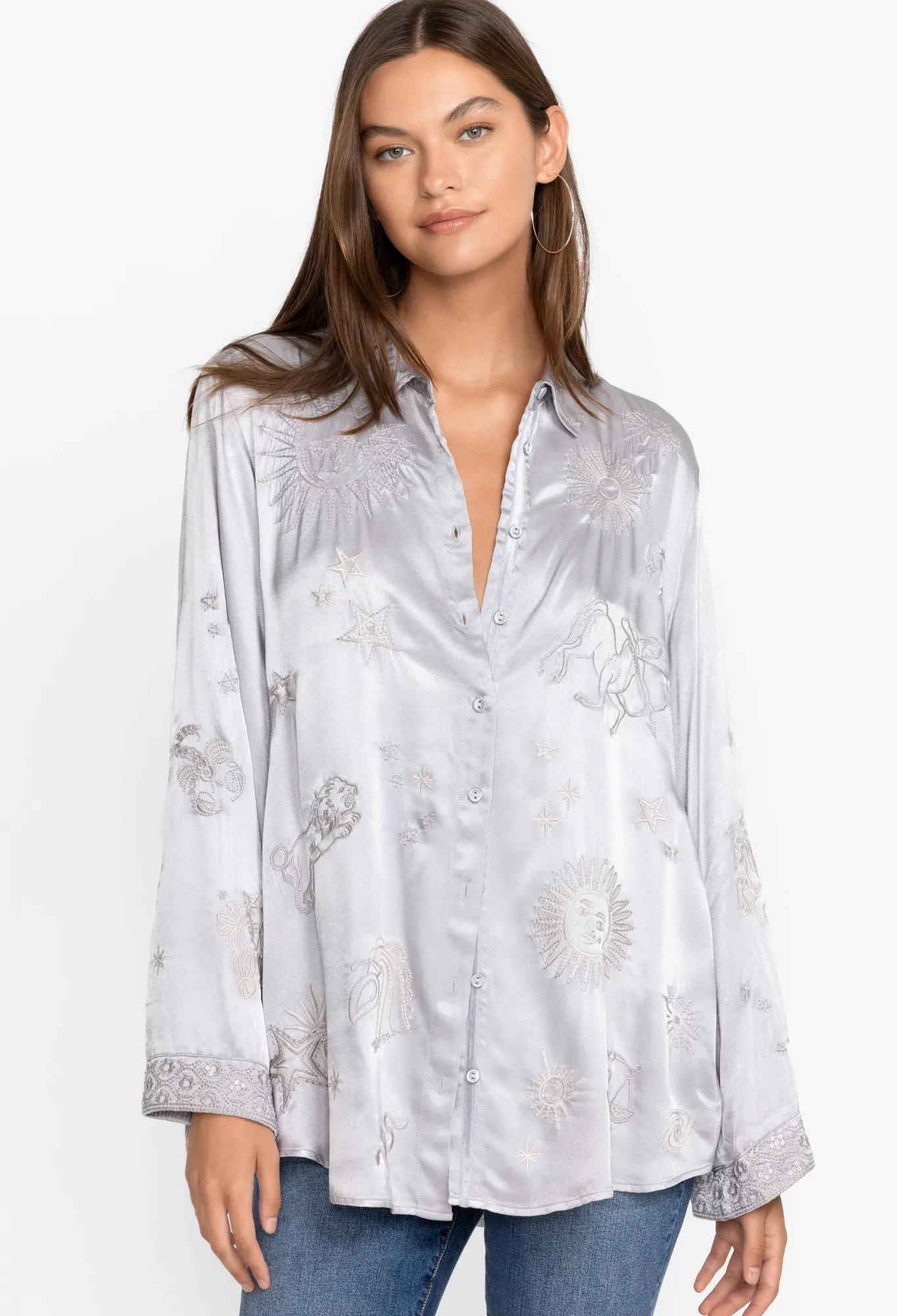 Imagined In Midnight Black, The Estrella Kimono Sleeve Oversized Shirt Is A Luxe Must-Have For The New Season. A Rich Mix Of Unexpected Design Details, This Shirt Is Cut For An Oversized Fit And Features A Collar, A Front Button Closure, Long Sleeves, Fabric Covered Buttons, And An Eye-Catching Placement Embroidery With Sequin Details For A Sparkling Touch. Pair This Shirt With Straight Pants For A Relaxed Take On After-Dark Fashion.