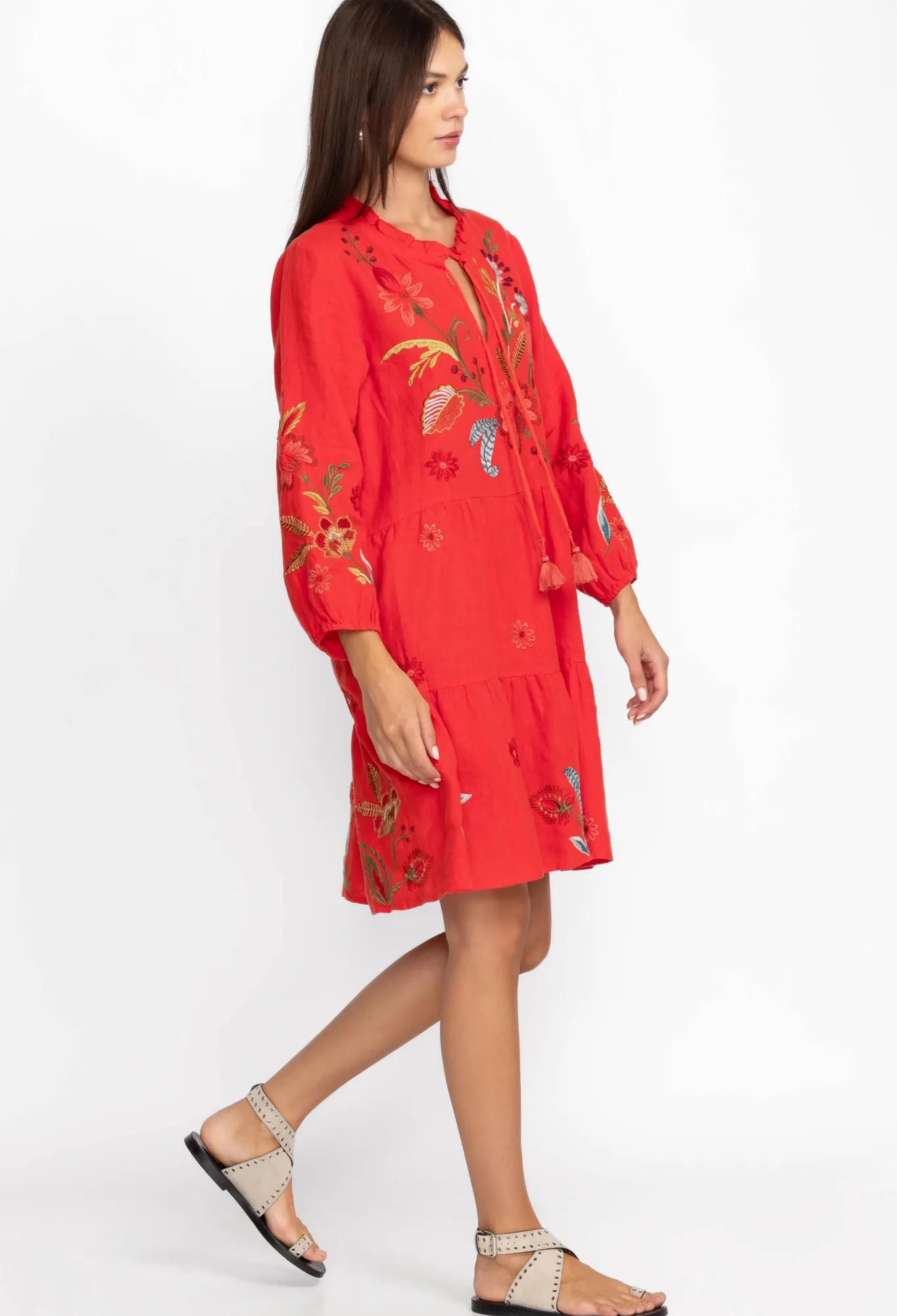 Underpinned With A Sense Of Care-Free Insouciance, The Isabella Tiered Field Dress Takes Your New Season Wardrobe In A Vibrant Direction. Enlivened By A Detailed Floral Placement Embroidery, This Tiered Dress Is Crafted From Breathable Linen With A Tie Front And Tassels And Long Sleeves. Pair This Dress With Flat Sandals For A Bohemian Daytime Look.