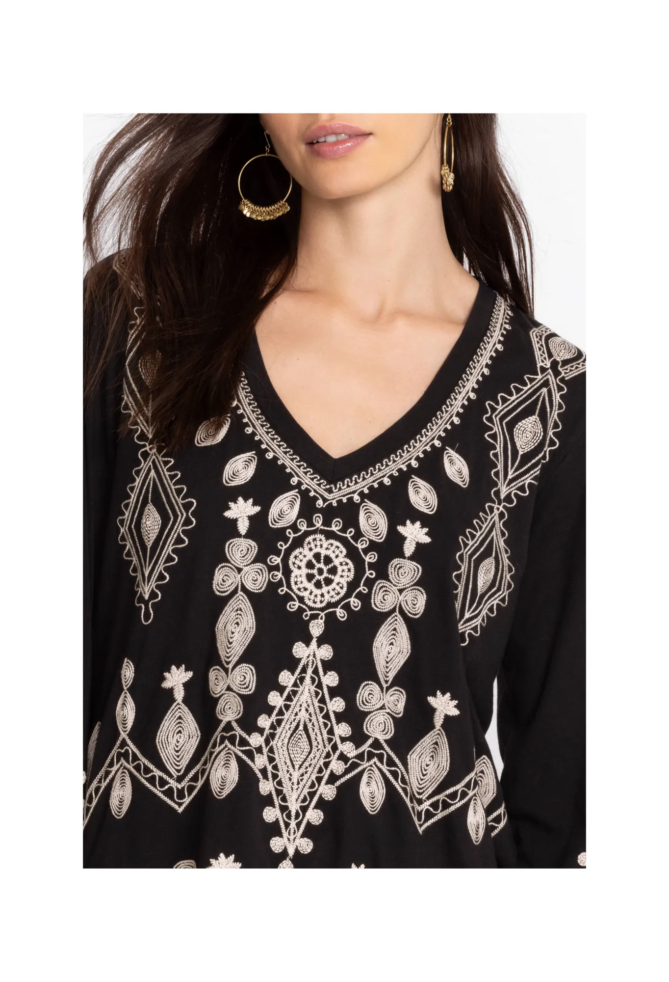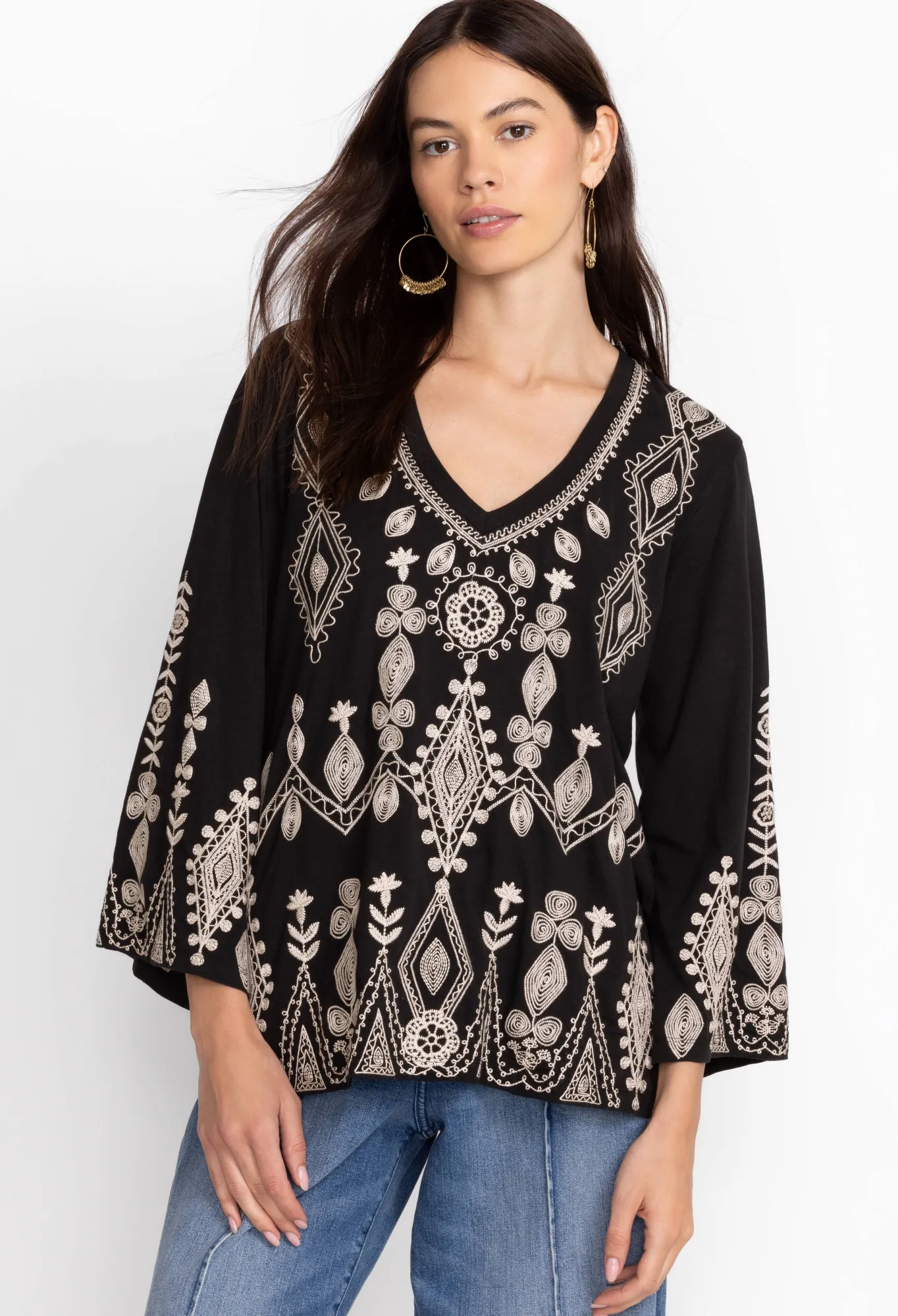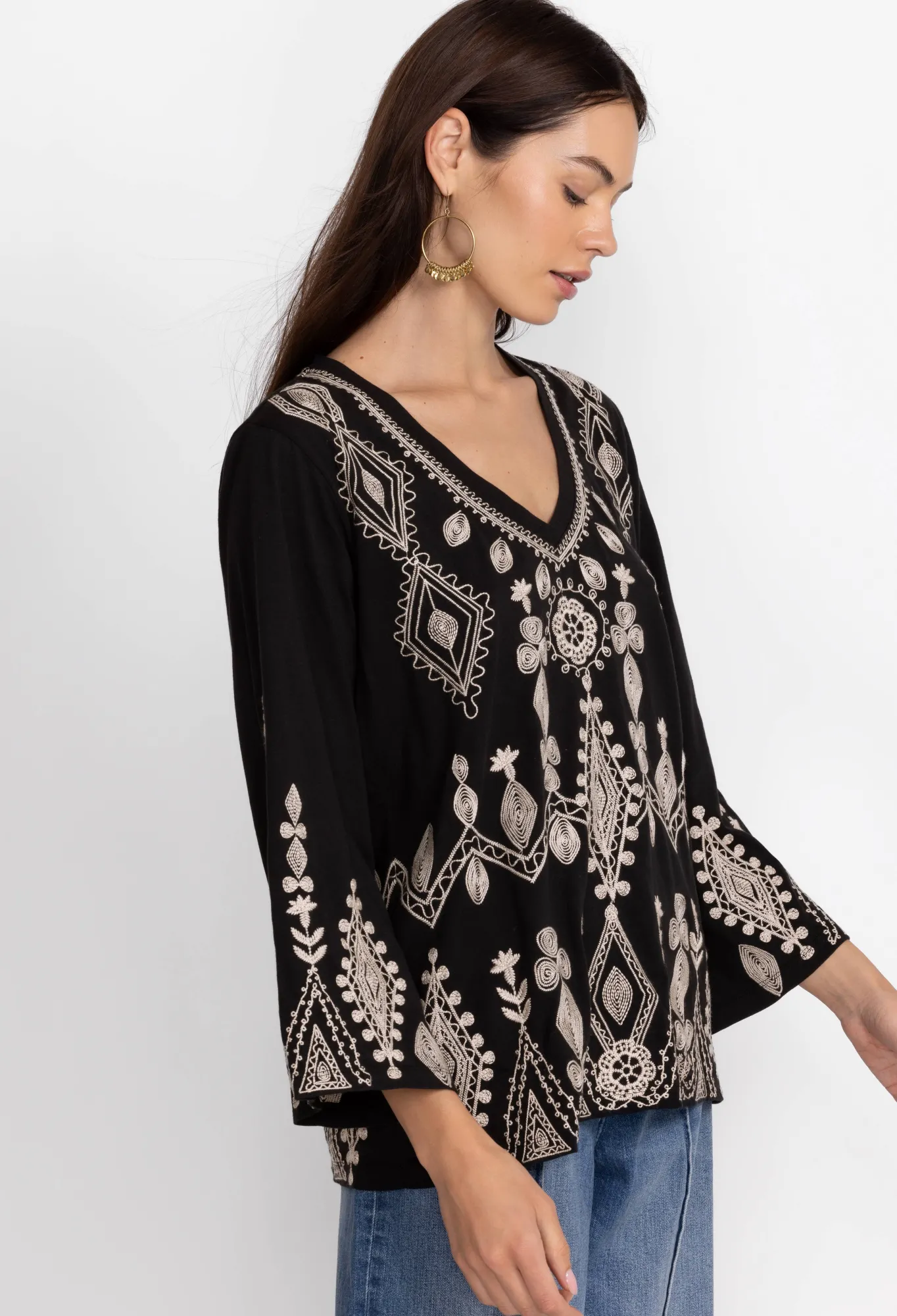 Designed From Pure Cotton, The Liona V-Neck Kimono Sleeve Tee Transforms A Simple Cut Into A Hypnotic Must-Have. A Monochromatic Delight, This Tee Is Enhanced By Long Kimono Sleeves And Features A Flattering V-Neck And A White Placement Embroidery Comprising Florals And Striking Shapes. For A Nonchalant Daytime Outfit, Style This Tee With Blue Denim And Statement Hoop Earrings.