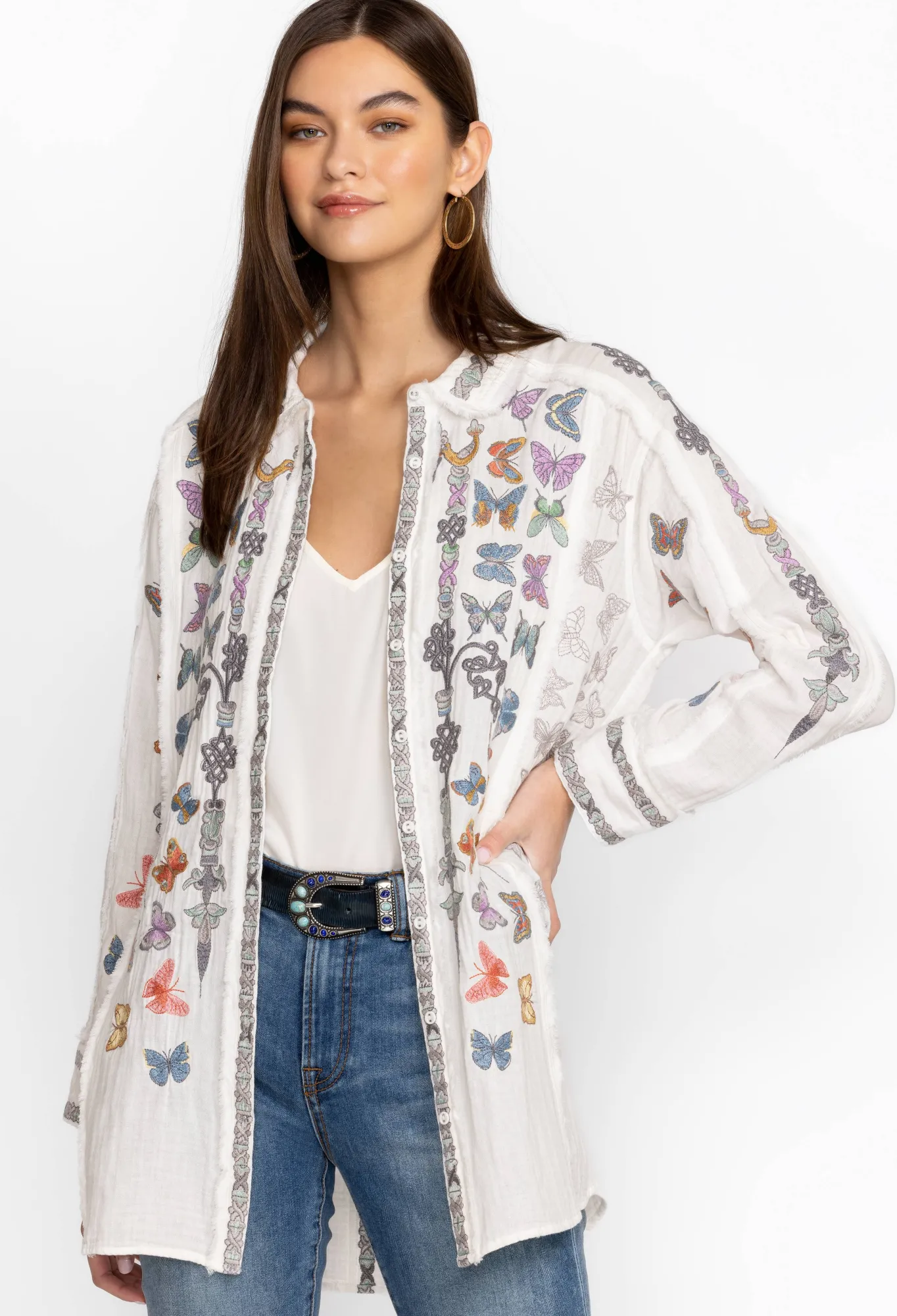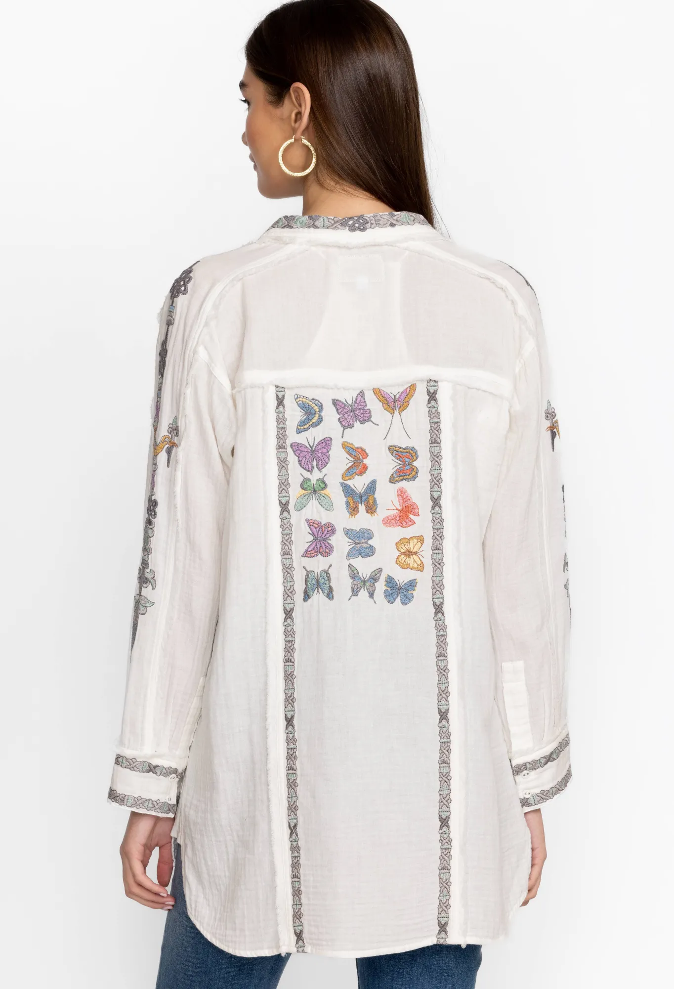 Made From Pure Cotton, The Talia Tunic Turns To The Natural World For Inspiration. A Versatile Yet Statement-Making Style, This Tunic Features A Collar, A Front Button Fastening, Long Sleeves With Buttoned Cuffs, And A Bright Placement Embroidery Comprising Fluttering Butterfly Motifs For A Playful Finish. Wear With Denim Or Layer Over Tailored Pants For An Elevated Daytime Look.