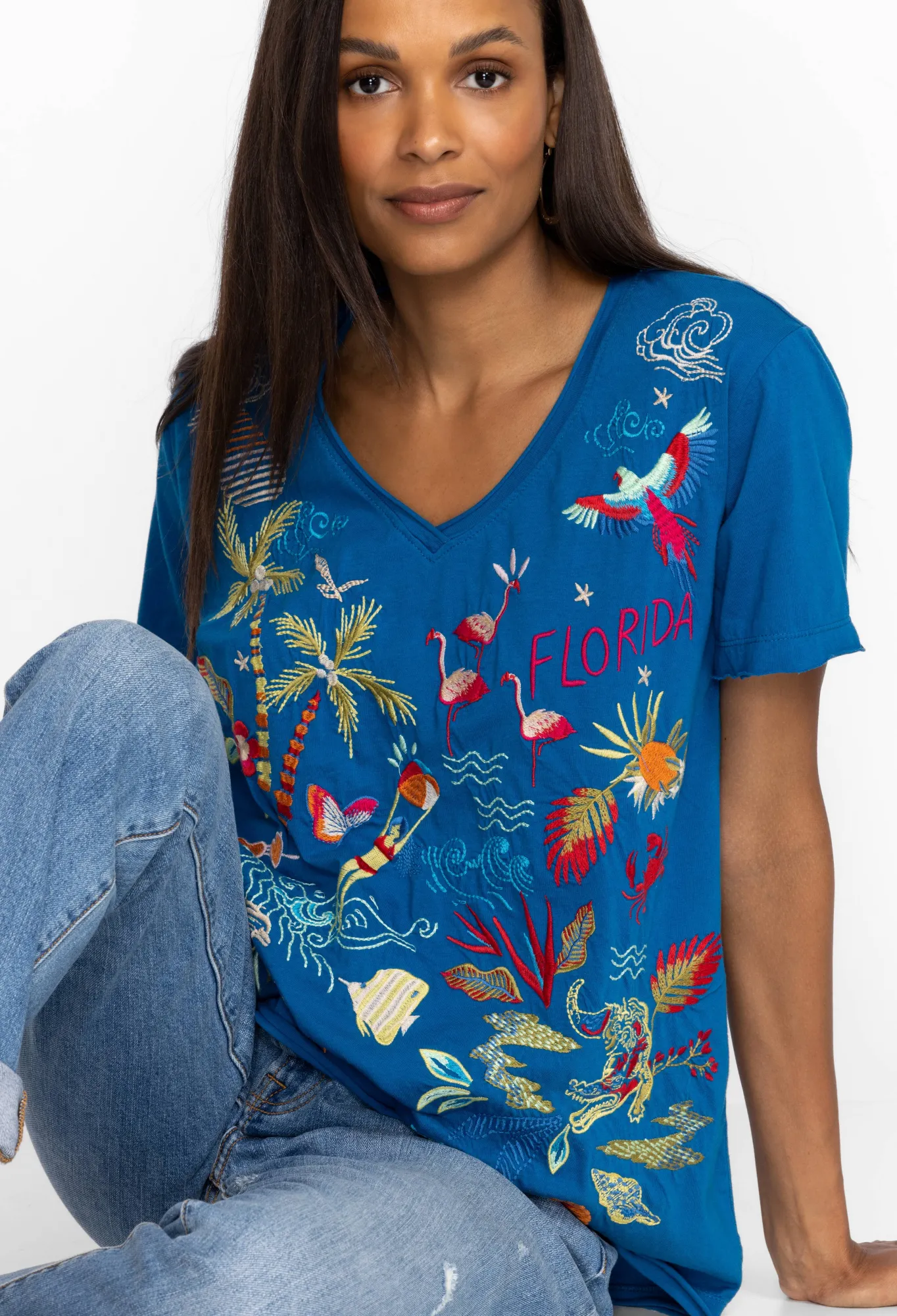 Honoring Warm Tropical Breezes And White Sand Beaches, The Florida Cap Sleeve Tee Is A Stunning Reminder Of The Wonders Of The Sunshine State. A Perfect Blend Of Whimsical Placement Embroidery And 100% Breathable Cotton, This Tee Is A Travel Wardrobe Must-Have. Pair With Linen Palazzo Pants And Wedge Sandals For The Warmest Days.