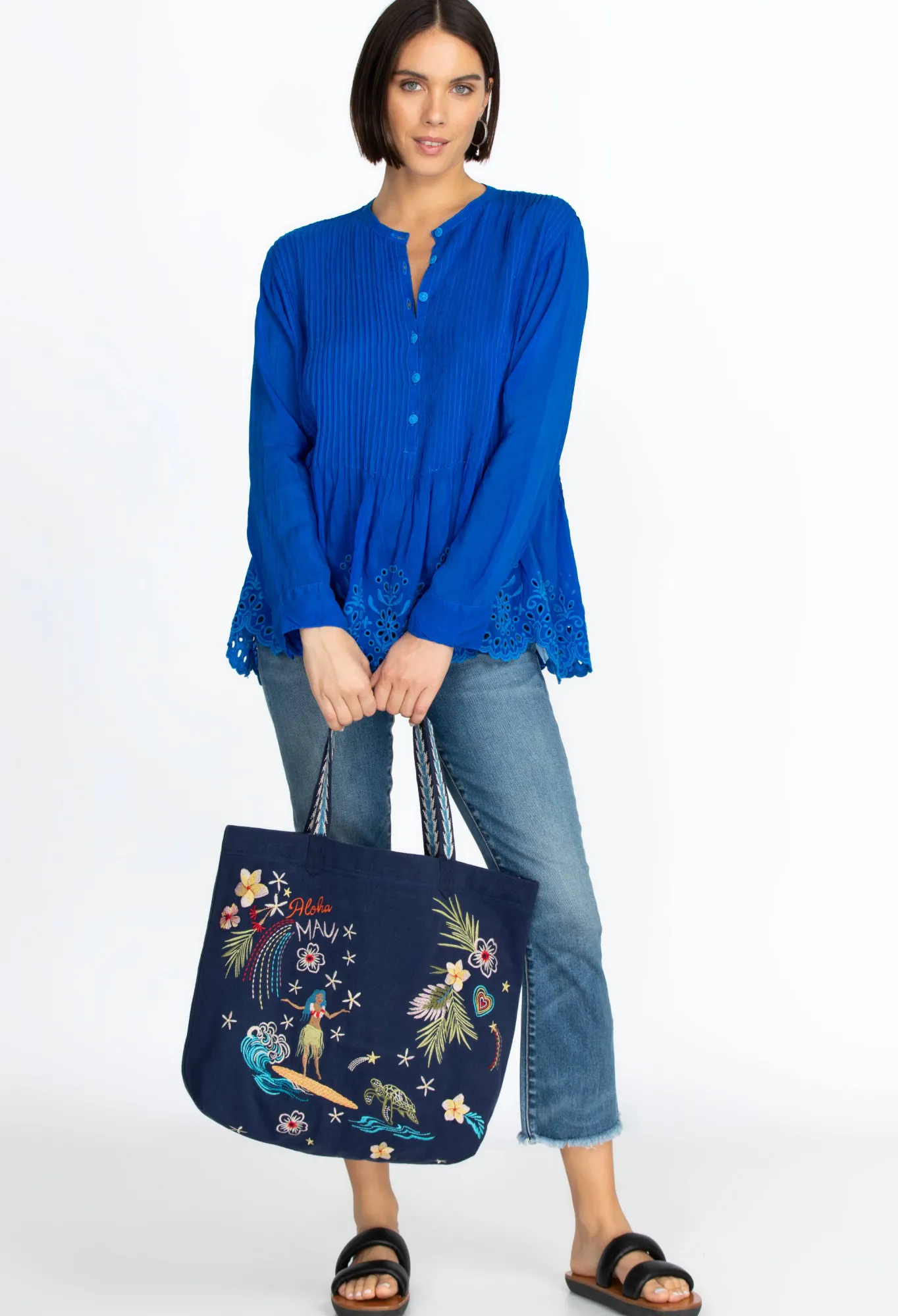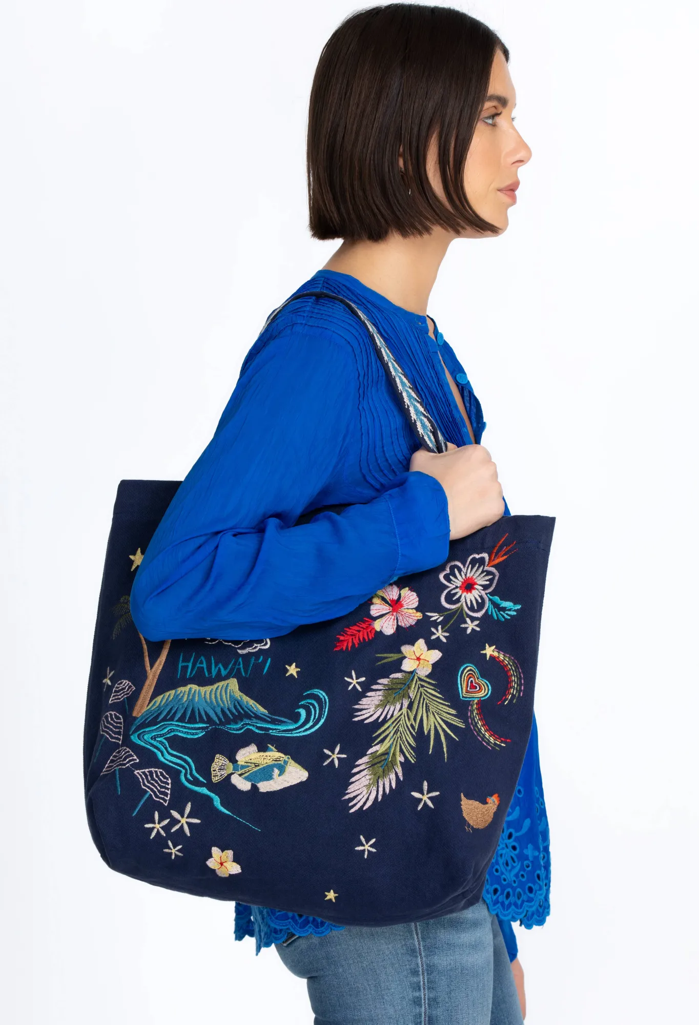 Embodying Beautiful Tropical Color Against A Rich Field Of Blue, The Hawaii Everyday Tote Is The Perfect Way To Celebrate The Islands. Crafted From 100% Cotton And Adorned With Floral Displays And Island Scenes This Tote Features Interior Zip Pocket For Smaller Items. Add This Accessory To Your Favorite Linen Ensemble For A Beach-Ready Vibe.