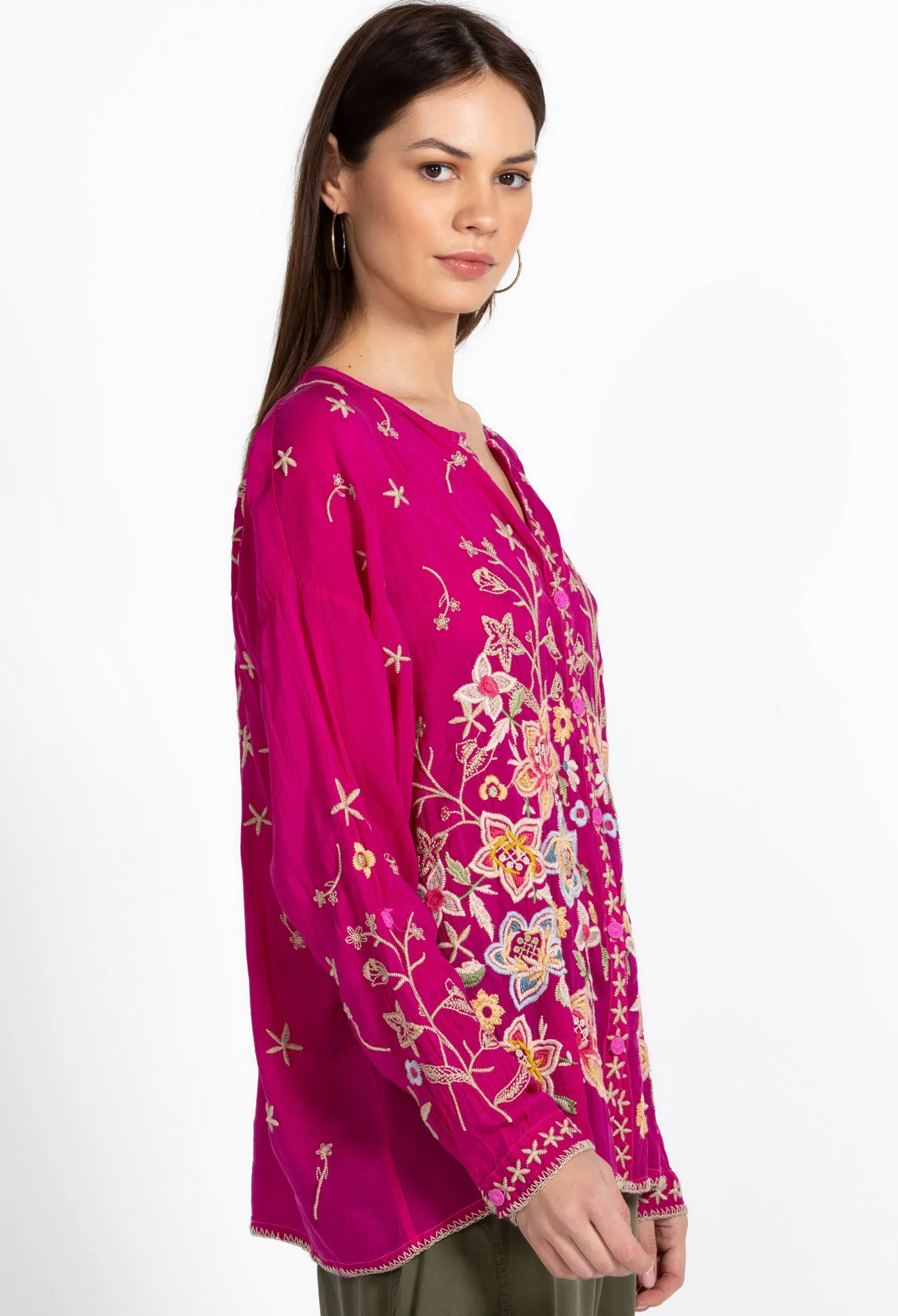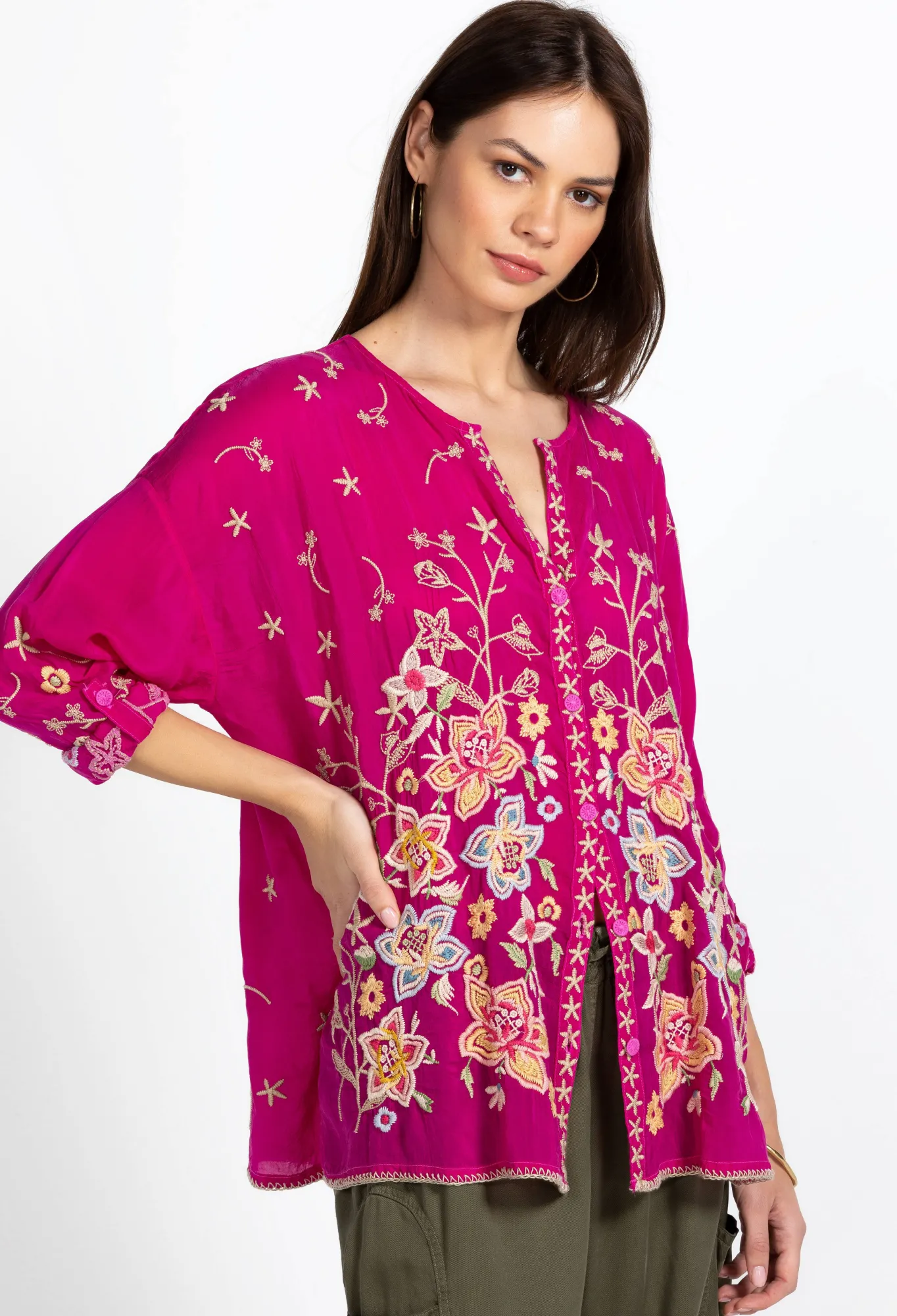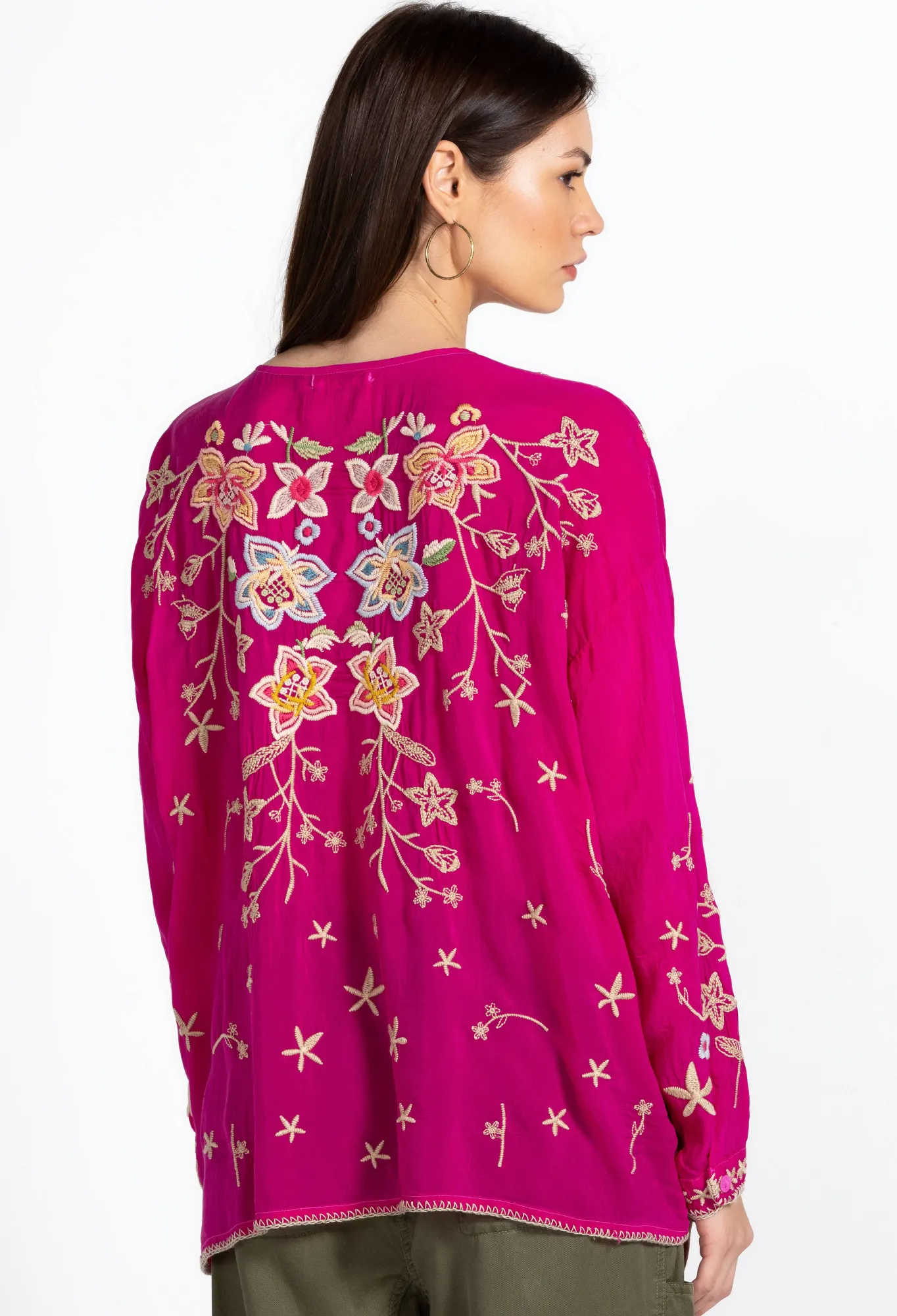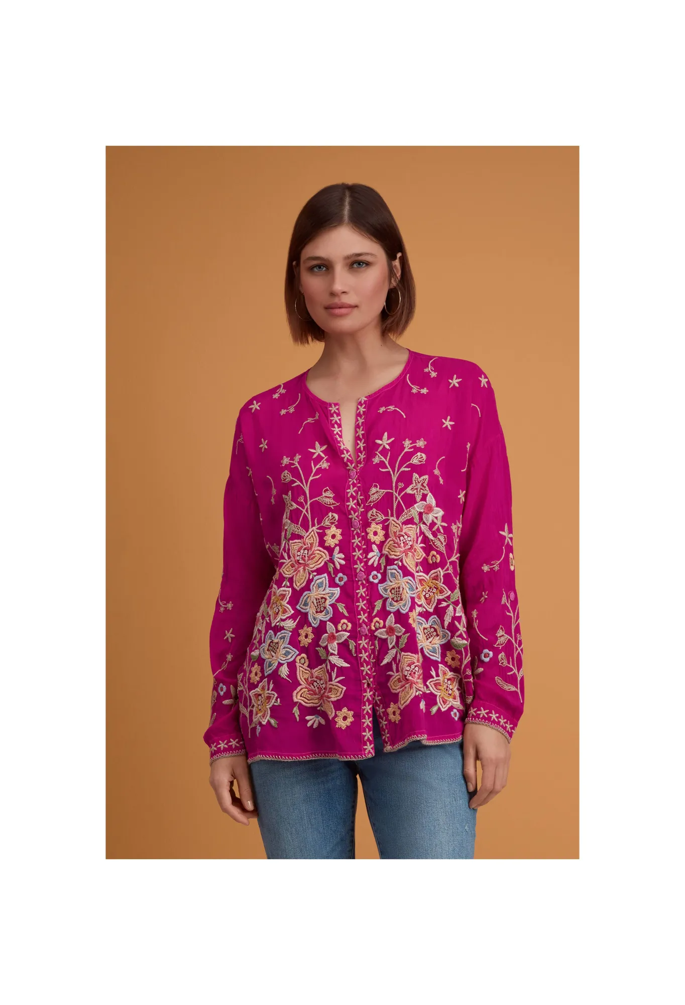 Relaxed In Its Construction And Bold In Color, The Jenai Blouse Is Emphasized By Antique Florals In Rich Hues. Equal Parts Casual And Elegant, This Blouse Is Made From Flowy Rayon With An Open V-Shaped Collar, A Front Button Fastening, Long Sleeves, And An Intricate Placement Embroidery. Throw On With Jeans For A Nonchalant Daytime Look Or Pair With Shorts On Your Next Warm Weather Escape.