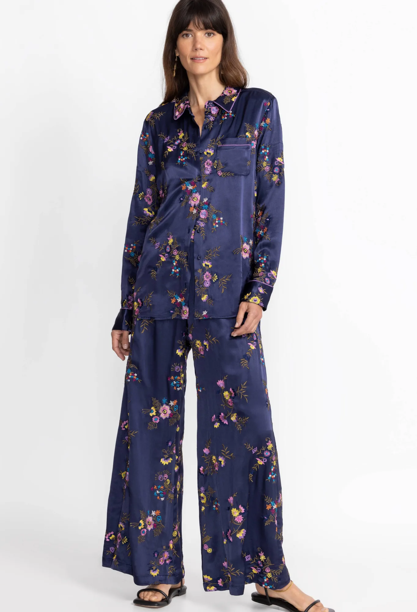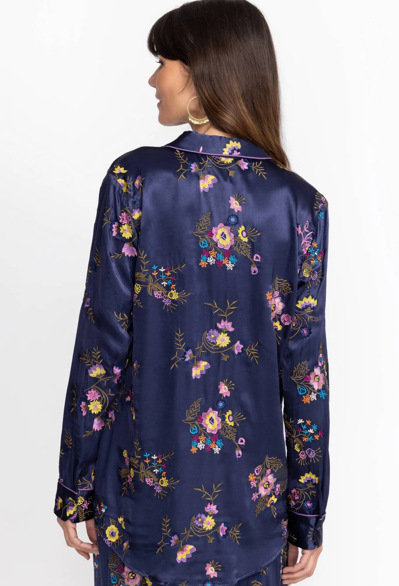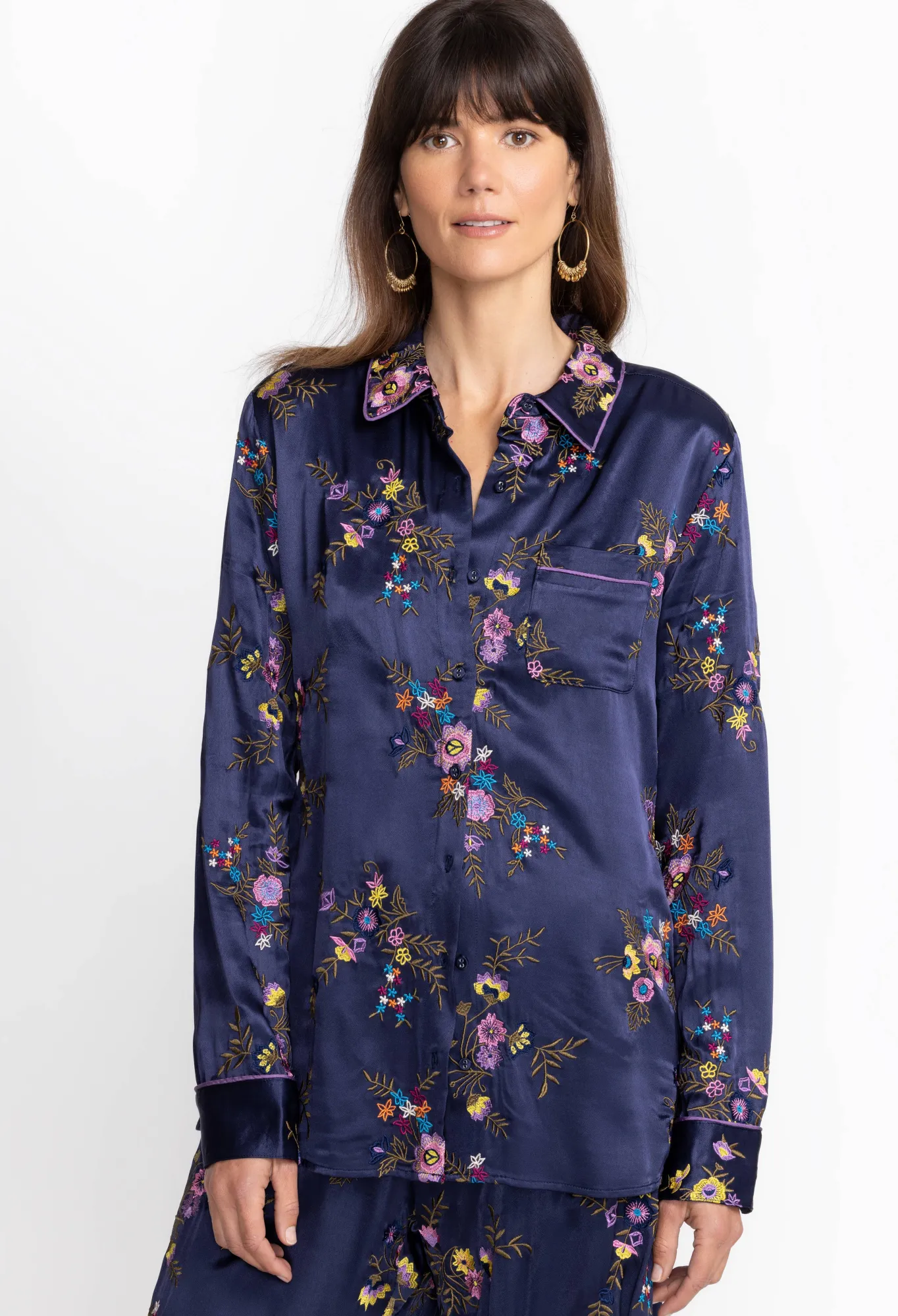 Offering A Classic Silhouette Decorated With Vibrant Cascading Bouquets, The Misty Rayon Button Down Shirt Adds Color To Your Work Week. Crafted From Flowing Fabric And Accented By Unique Placement Embroidery, This Blouse Creates An Air Of Sophistication.Pair With Beige Slacks And Navy Flats For A Completed Work Look.