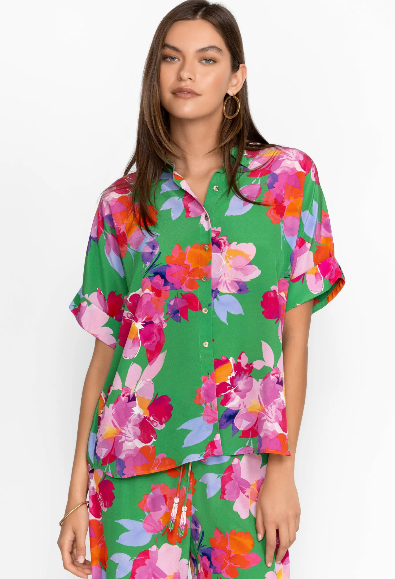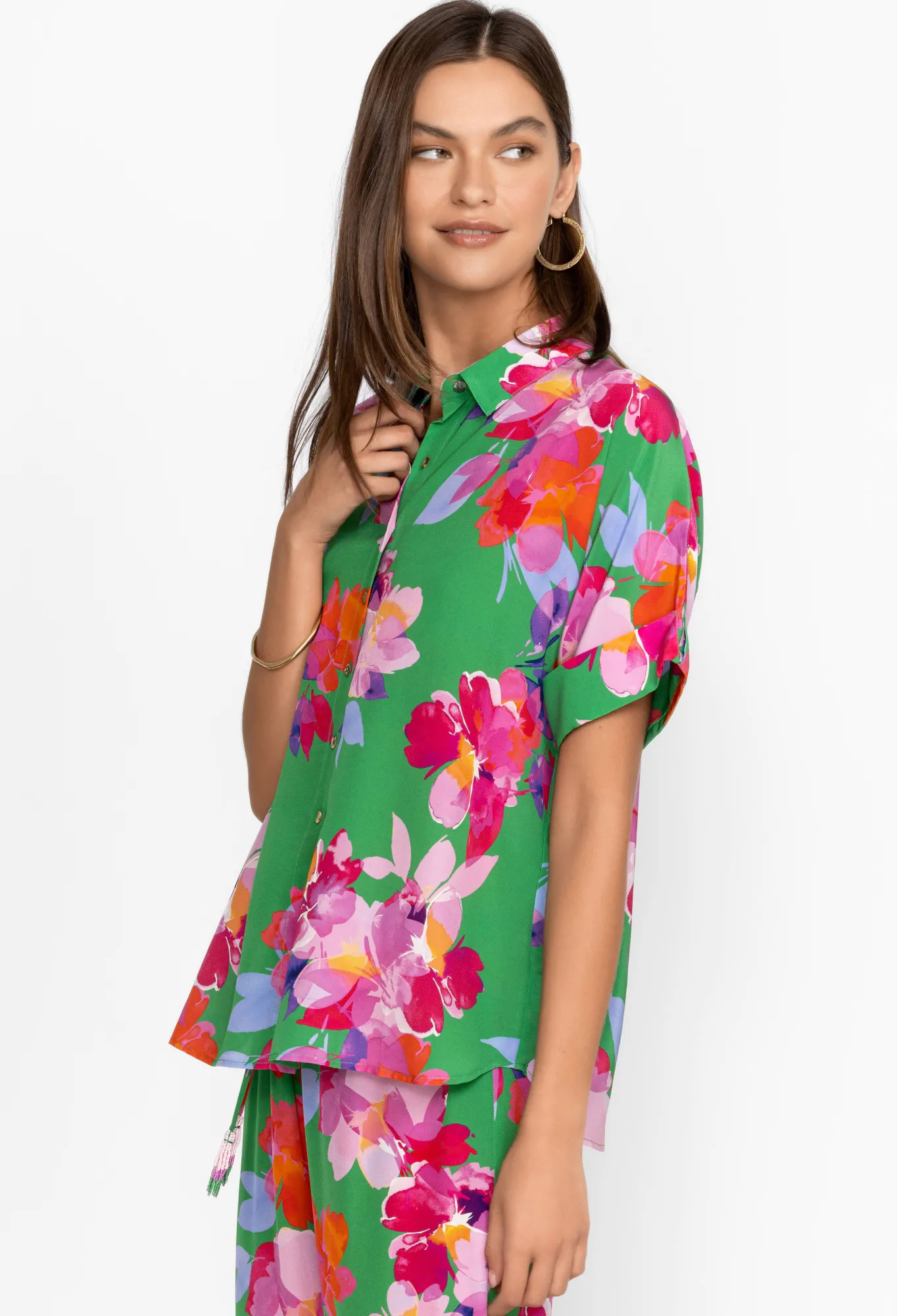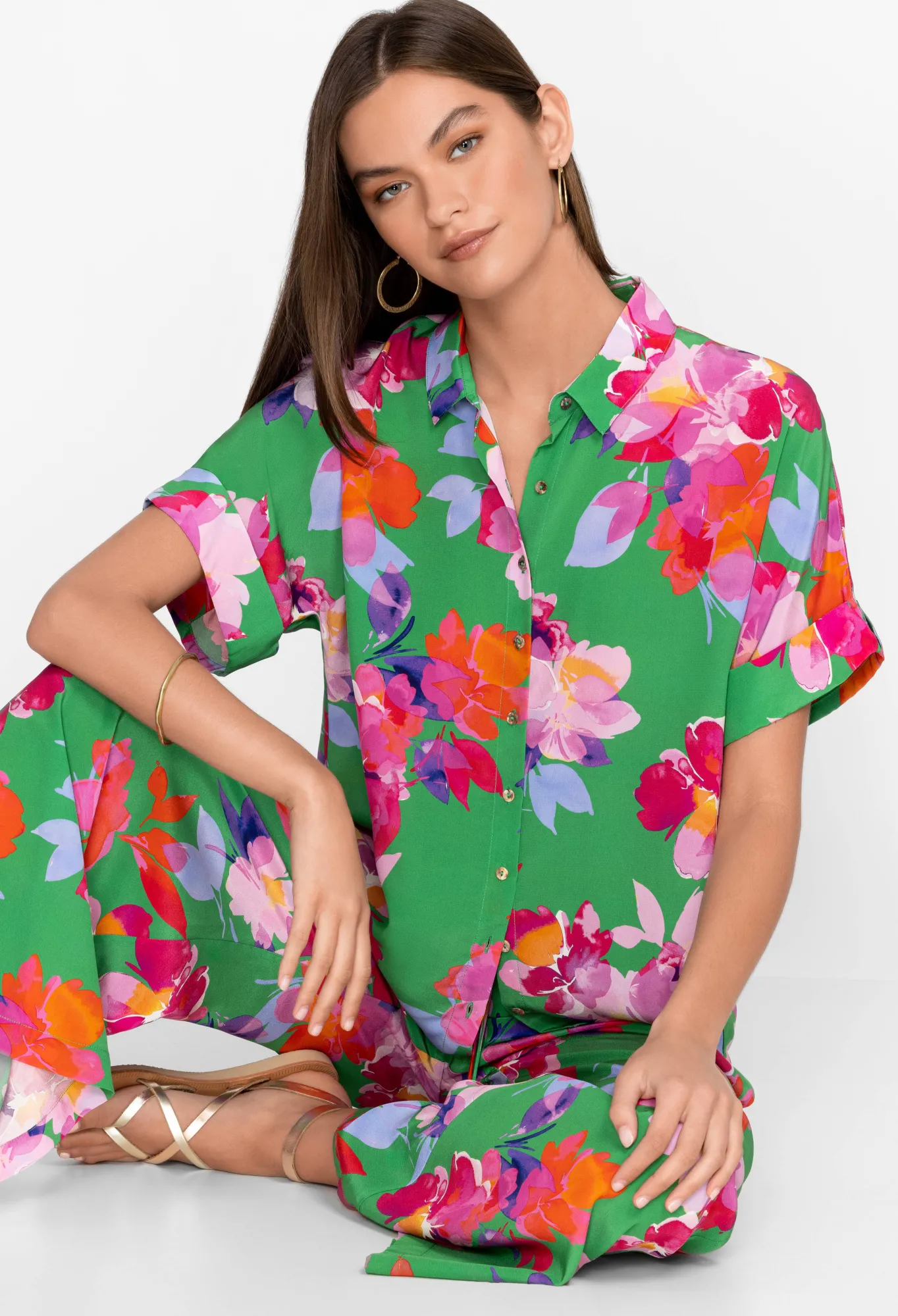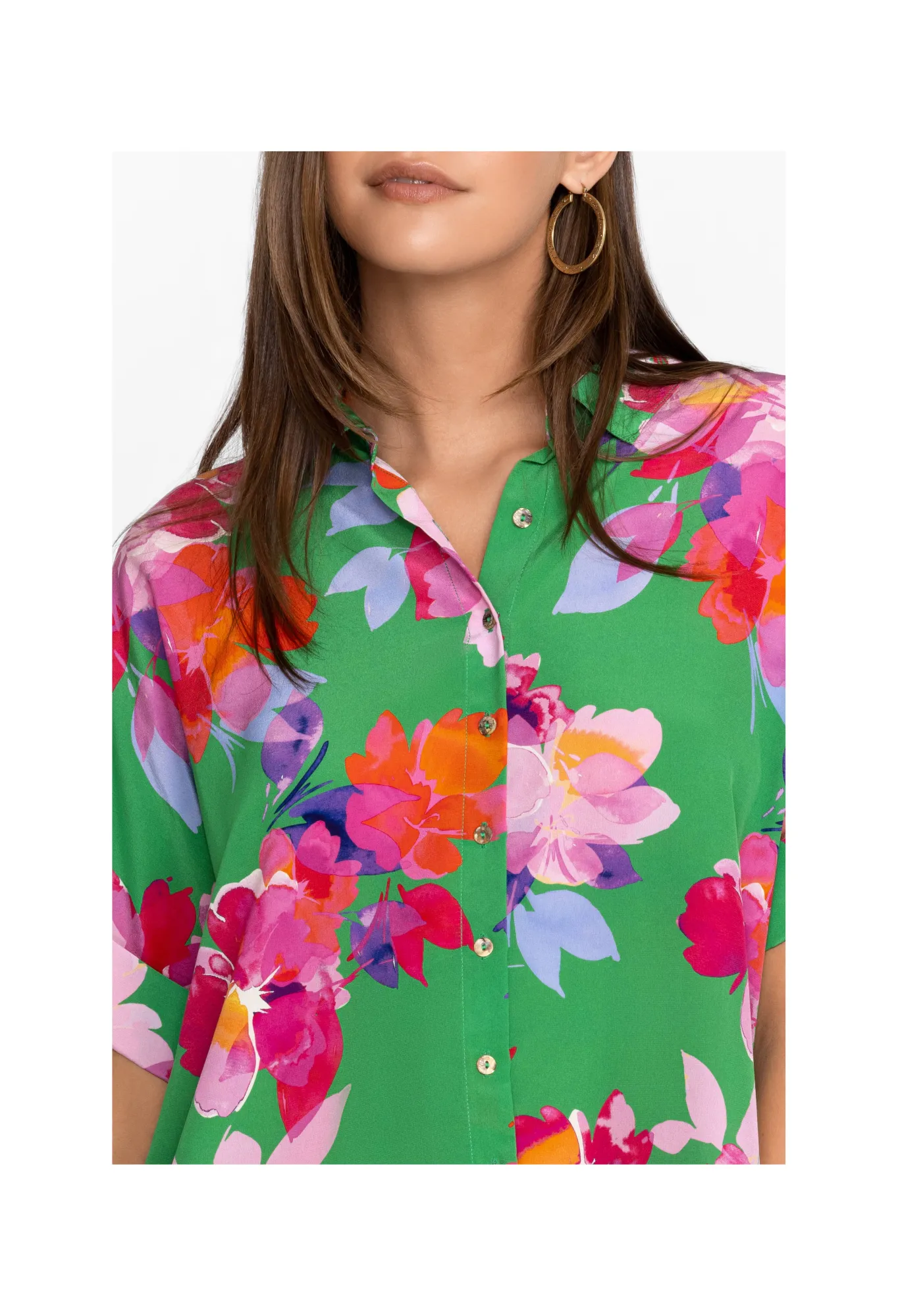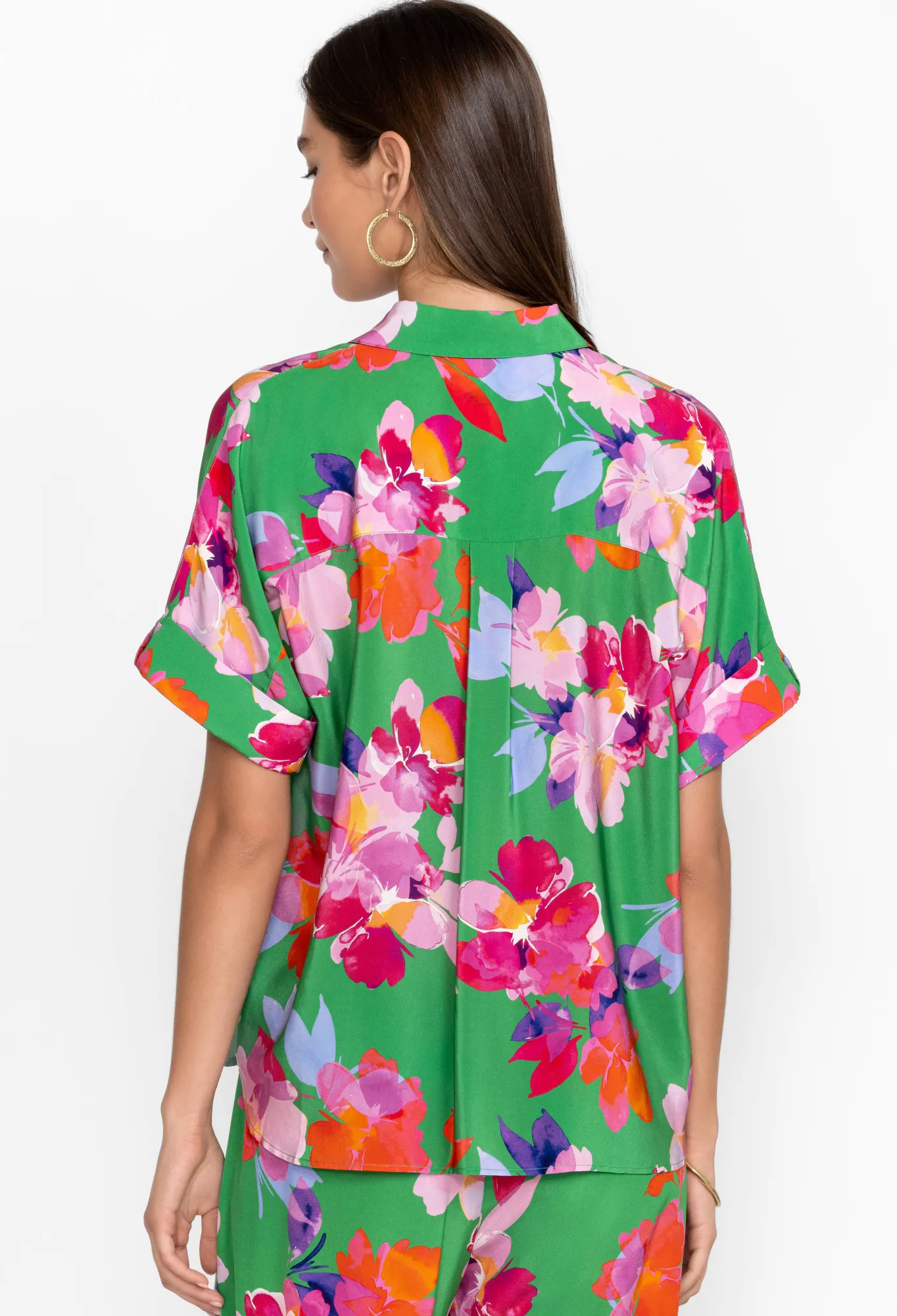 Radiate Cheerfulness And Optimism In The Vibrant Nadine Silk Shirt. A Striking Print For The New Season, The Colorful, Opened Blooms Pop Out Against A Saturated Green Background And Entwine Across The Front And Back Of The Shirt. Finished With A Collar, Short Sleeves, And A Button Front, This Skirt Is A Joyful Choice For Both Brighter Days And Vacations.