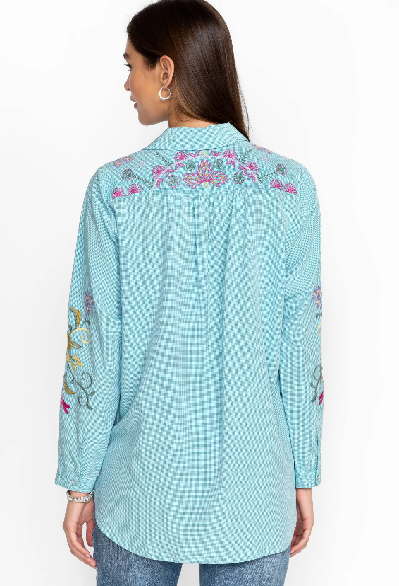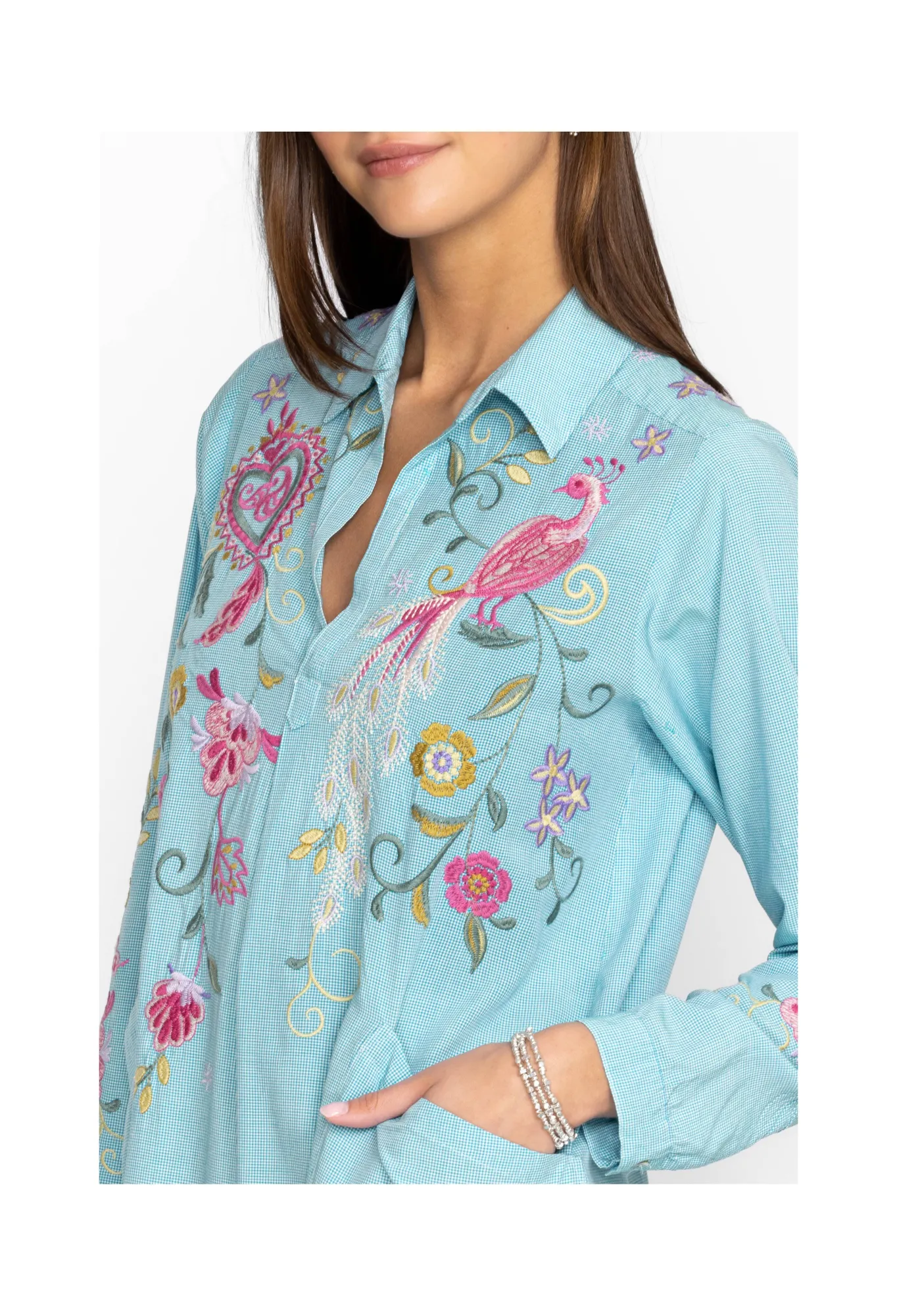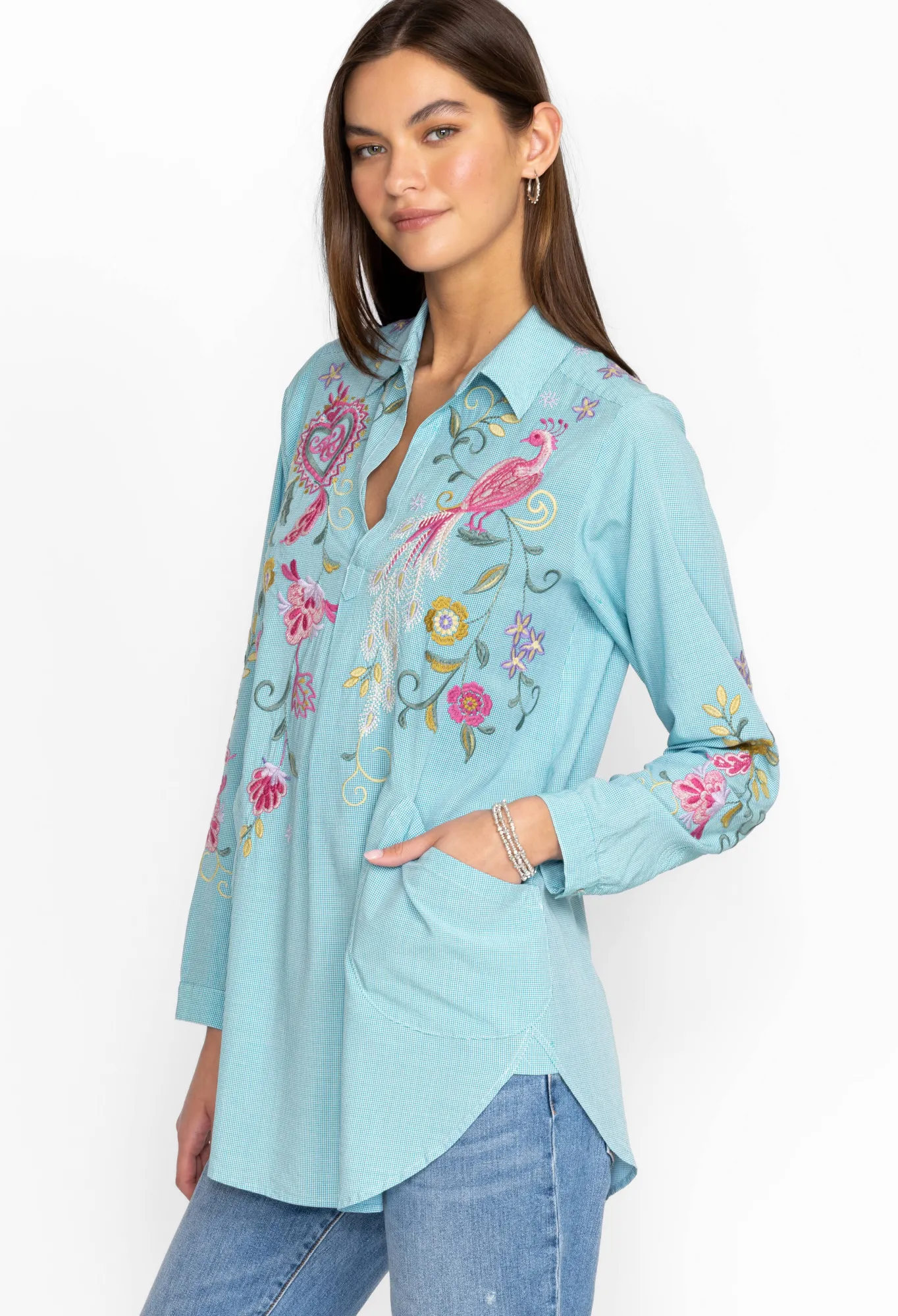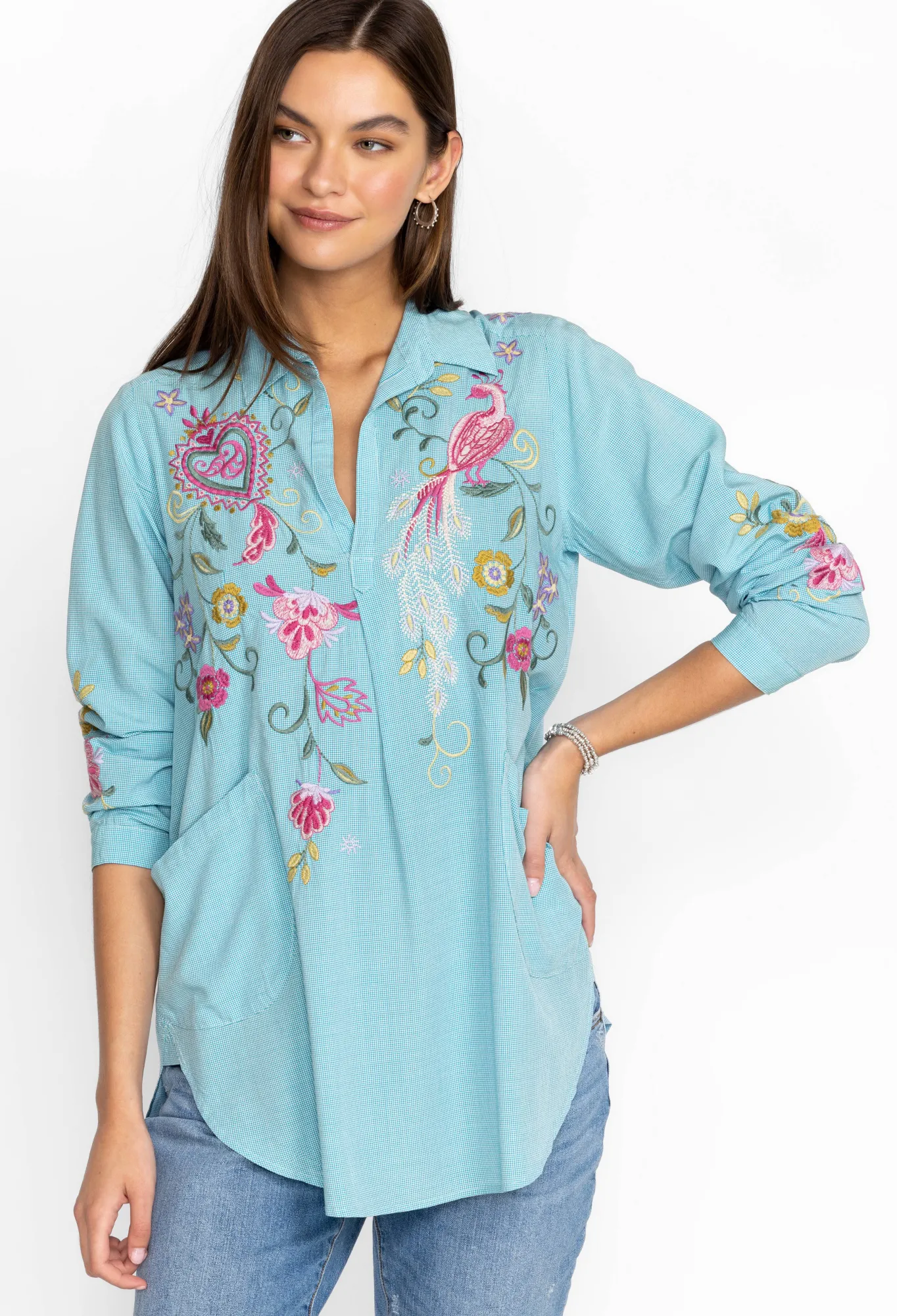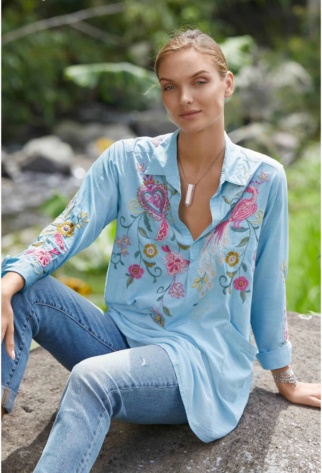 A Classic Silhouette Infused With Whimsy, The Ashlee Henley Popover Tunic Provides Relaxed Comfort With A Unique Approach To Feminine Detail. Wrapped In Delicate Placement Embroidery, This Blouse Offers Functional Pockets In An Inviting A-Line Shape. Pair This Tunic With Stretch Leggings And Pointed Flats For A Brunch Date.