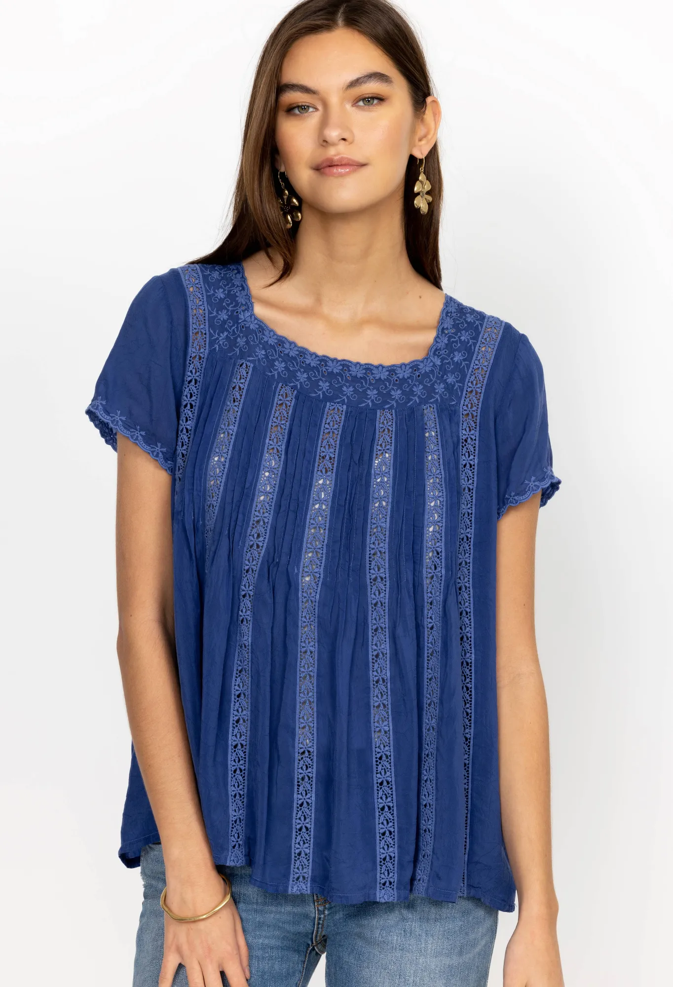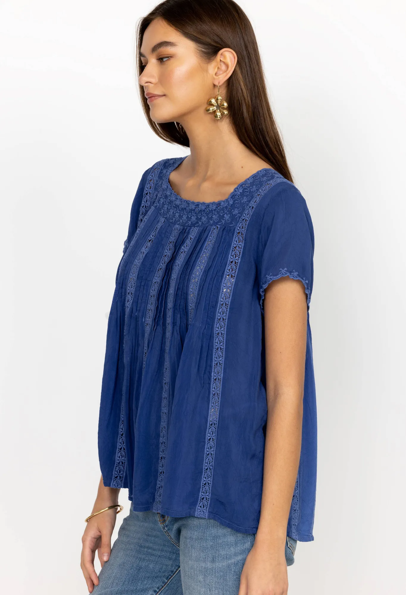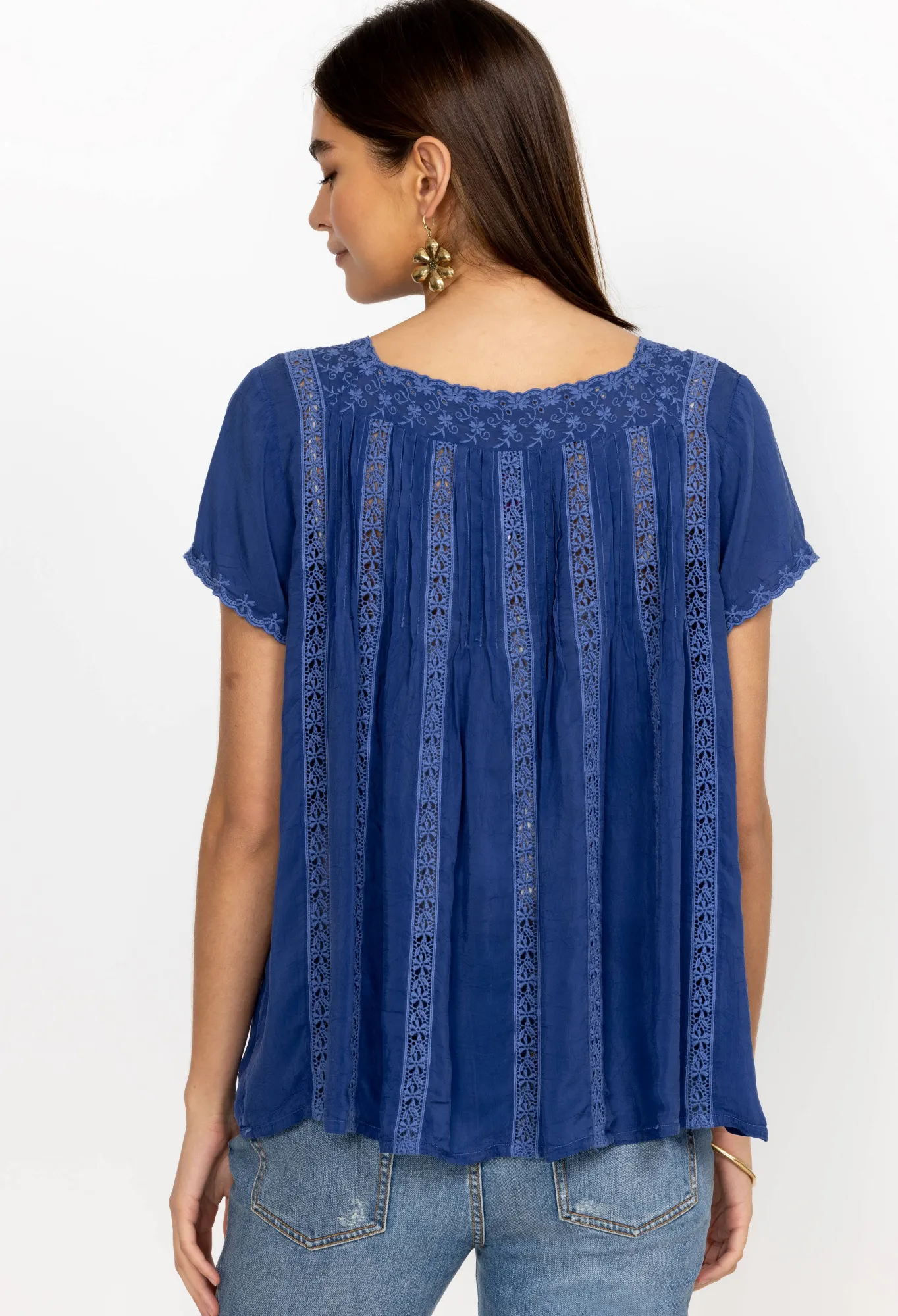 Steeped In Romance, The Brigita Blouse Fuses A Feminine Aesthetic With Delicate Design Details. Cut In A Straight Fit, This Blouse Is Enhanced By Intricate Trims Along The Edges Complete With Matching Vertical Trims And Pleats Through The Body. Keep This Elegant Blouse As The Main Focus By Pairing With Plain Pants Or A Plain Maxi Skirt.