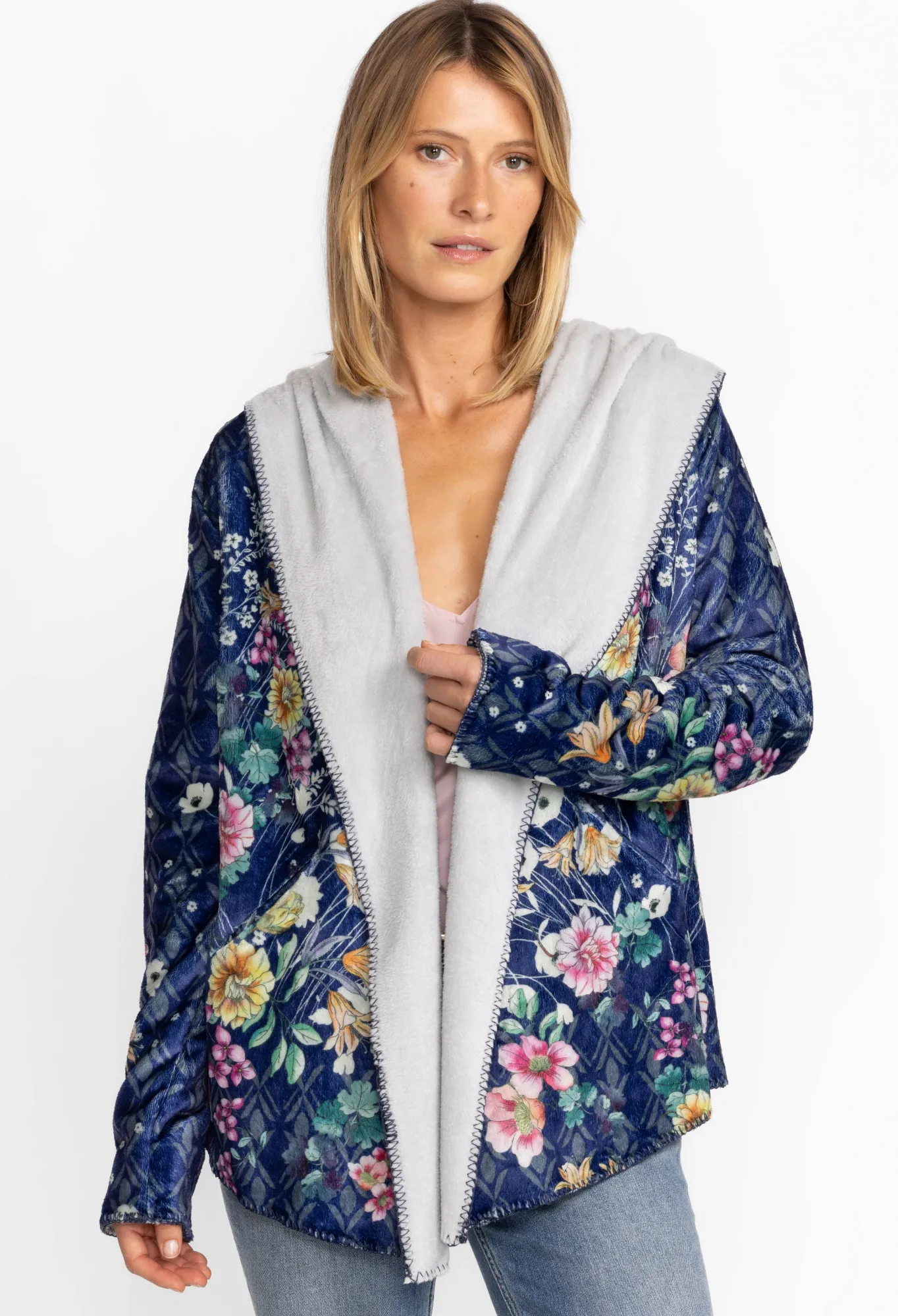 Crafted From A Soft, Insulating Material, The Bursting Echo Sherpa Jacket Lends A Fashion-Forward Touch To Practical Layering. Elevated By A Blossoming Floral Pattern In Bright Tones, This Jacket Features A Hood, Long Sleeves, And Blanket Stitch Detailing. Wear This Jacket Solo With A Tee Or Layer Under A Coat On Cooler Days.