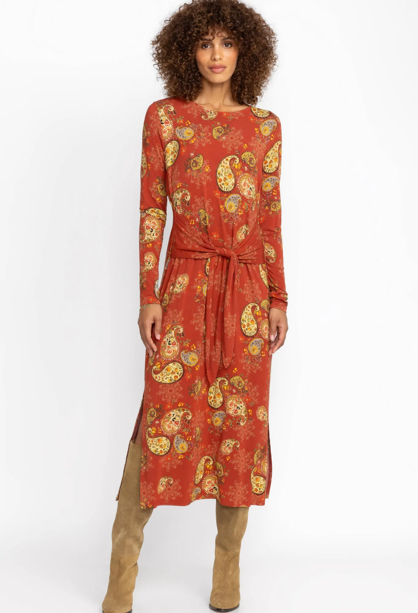 Channel Laid-Back Glamour This Season In The Elegant Paisley Lace Tie Front Knit Dress. Spun From A Soft Fabric With A Dash Of Stretch For Comfort, This Dress Features A Round Neck, Long Sleeves, And A Joyful Yellow Floral Pattern Throughout. Dress Down With Flats Or Make A Statement After Dark With Heels And Leather Extras.