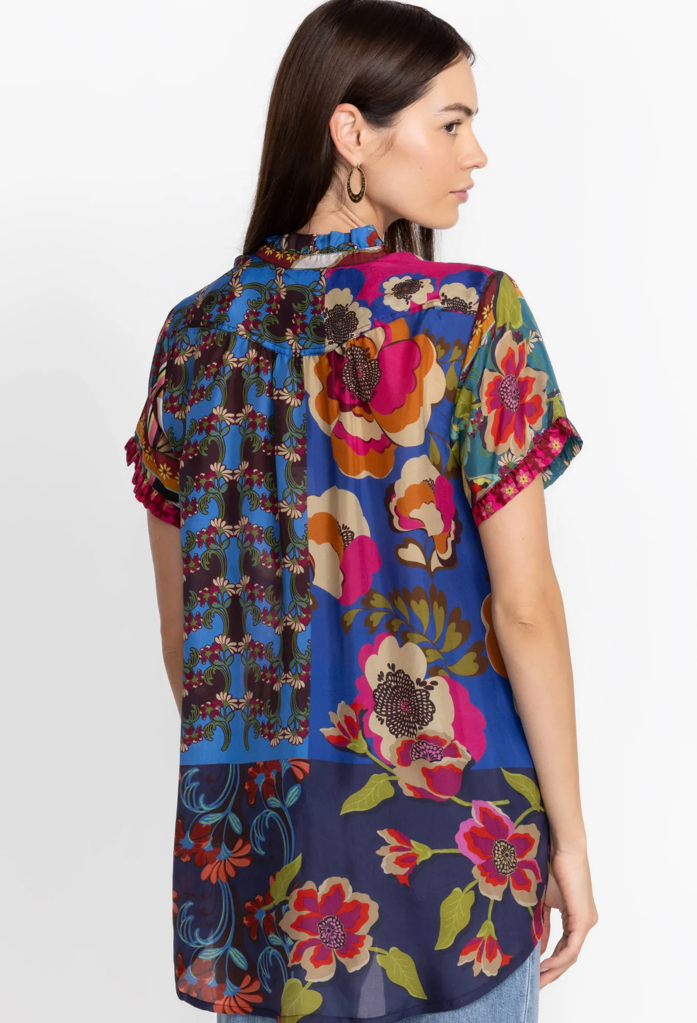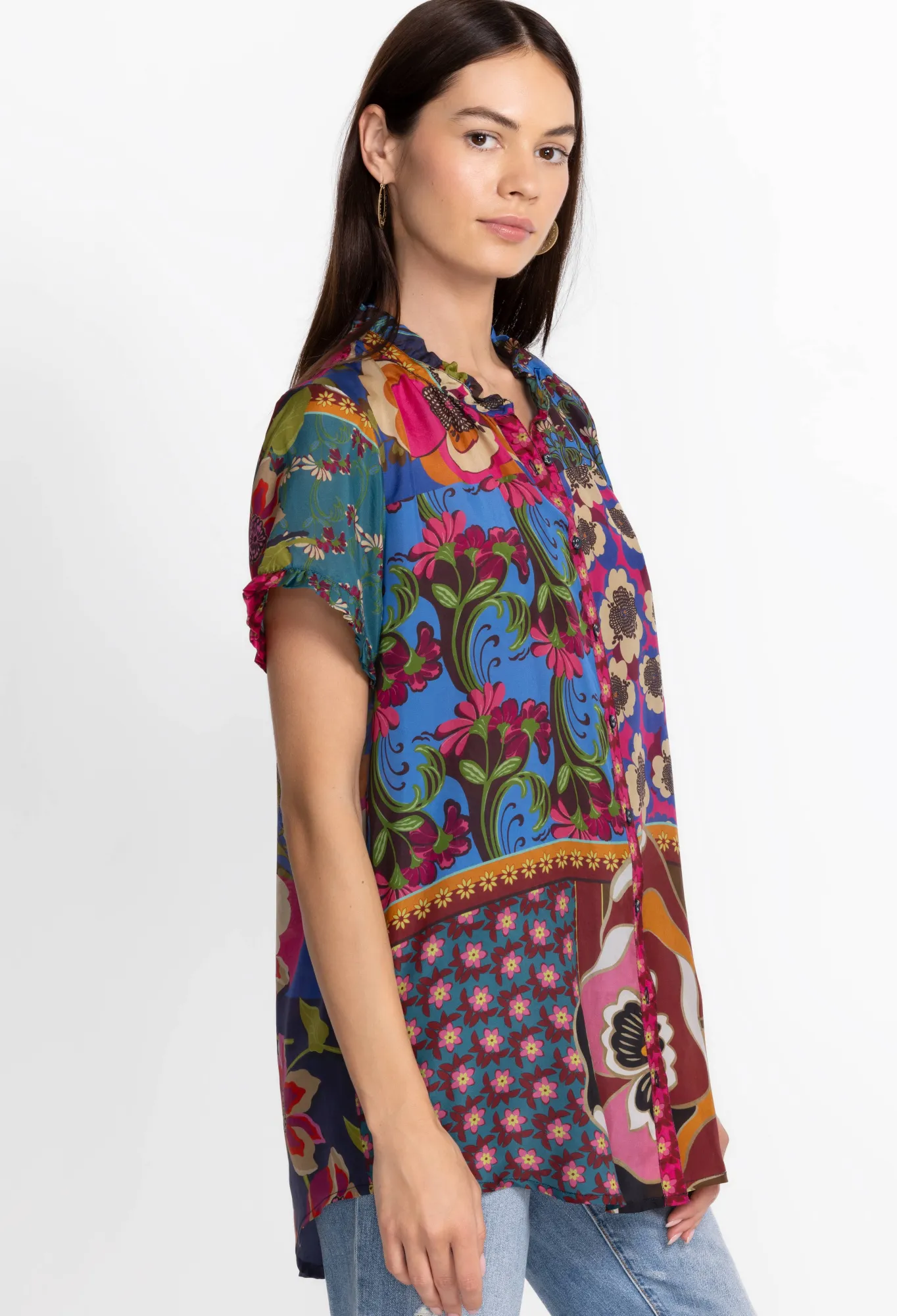 Spun From Lustrous Silk, The Promisino Zoli Tunic Takes Your New Season Looks In An Abstract Direction. Underpinned With An Artistic Flair, This Tunic Features A Front Button Closure, Short Sleeves, 70S-Inspired Floral Motifs, And A Ruffle Collar And Hem For An Opulent Touch. Wear This Tunic With Jeans And Gold-Tone Jewelry For A Vibrant Take On Daytime Dressing.