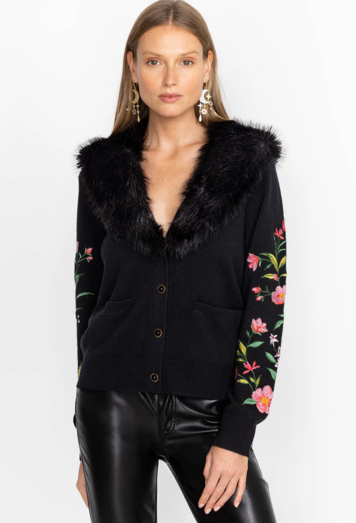 Designed From A Cozy Wool Cashmere Blend, The Vista Faux Fur Collar Cardigan Reworks A Functional Layer Into A Bold Statement Piece. Imagined In Black, This Cardigan Features A Button Front, Welt Pockets, A Lavish Faux Fur Collar, And Floral Embroidered Sleeves For A Femme Finish. Wear This Cardigan With Jeans During The Week And Dress Up With Silk Separates At The Weekend.