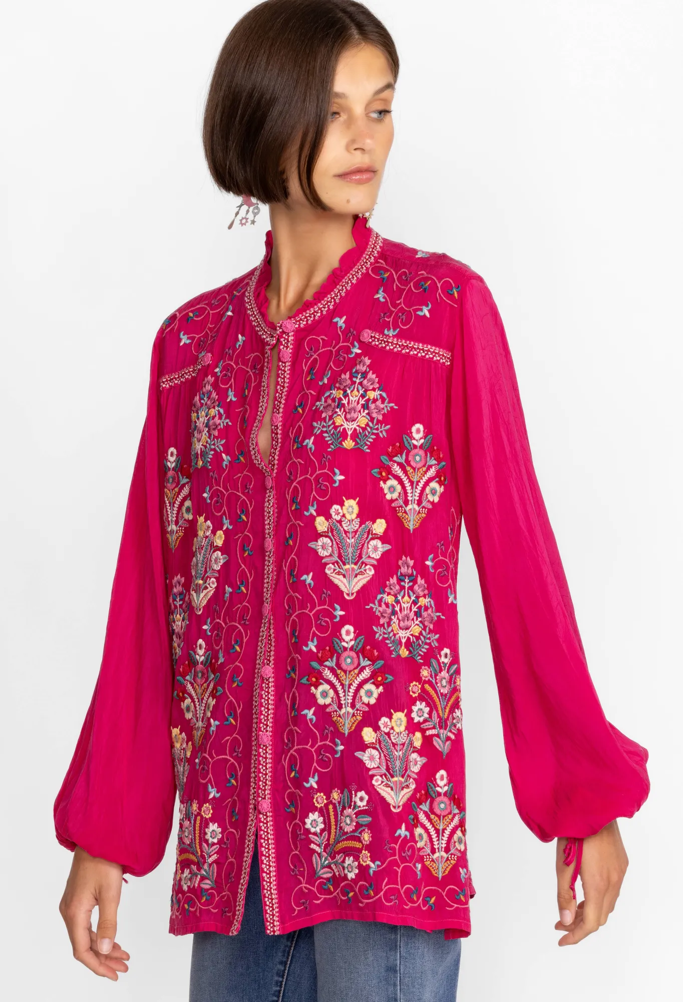 Presenting A Delightful Casual Wear Option, The Bertha Blouse Is An Endearing Combination Of Color And Design. Adorned With Bold Placement Embroidery And Featuring A Unique Drawstring Sleeve, This Beautiful Blouse Is The Perfect Way To Elevate Your Weekend Wardrobe. Pair With Dark Wash Jeans And Pointed Flats For An Elevated Casual Look.