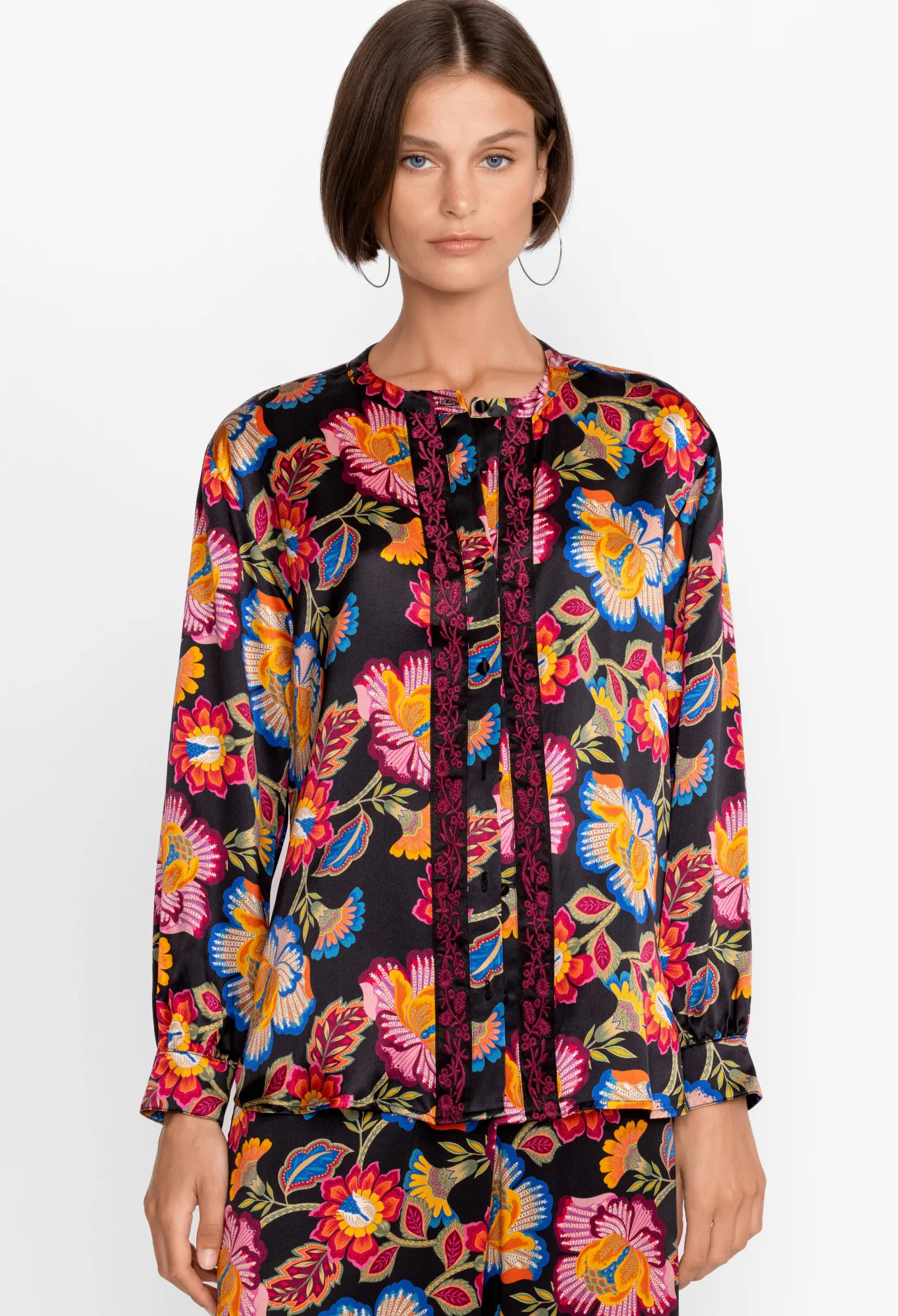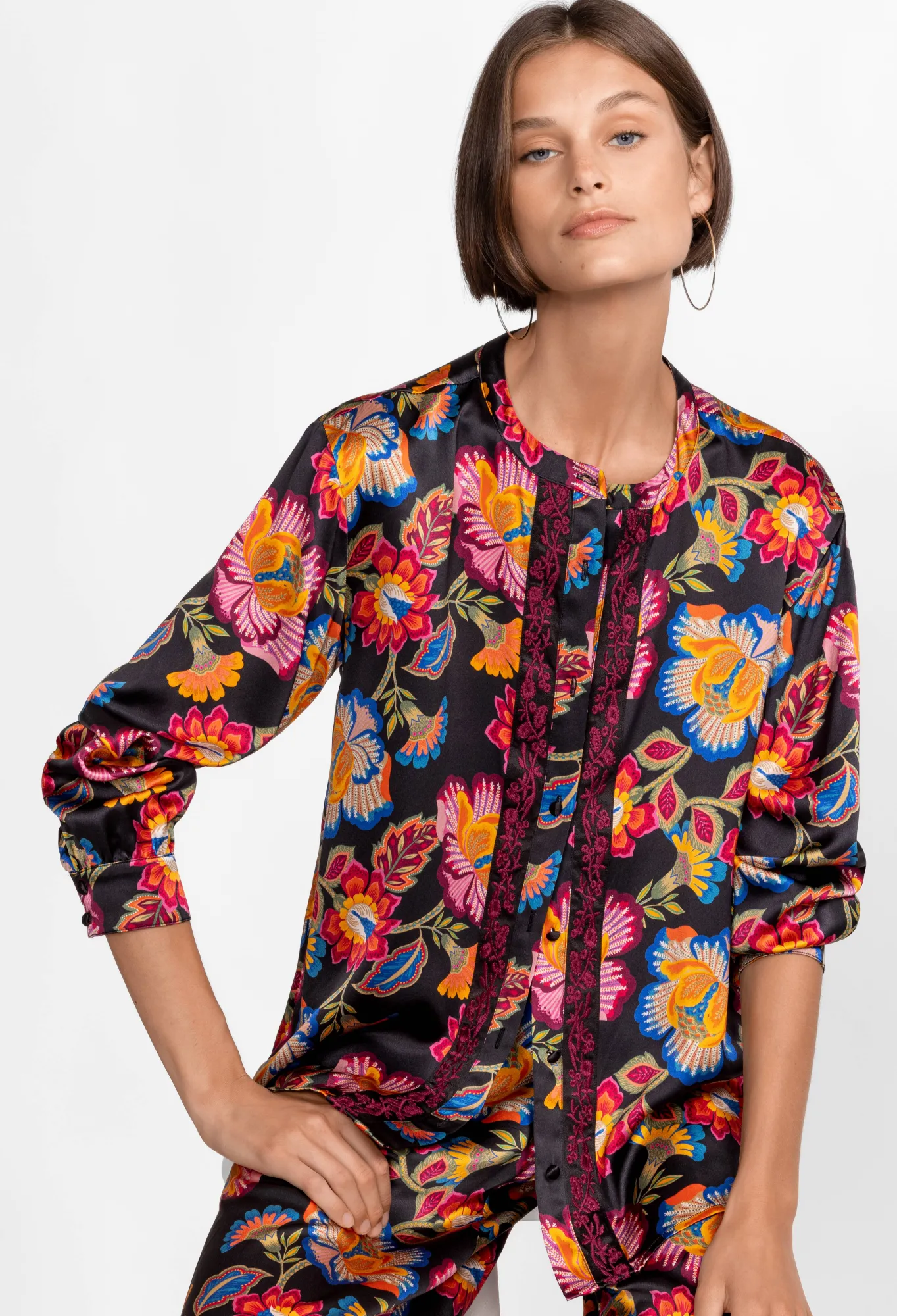 Underpinned With A Sense Of Nostalgia, The Sidonia Mandarin Button Down Shirt Elevates A Perennial Wardrobe Basic With Glamorous Detailing. Made From Fluid Silk, This Shirt Boasts Long Sleeves, A Collar, A Front Button Closure, Fabric Covered Buttons, And A Romantic Arrangement Of Fresh Blooms. For The Day, Pair This Shirt With Wide-Leg Pants, And For The Evening, Opt For A Midi Skirt And Low Heel.