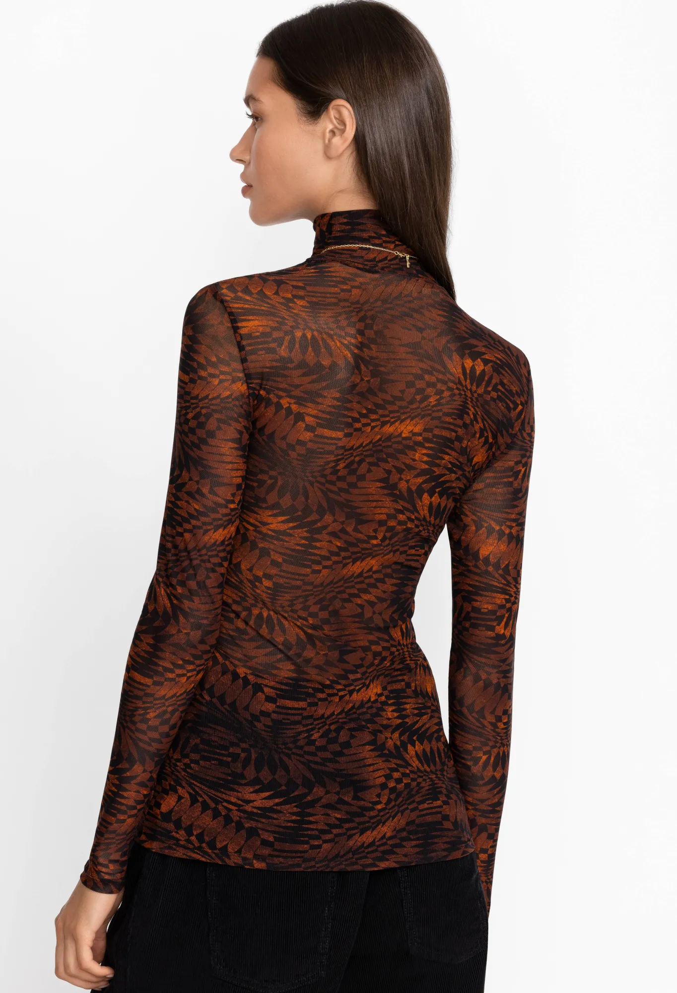 Ornately Detailed With A Warm Seasonal Print, The Loreto Mesh Tee Is A Statement In Elevated Casual Wear. Carefully Crafted With A Modest High Neck And Comfortable Long Sleeves For Additional Warmth In The Cooler Season. Pair With Dark Wash Denim And A Smart Blazer For A Polished Weekday Look.