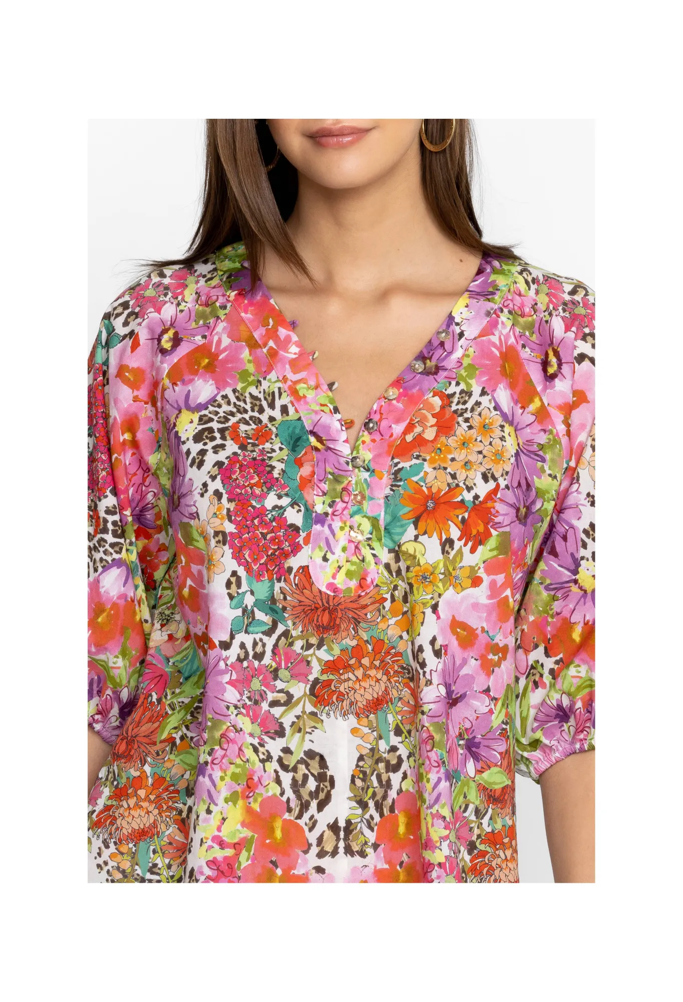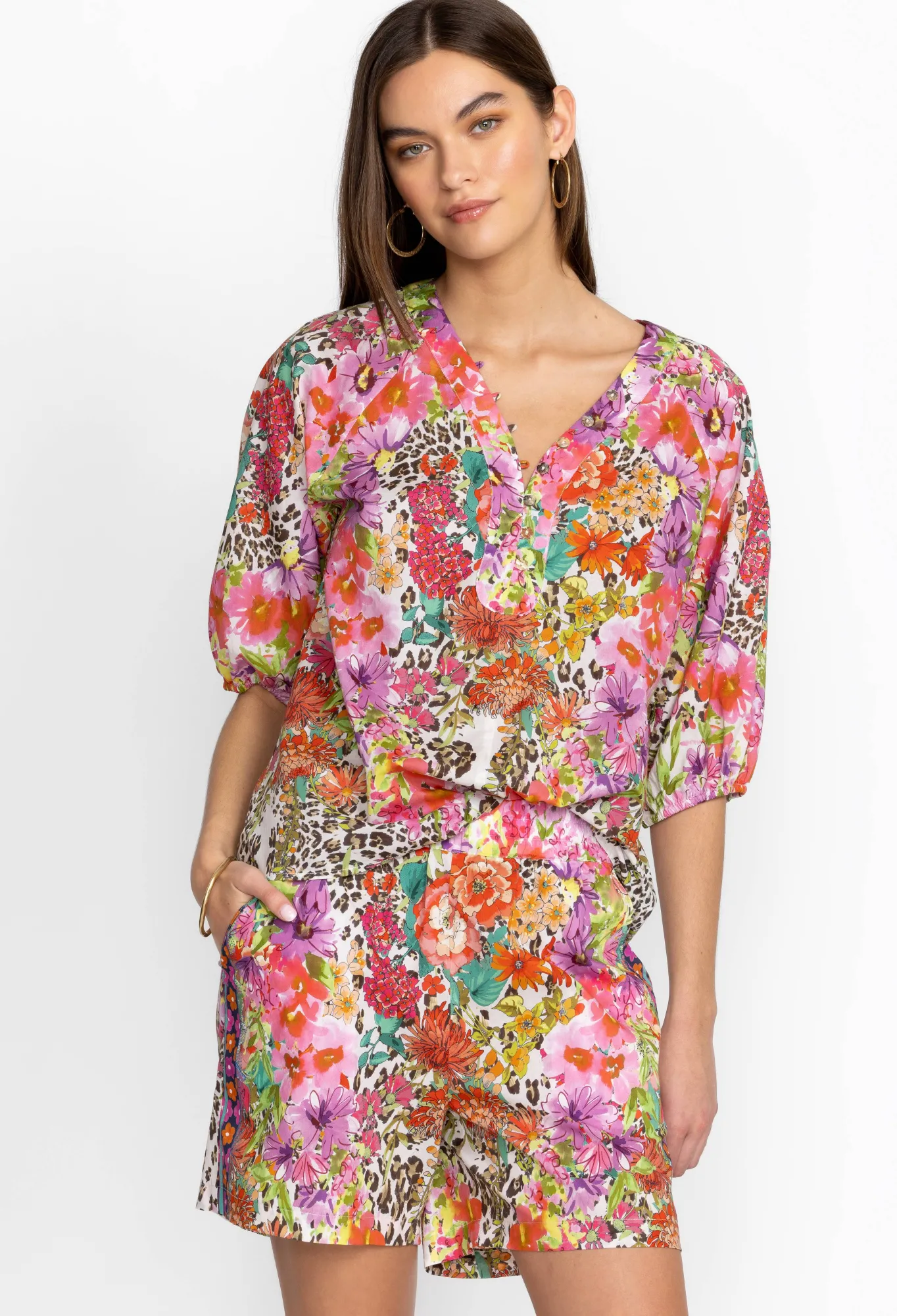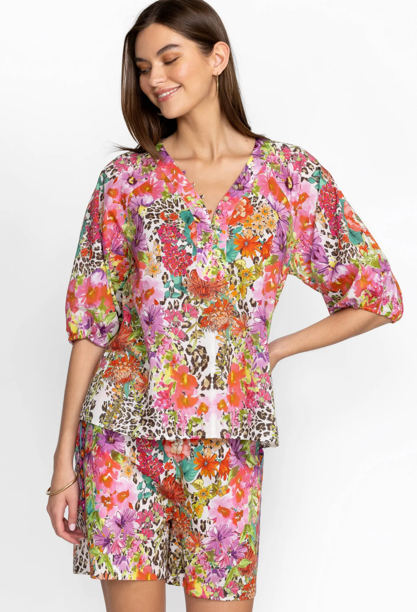 Instilled With Stylish Extravagance, The Wild Garden Puff Sleeve Button Front Blouse Is Defined With A Leopard Print That’s Unexpectedly Complemented With Flourishing Flowers. Made From Pure Cotton, This Blouse Features A Front Button Closure And Puff Sleeves With Elastic Cuffs For Added Volume. Style With Denim Or Pair With The Matching Shorts For A Chic Warm-Weather Outfit.