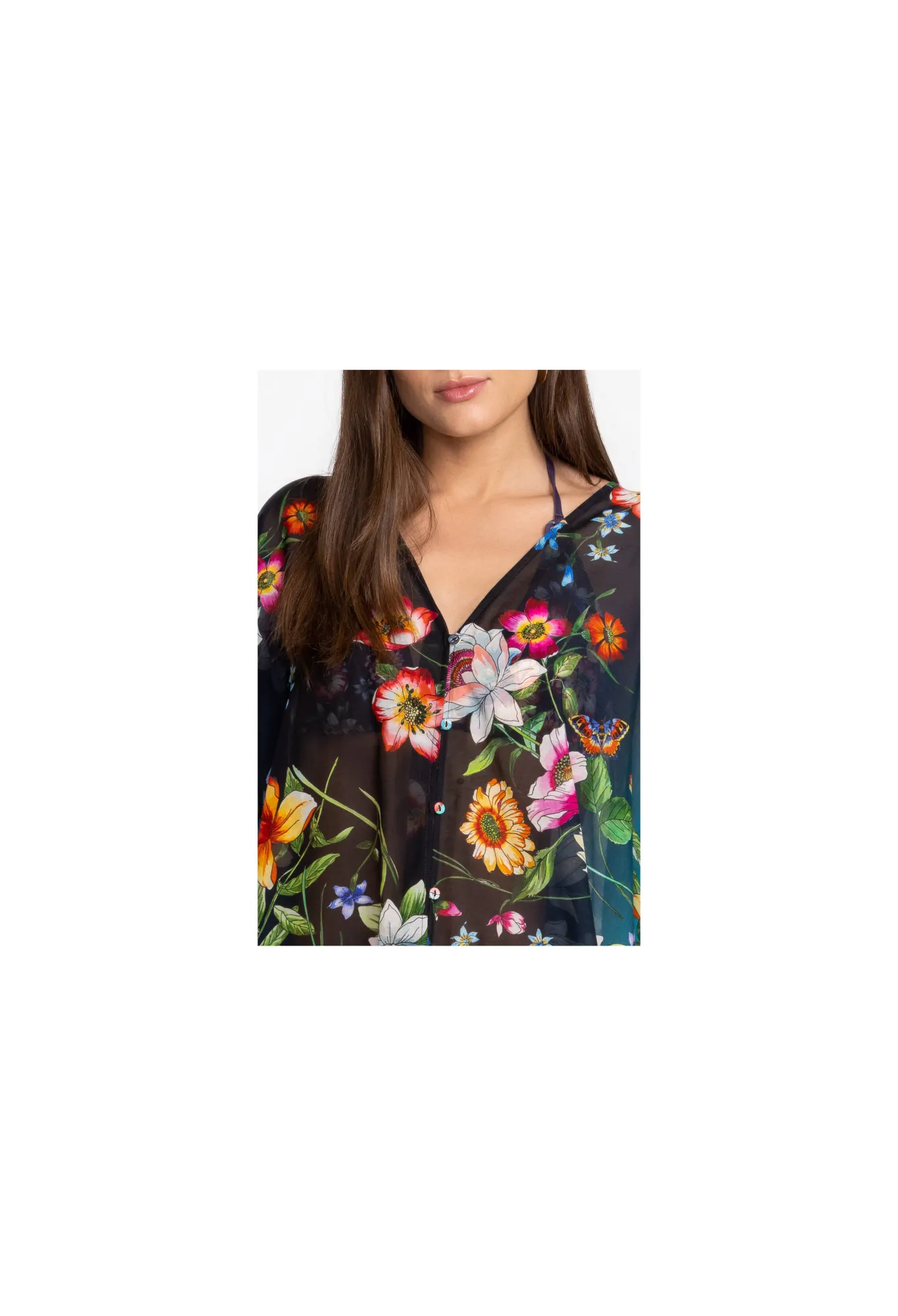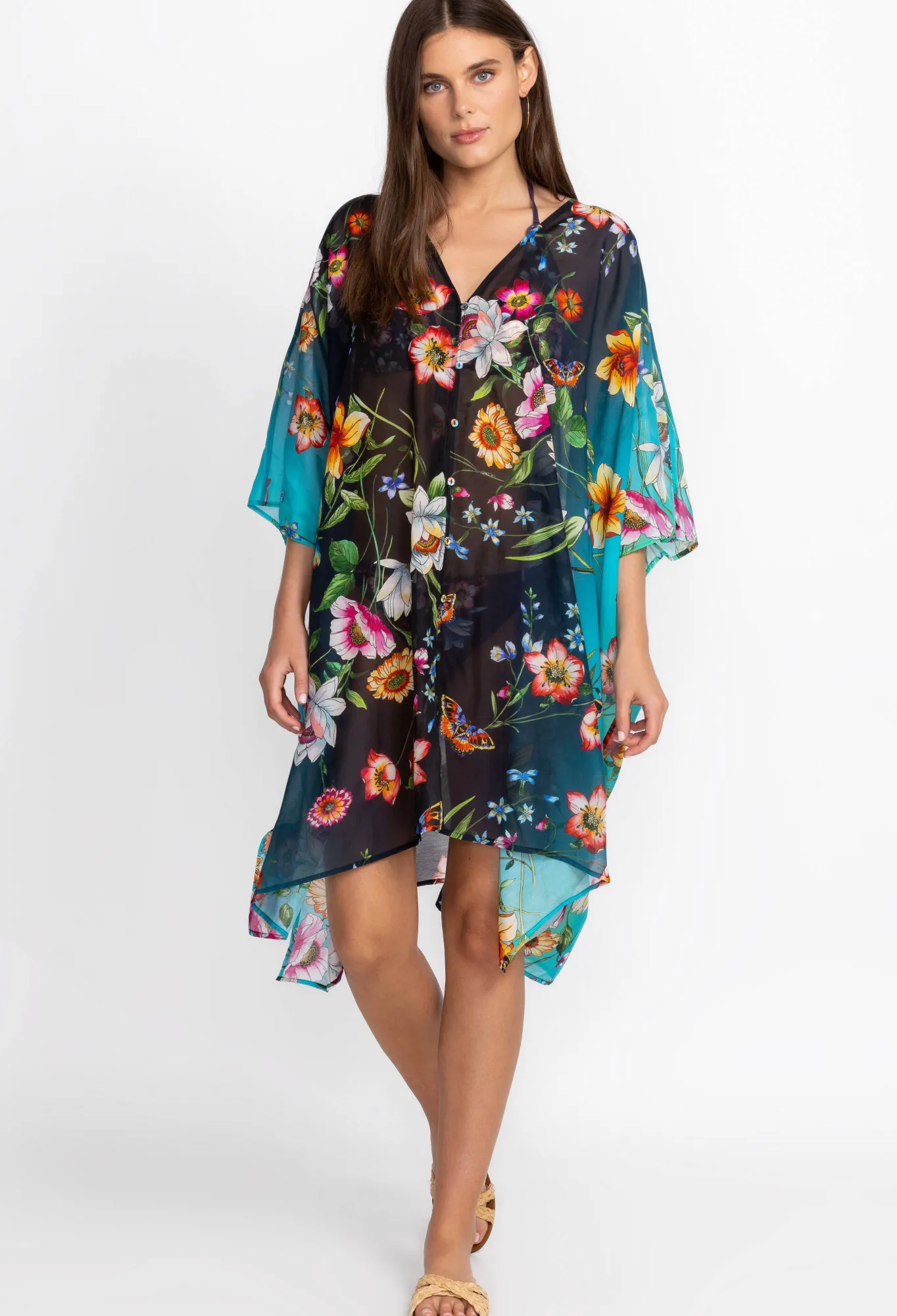 Equal Parts Captivating And Classic, The Ombre Garden Short Kimono Adopts A Free-Flowing Cut That’s Perfect For Warmer Climes. This Kimono Is Designed From A Luxe Cotton Silk Blend And Boasts A Flattering V-Neck, Long Sleeves, And Sprouting Blooms Throughout In A Beautiful Selection Of Colors. Style Over Swimwear And Sign Off The Look With Sandals Or Slides.