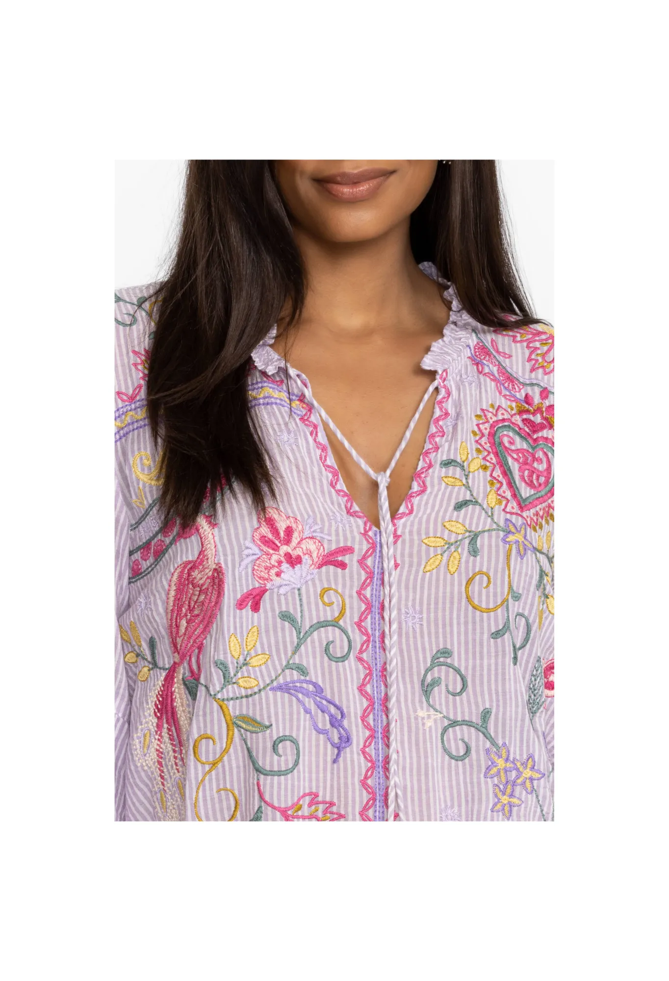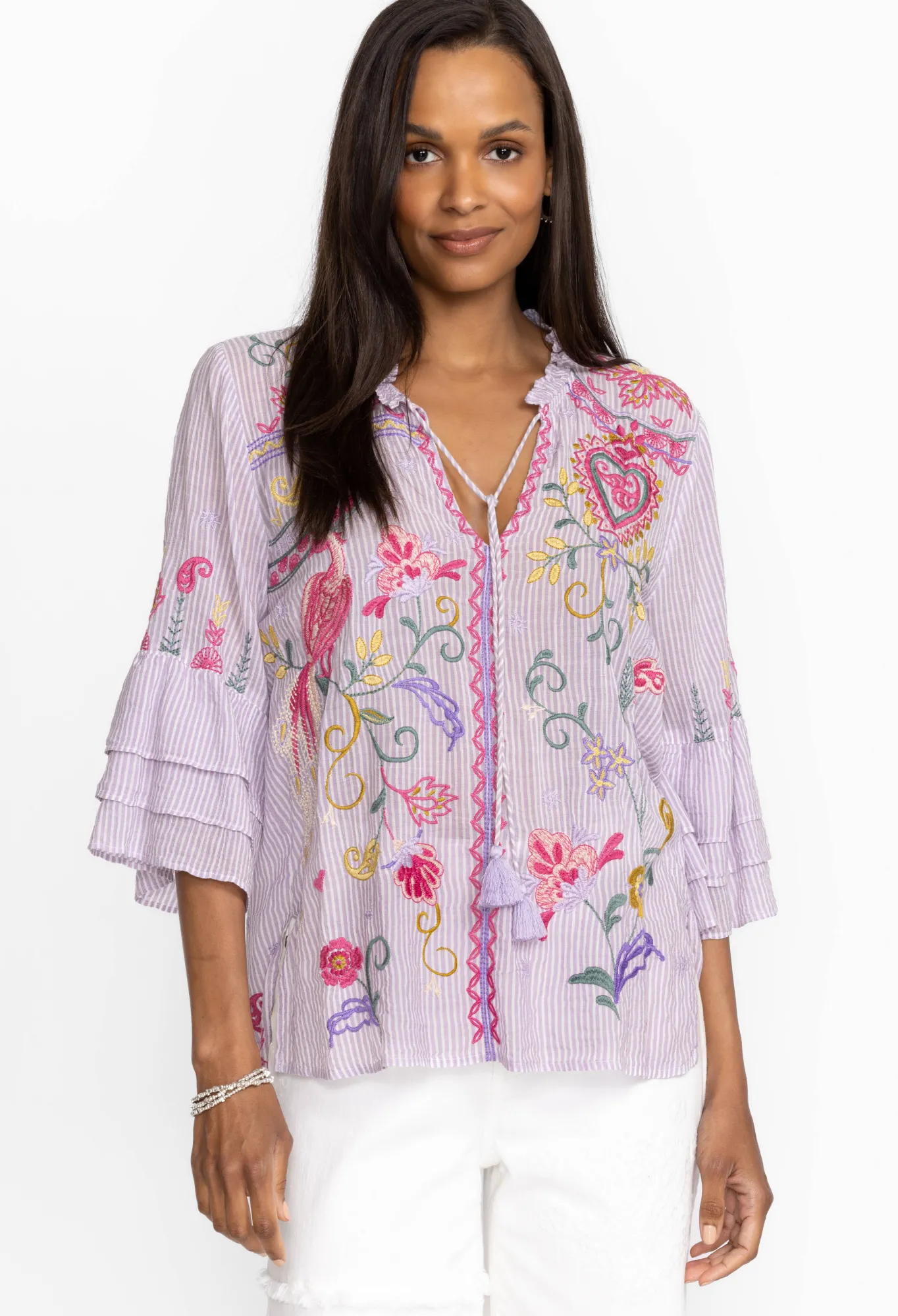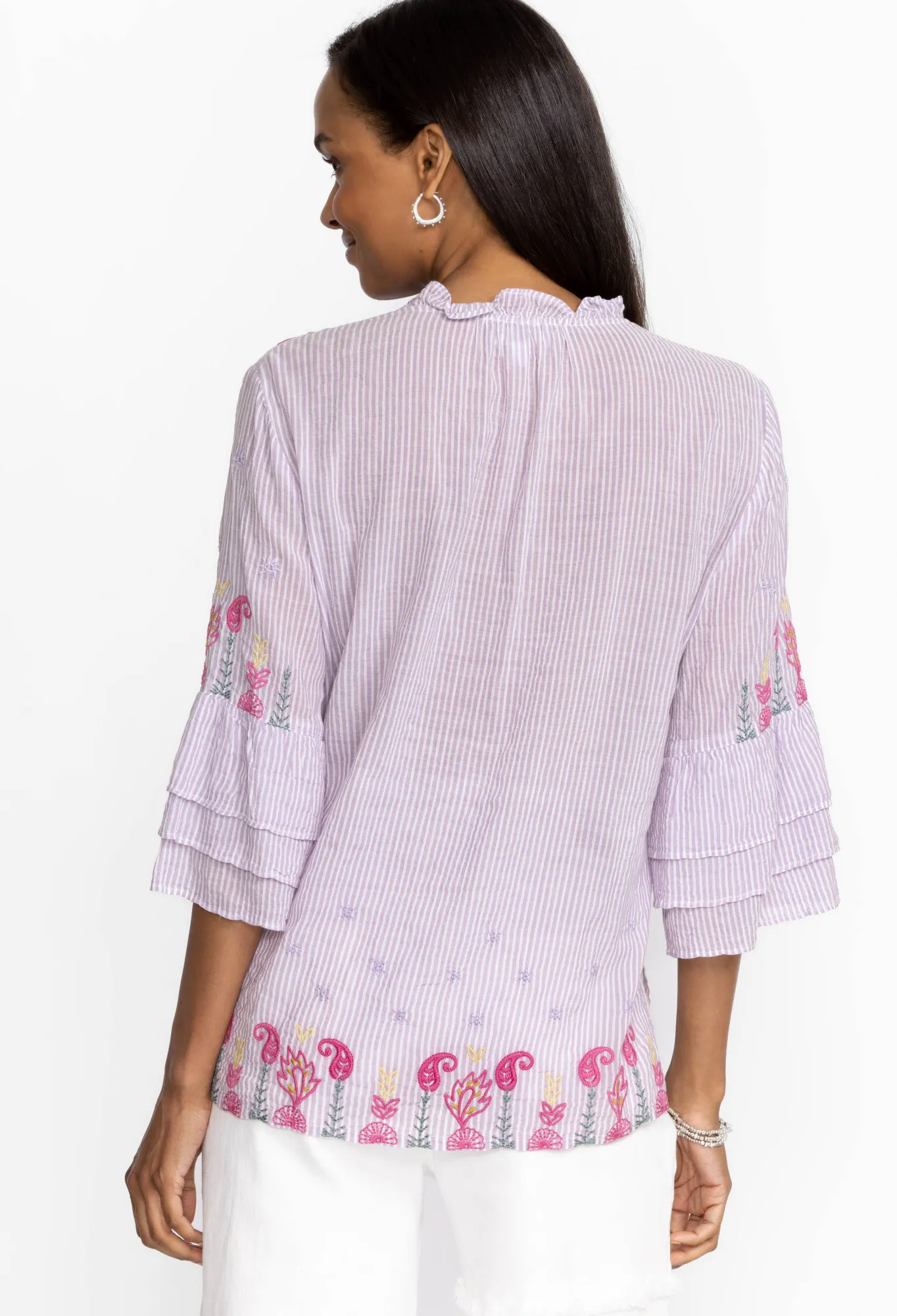Conjuring Up Images Of Rolling Hills Dotted With Vibrant Flowers, The Ashlee Ruffle Sleeve Blouse Transports You To Another Place. Beautifully Embroidered Details And Delicate Ruffles Create A Romantic Vision That Can Easily Elevate Your Wardrobe. Pair This Blouse With Denim Trousers Or A Sleek Skirt For A Style That Transcends.