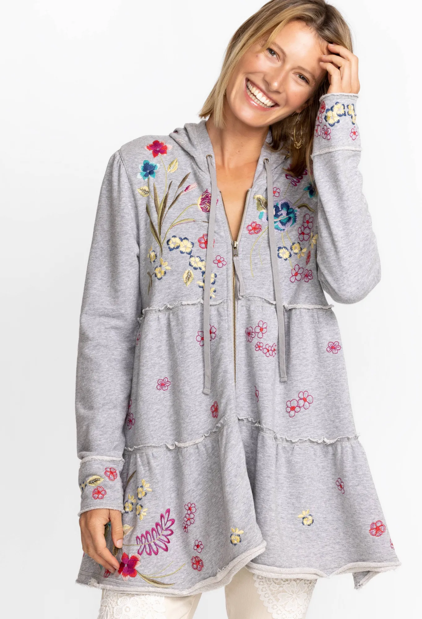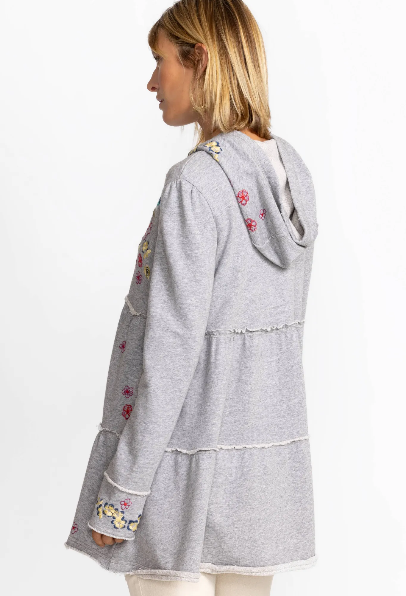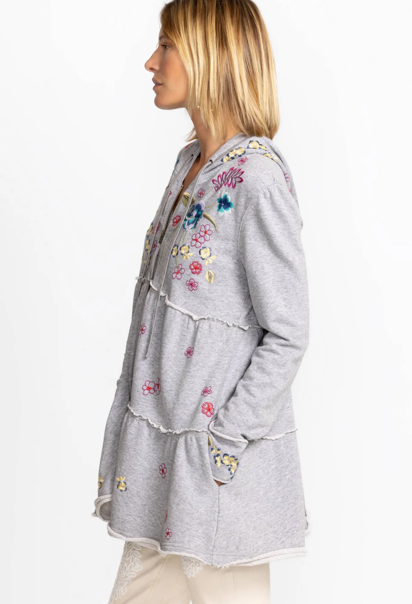 Casual Sportswear With An Air Of Sophistication, The Jessi Tiered Hoodie Adds An Elegant Touch To Your Athletic Apparel. Crafted From Cotton And Embellished With Colorful Placement Embroidery, This Tiered Hoodie Is Finished With A Cozy Drawstring Hood. Pair With Leggings And Sneakers For A Workout-Ready Look.