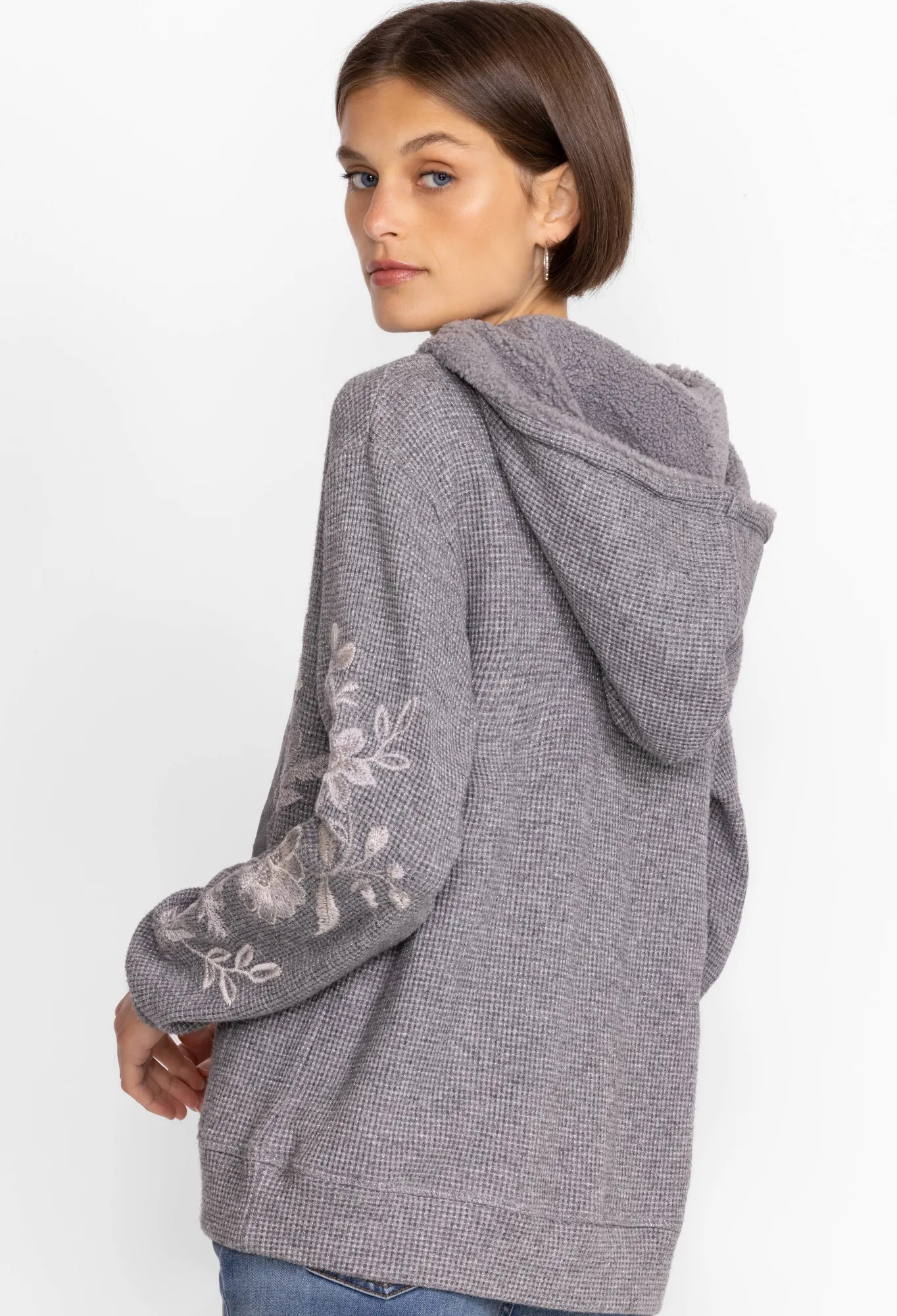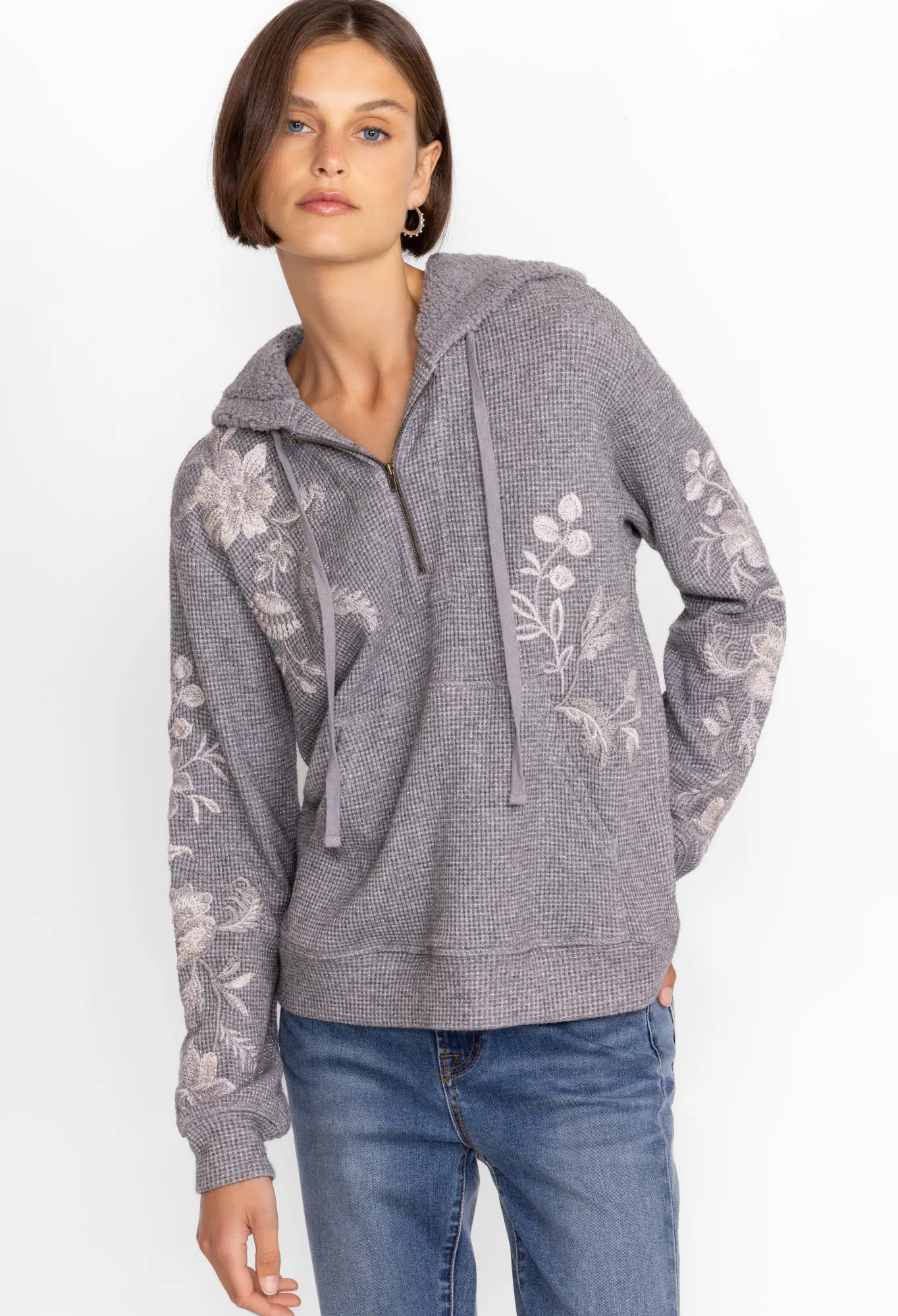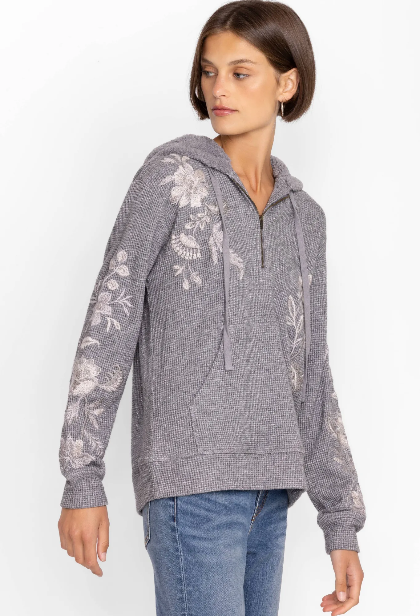 Delivering A Cozy Option For Cooler Days, The Junie Metallic Thermal Hoodie Offers A Glittering Take On Elevated Casual Wear. Expertly Detailed With Delicate Floral Embroidery, This Comfortable Half-Zip Pullover Features A Front Patch Pocket And Attached Hood With Drawstring. Pair With Relaxed Denim And Ankle Boots For A Cozy Cold-Weather Option.