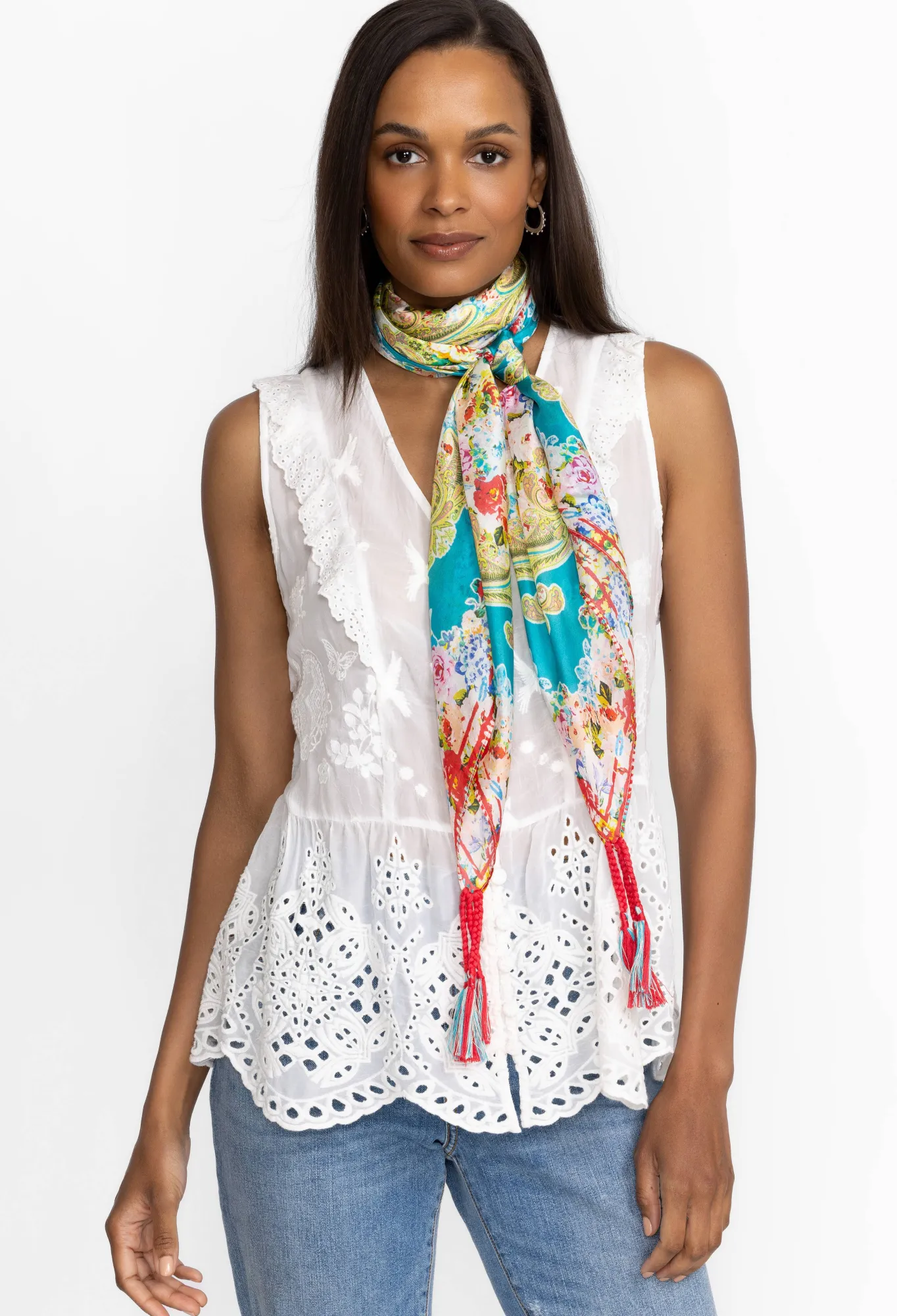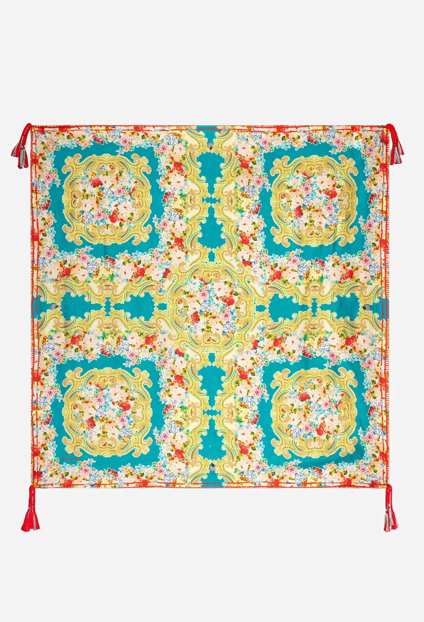 Spun From Smooth Silk, This Rivoray Scarf Adopts A Mesmerizing Kaleidoscopic Design, Transforming A Timeless Staple Into An Eye-Catching Must-Have. Elegant And Classic, This Scarf Is Punctuated With A Repeated Floral Pattern In Blue, White, Red, And Pink Tones, And Features Tassels At The Corners For A Fanciful Finish. Tie This Scarf Around The Neck And Pair With A Dress For A Ladylike Ensemble.