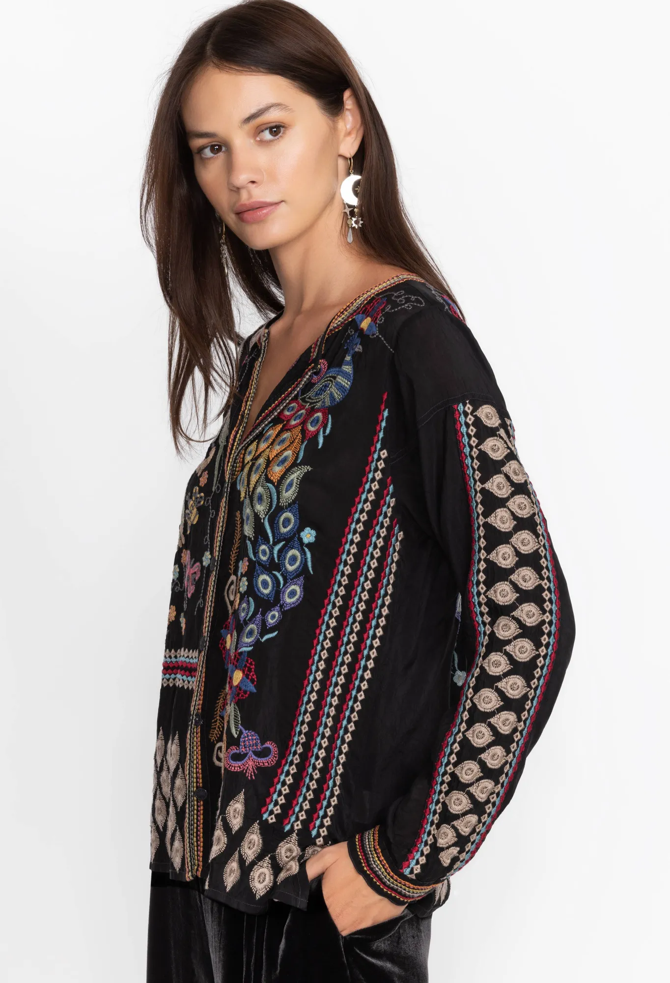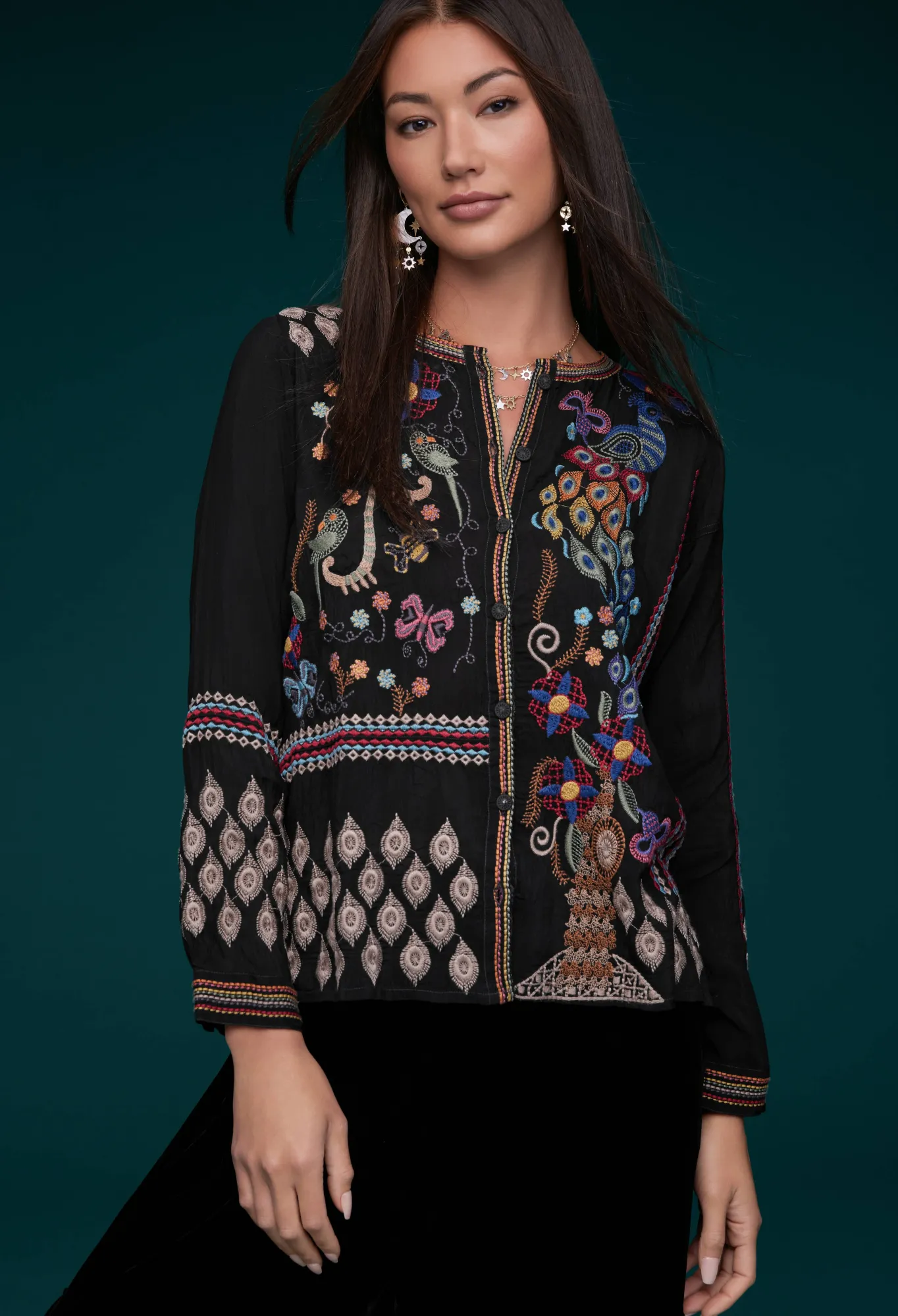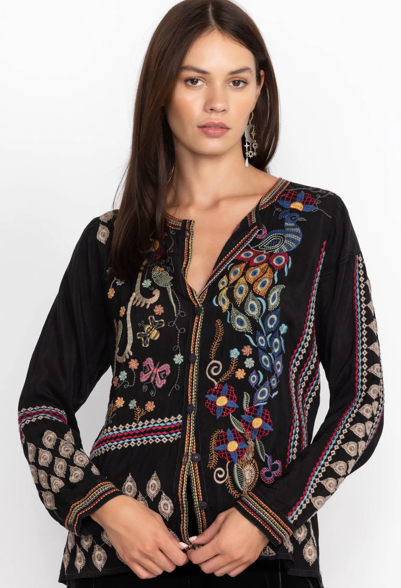 Infusing Your Wardrobe With An Irresistible Blend Of Bohemian Chic And Chic Elegance, The Rio Blouse Stands As A Quality-Crafted Go-To Piece. Exquisitely Adorned With Intricate Placement Embroidery, This Woven Button-Front Top Elevates Any Look With A Touch Of Refinement. For A Uniquely Timeless Look, Pair With Comfortable Denim And Stylish Flats.