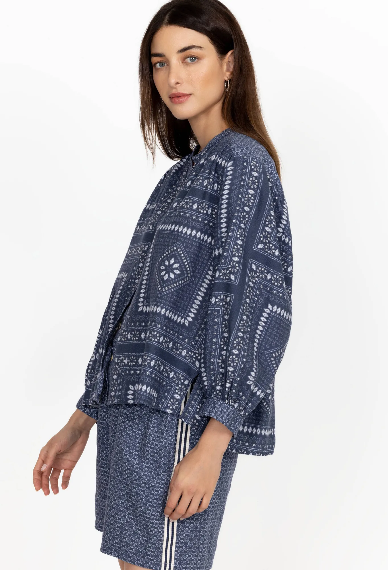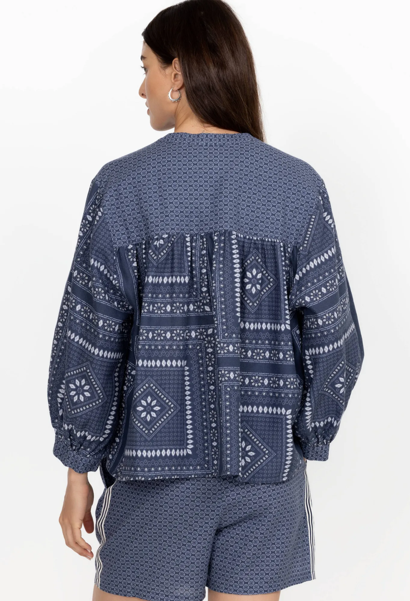 The Patched Ikat Shirred Yoke Blouse Conveys A Free-Spirited Charm Thanks To Its Bohemian Aesthetic And Laid-Back Design. This Blouse Is Made From Pure Linen, A Practical Fabric For Warm Days, And Features A Collar, Long Sleeves, And Shell Buttons At The Front. Style With The Matching Shorts For A Coordinated Warm-Weather Outfit.